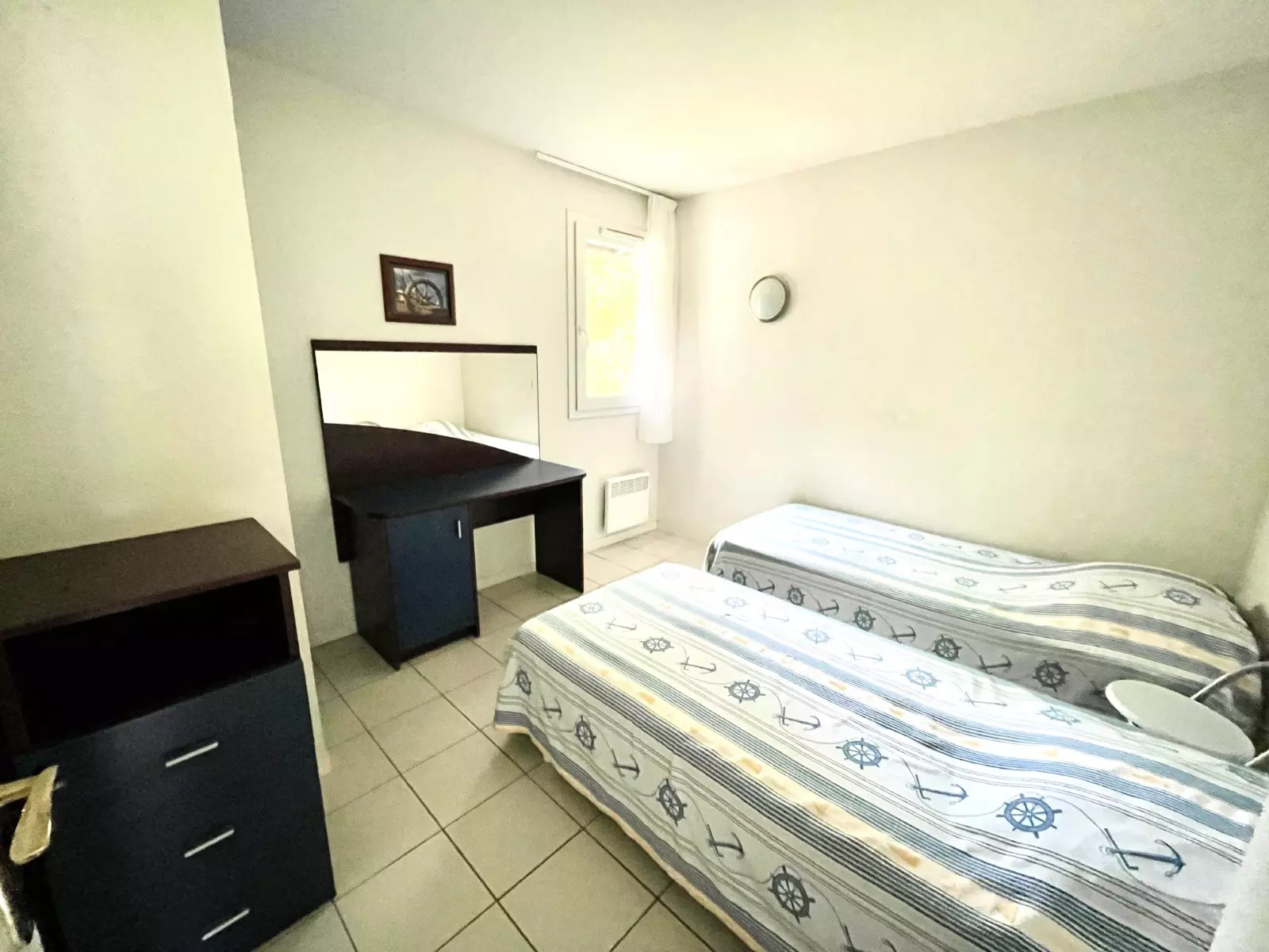 Une chambre avec 2 lits en 90cm avec un placard.