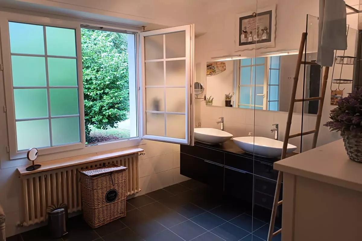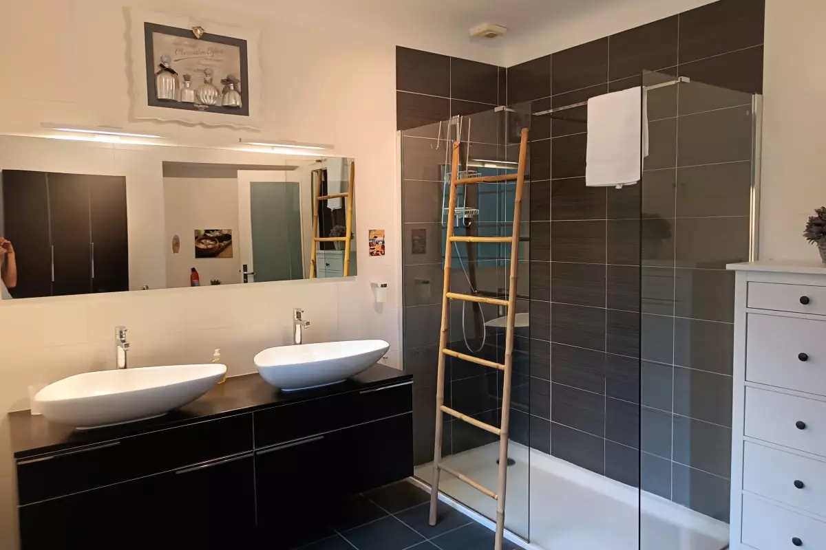 Les équipements suivants seront à votre disposition : WiFi, Parking, Machine à Café, Lave-vaisselle, Four, Micro-ondes, Télévision, Fer à repasser, Sèche-cheveux, Lave-linge, Sèche-linge, Chauffage, Réfrigérateur, Ventilateur, Plancha. Il est à noter que le logement est composé d'une maison et de deux dépendances. Seule la maison est équipée des 2 salles de douche et des 2 WC,