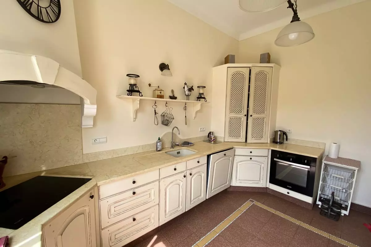 Divisée en 2, vous bénéficiez de 140m2 habitable sur 2 niveaux. Elle est composée au premier niveau d'un hall d'entrée, d'une grande cuisine entièrement équipée de style provençal, d'un salon – salle à manger de 40m2 qui permettra de tous vous réunir, comprenant un canapé lit qui pourra servir de lit d'appoint pour 2 autres personnes, ainsi qu'un WC indépendant.