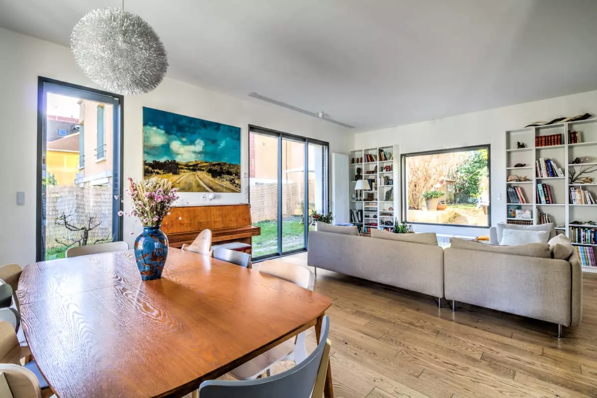 • un grand espace de vie ouvert et très lumineux comprenant un salon et un espace salle à manger,