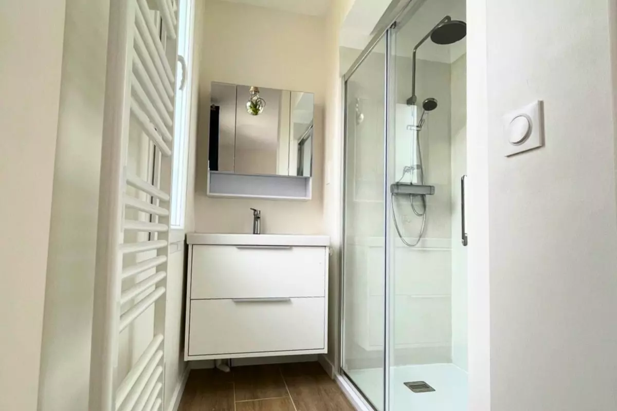 • une première chambre avec un confortable lit queen size (160cm) et une salle de bain attenante avec douche,