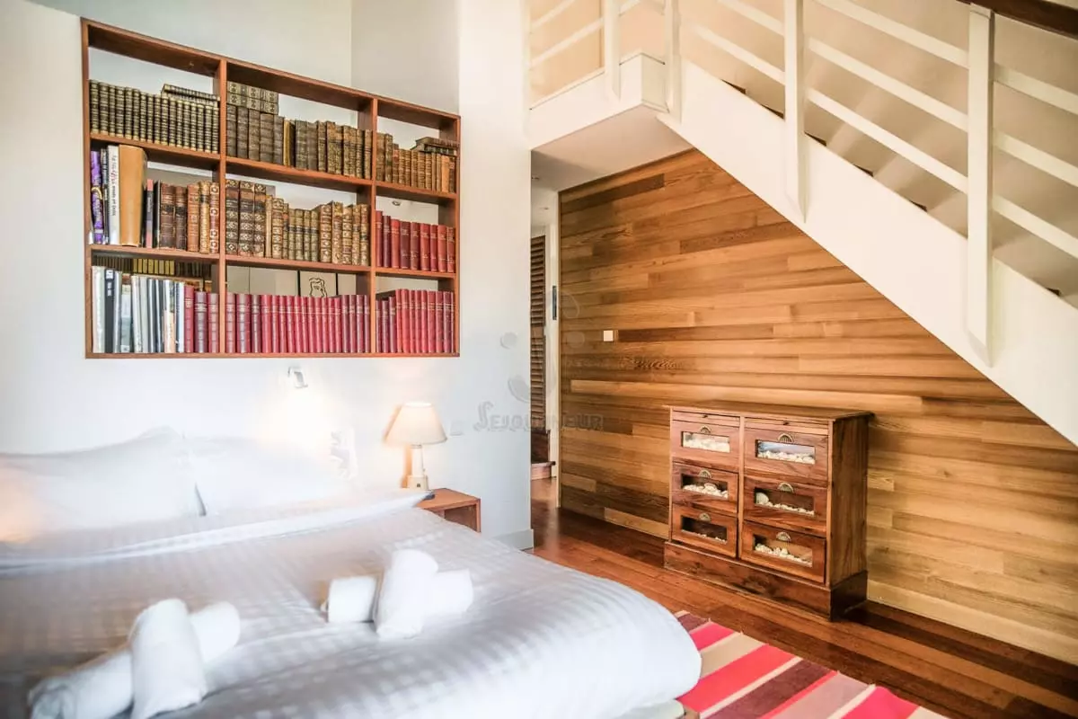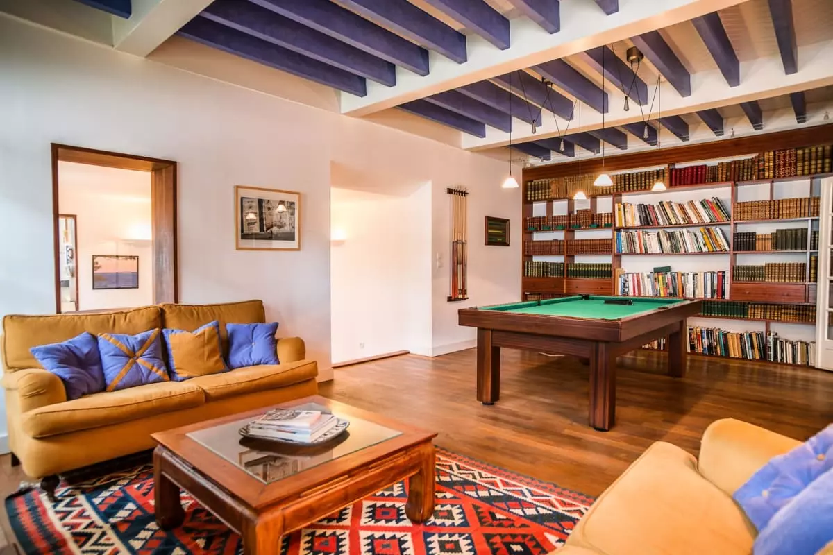 Sur le même palier vous pourrez profiter d'une belle salle de détente avec un salon-lecture doté d'une cheminée, d'un superbe billard pour s'amuser ainsi que d'une majestueuse bibliothèque.