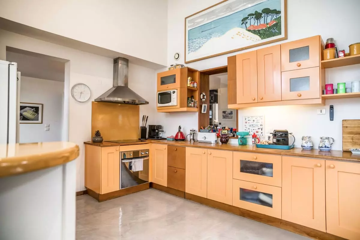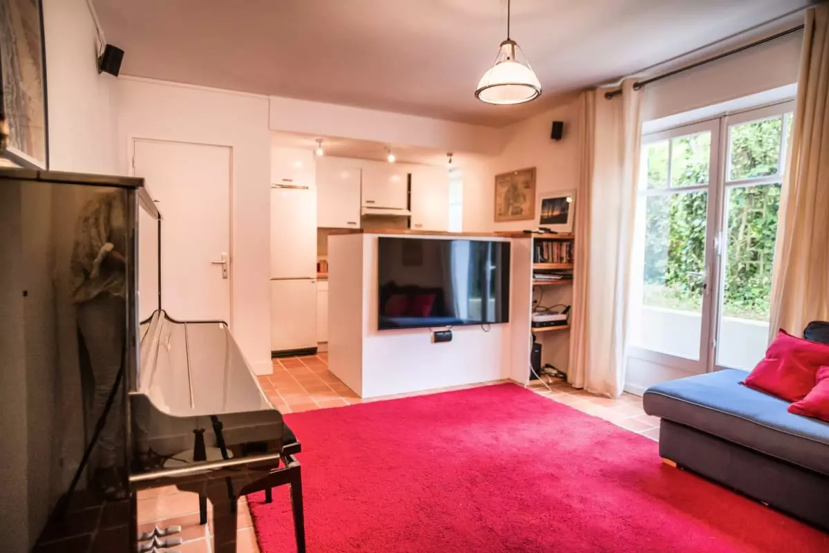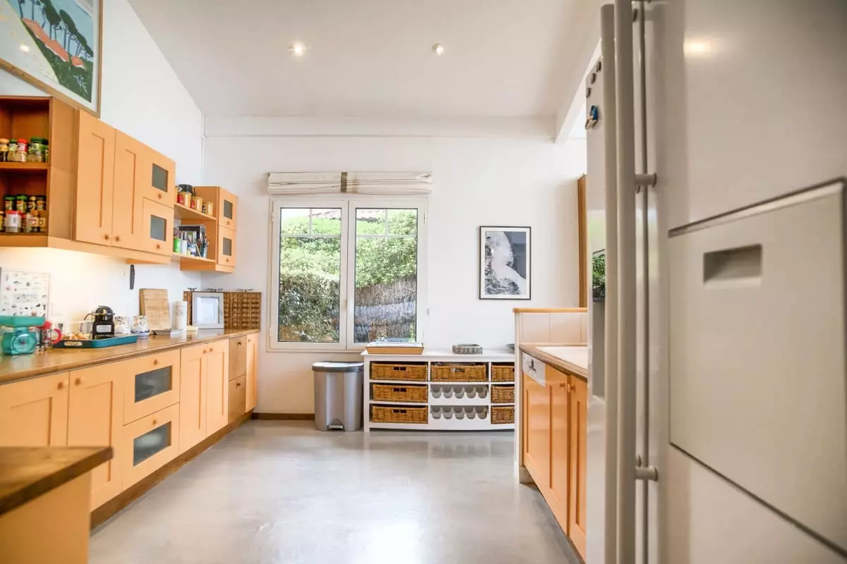 Une seconde cuisine avec un four et salle de détente/télé avec un grand canapé pour des soirées films !