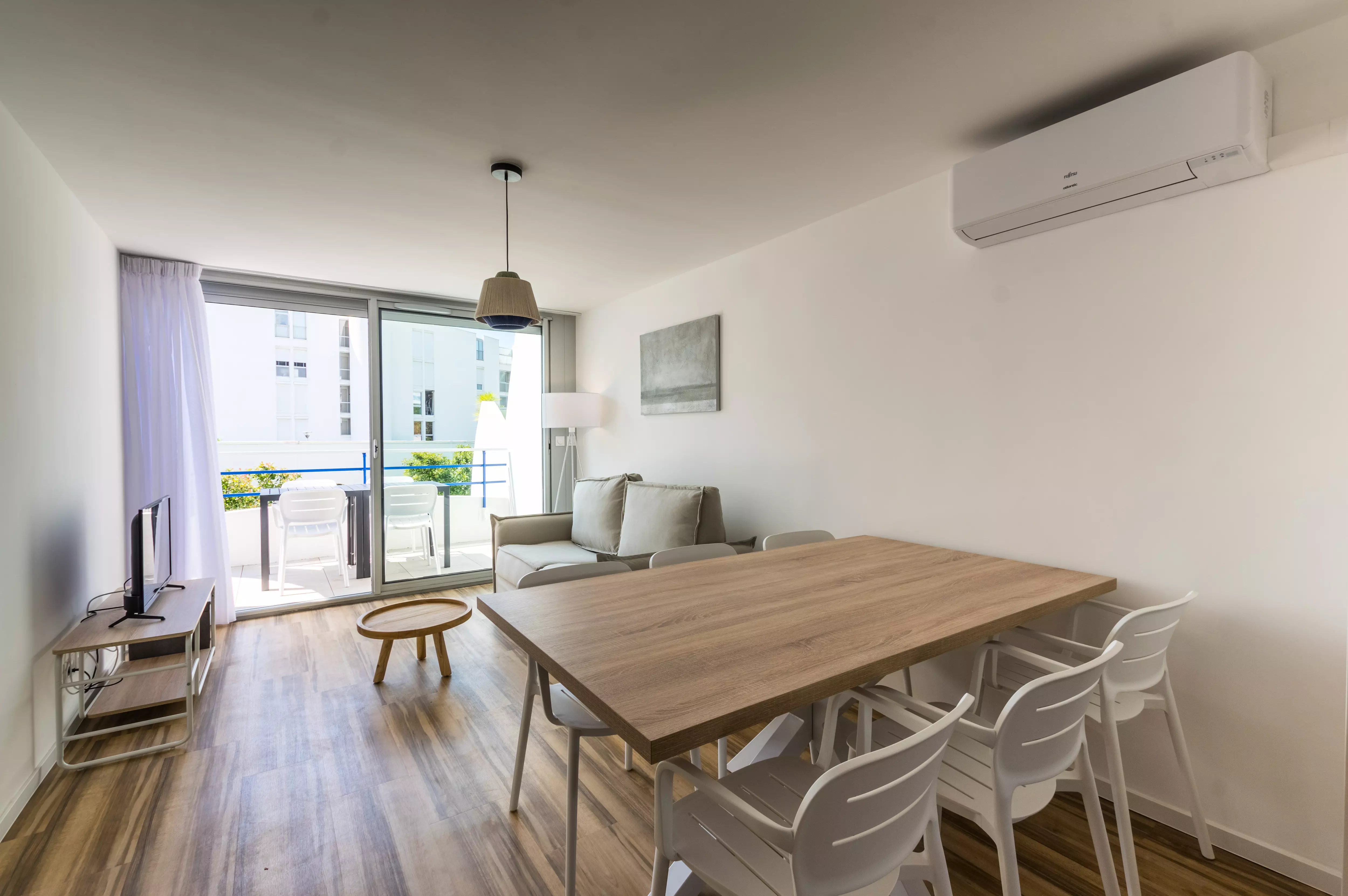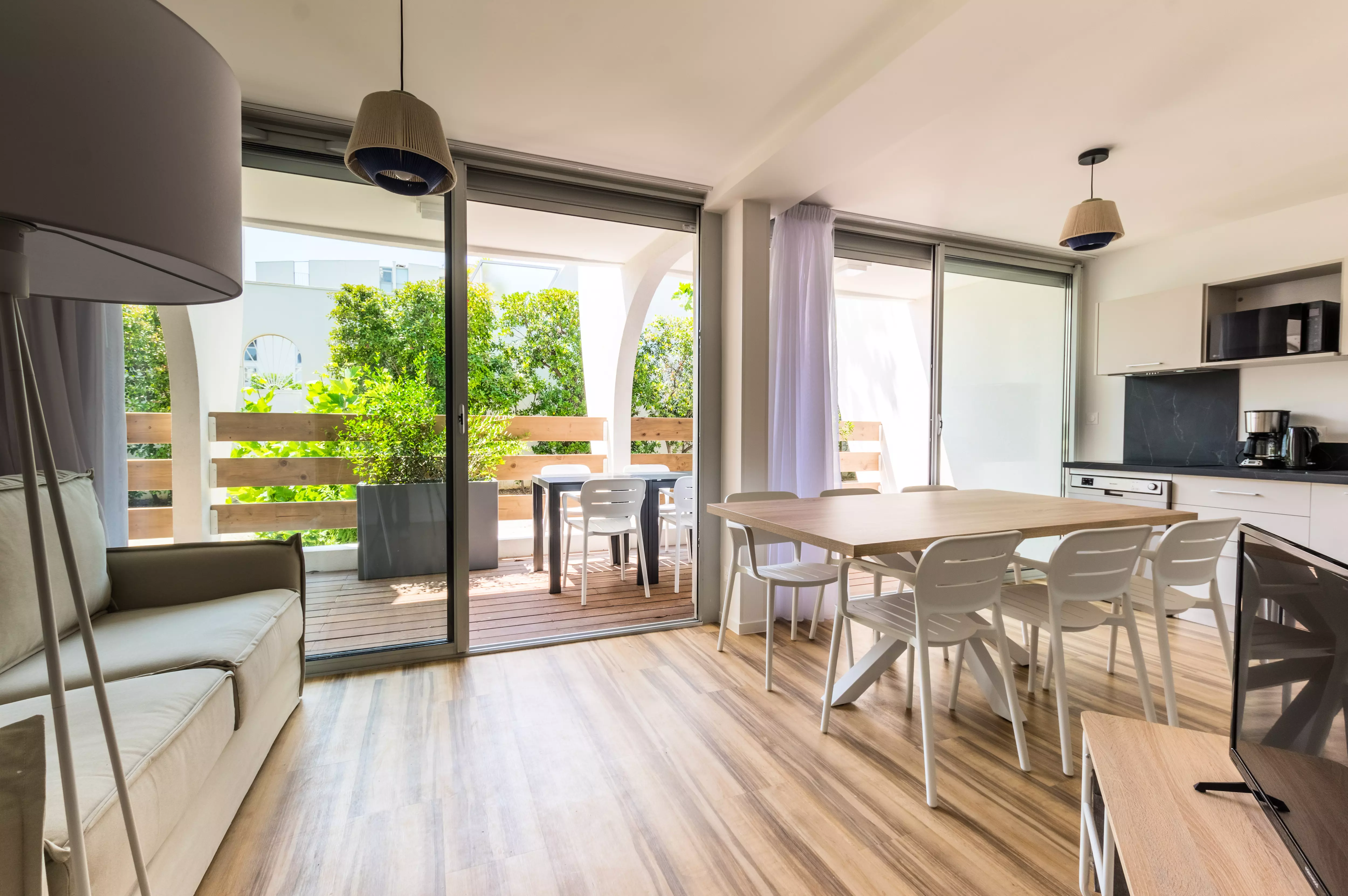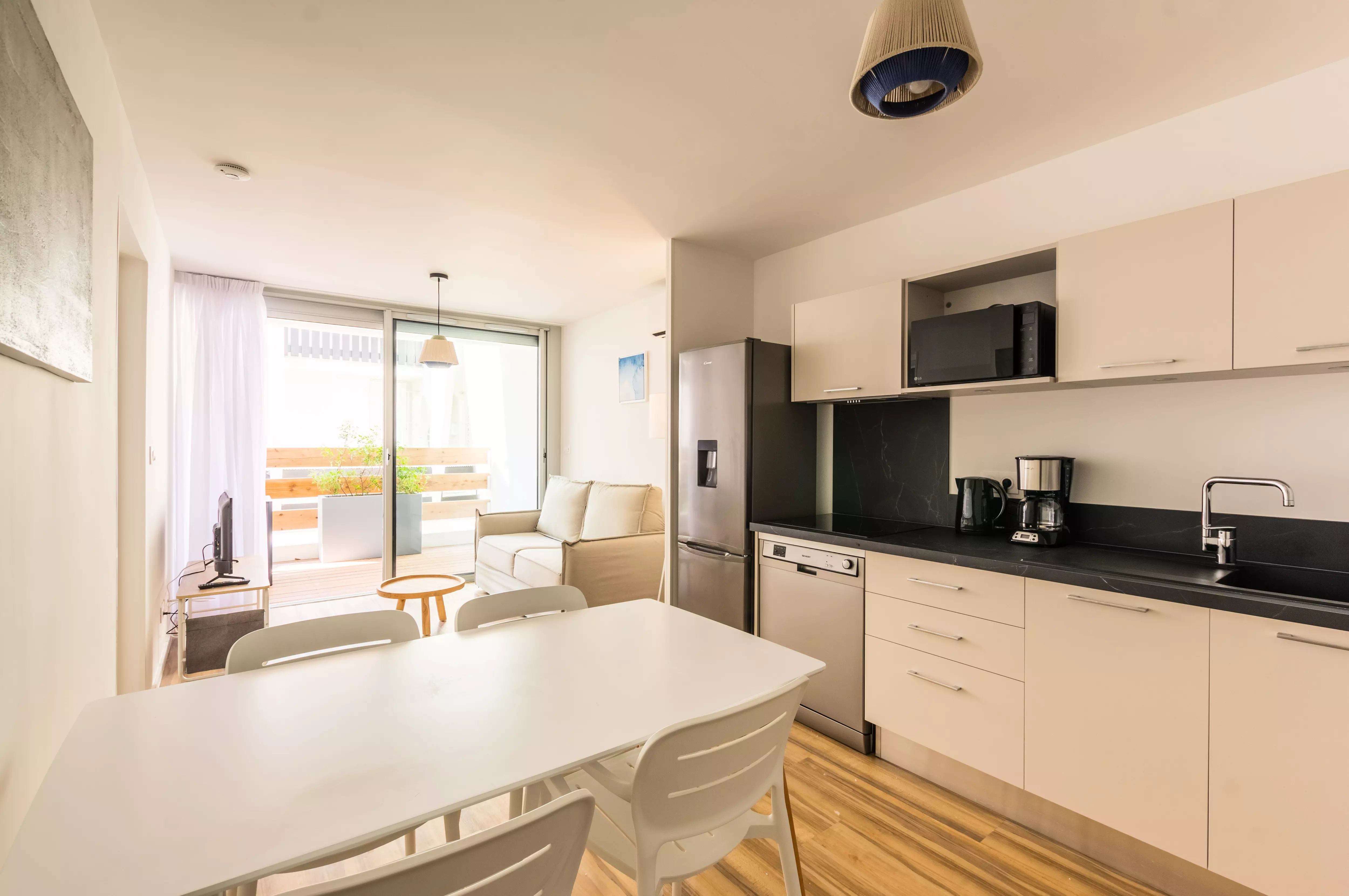Le logement est équipé de la climatisation, du chauffage, d'un accès Wifi, d'une télévision, d'un réfrigérateur, d'un four micro-ondes, d'un lave-vaisselle, d'une cafetière, d'une bouilloire, d'un sèche-cheveux ainsi que de mobilier de jardin sur la terrasse.
