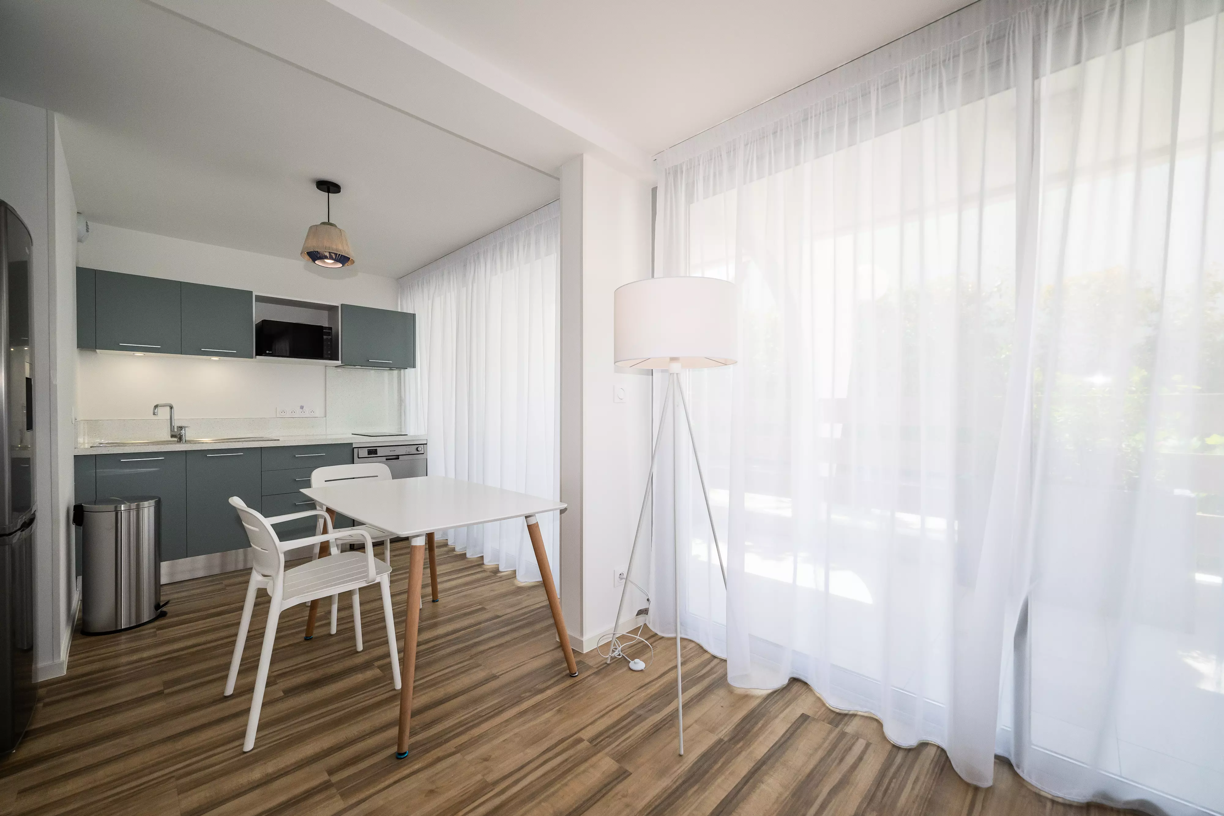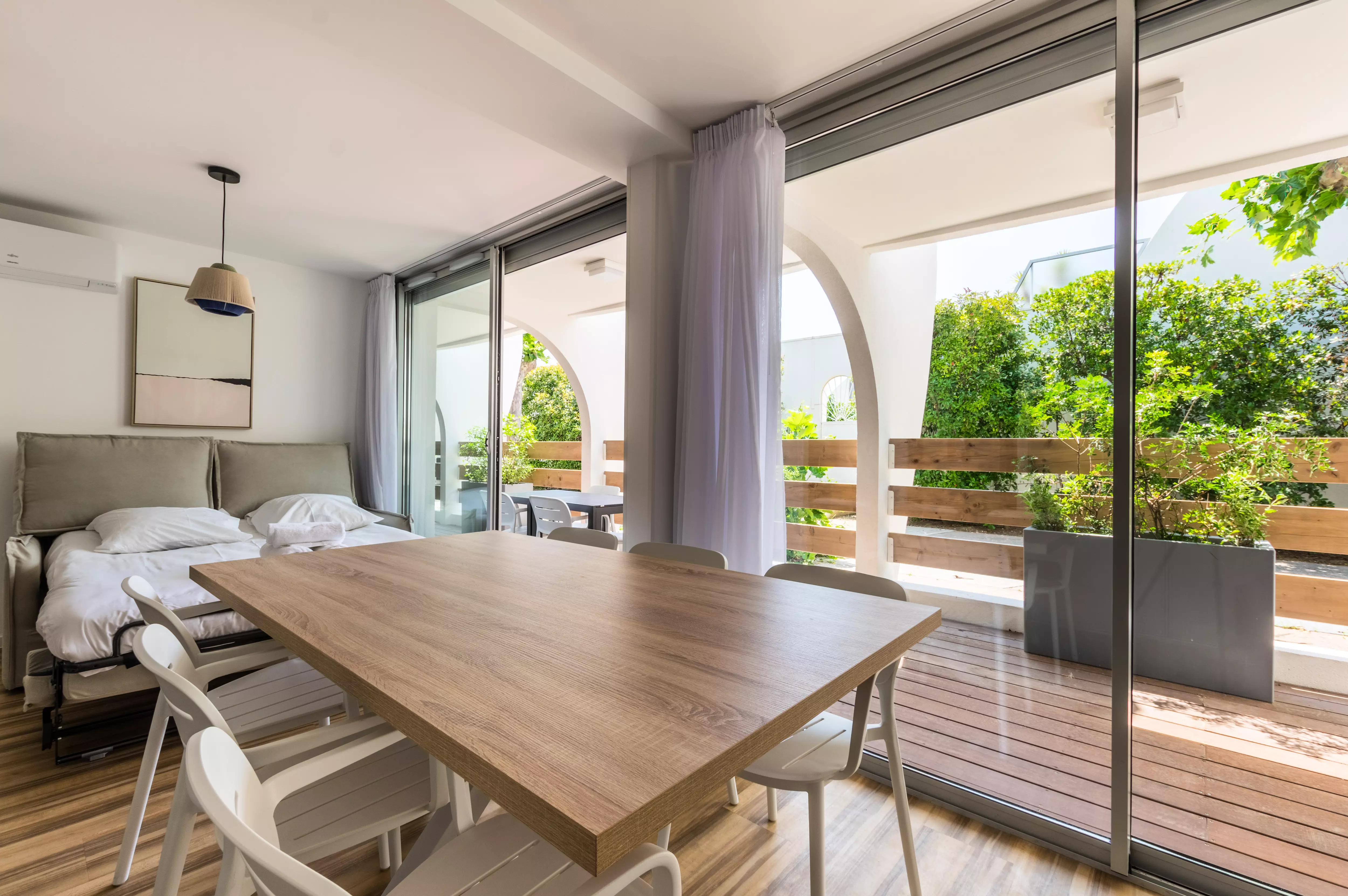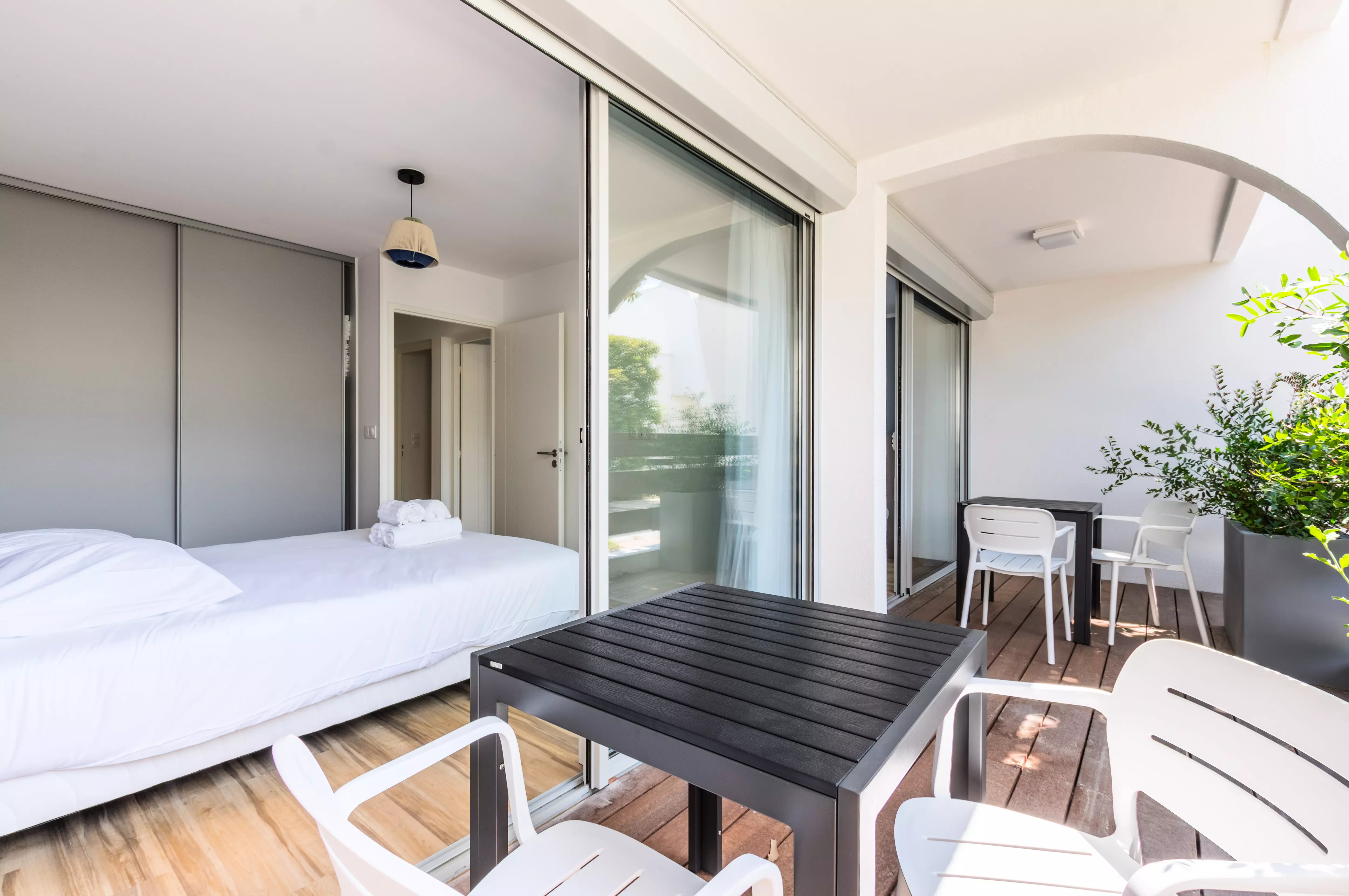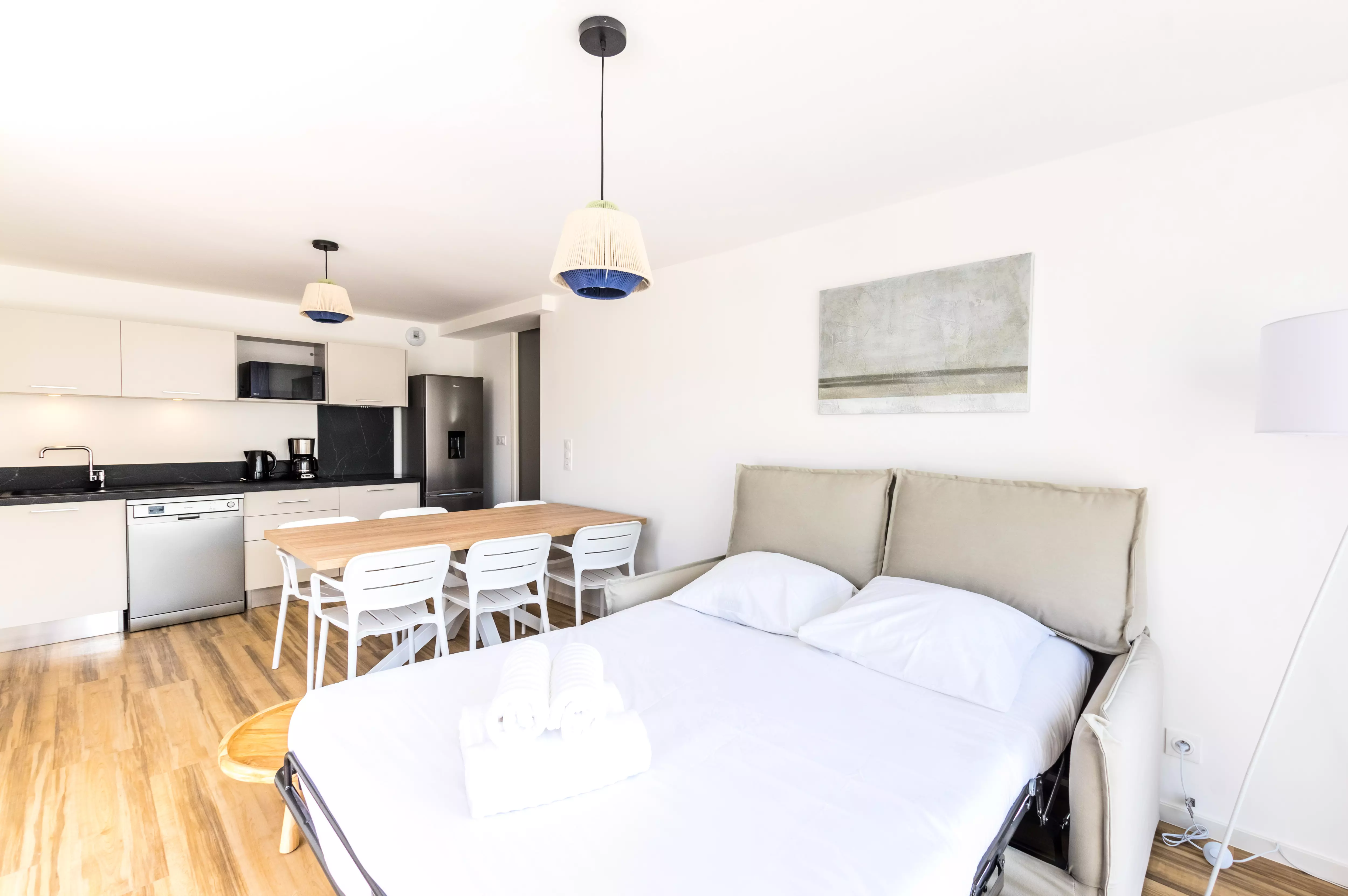 Le logement est équipé de la climatisation, du chauffage, d'un accès Wifi, d'une télévision, d'un réfrigérateur, d'un four micro-ondes, d'un lave-vaisselle, d'une cafetière, d'une bouilloire, d'un sèche-cheveux ainsi que de mobilier de jardin sur la terrasse.
