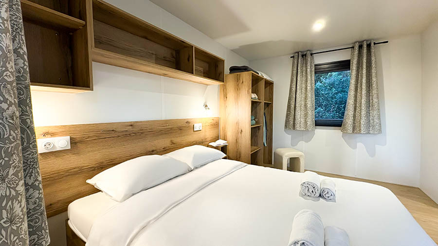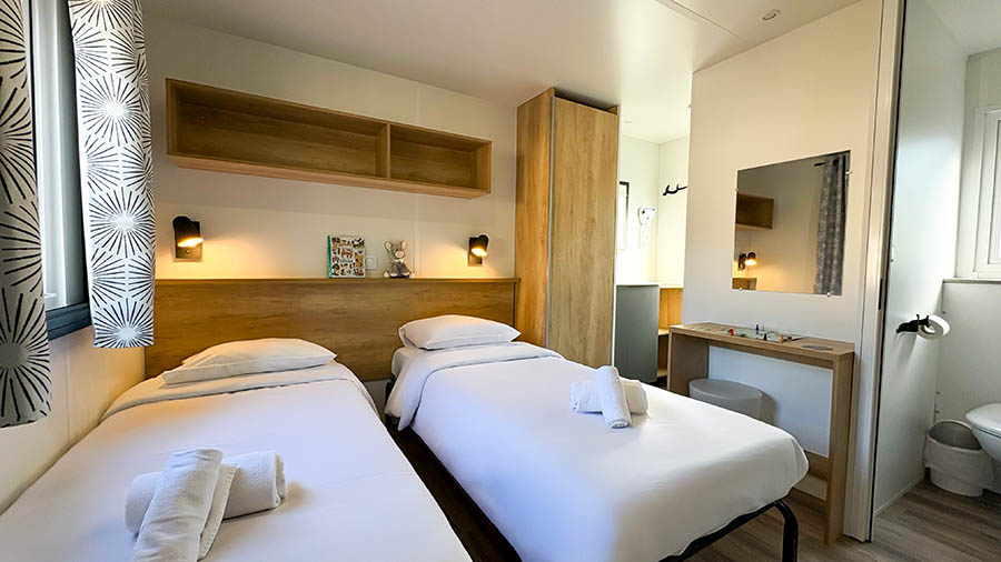 • Premium 2 (environ 33 m²) : 1 chambre avec 1 lit en 160, 1 chambre avec 2 lits en 80, salon avec 1 banquette/lit gigogne de 130x190. 2 salles de douche avec WC séparés, terrasse aménagée d'environ 16 m² avec chaise longue, table et bancs de jardin.
