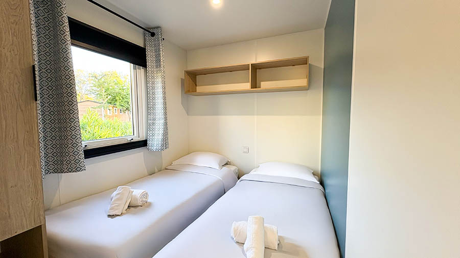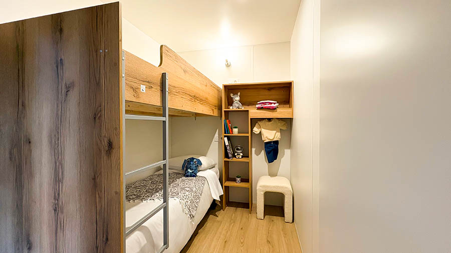 • Premium 3 (environ 40 m²) : 1 chambre avec 1 lit en 140, 2 chambres avec 2 lits en 80, salon avec 1 banquette/lit gigogne de 130x190. 2 salles de douche dans les "Premium 3" dont 1 avec WC, 2ème WC séparé, terrasse aménagée d'environ 27 m² avec chaise longue, table et bancs de jardin.