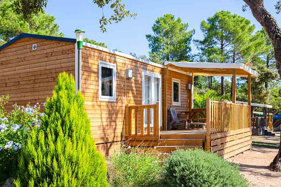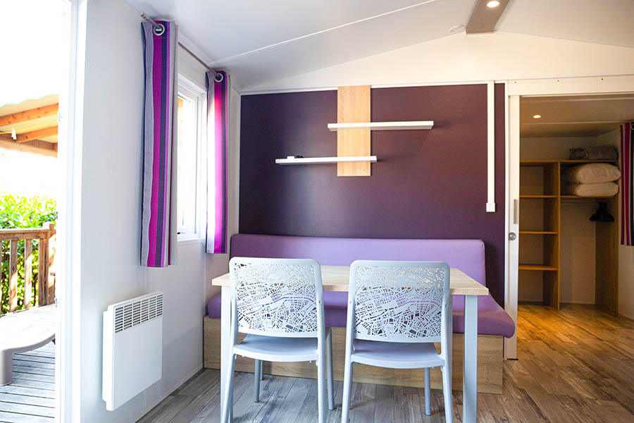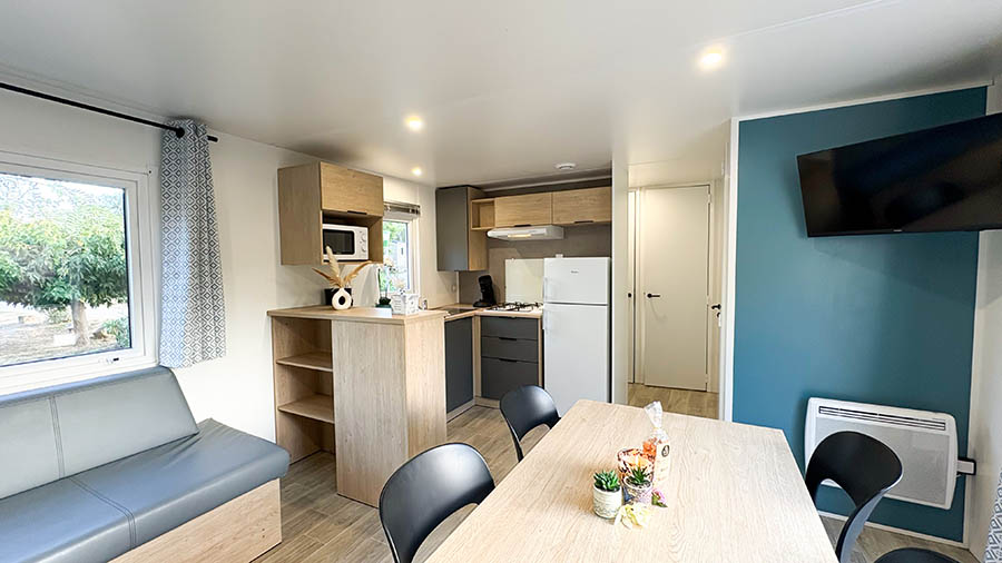 Des chalets habillés de bois, offrant des espaces bien conçus et de bon confort pour ce type de vacances : climatisation, télévision, cuisine ouverte sur le salon (réfrigérateur, micro-ondes, bouilloire, cafetière filtre dans tous les logements et à dosettes, gazinière 4 feux, et lave-vaisselle dans les "Premium 3". Table de repas dans le salon.
