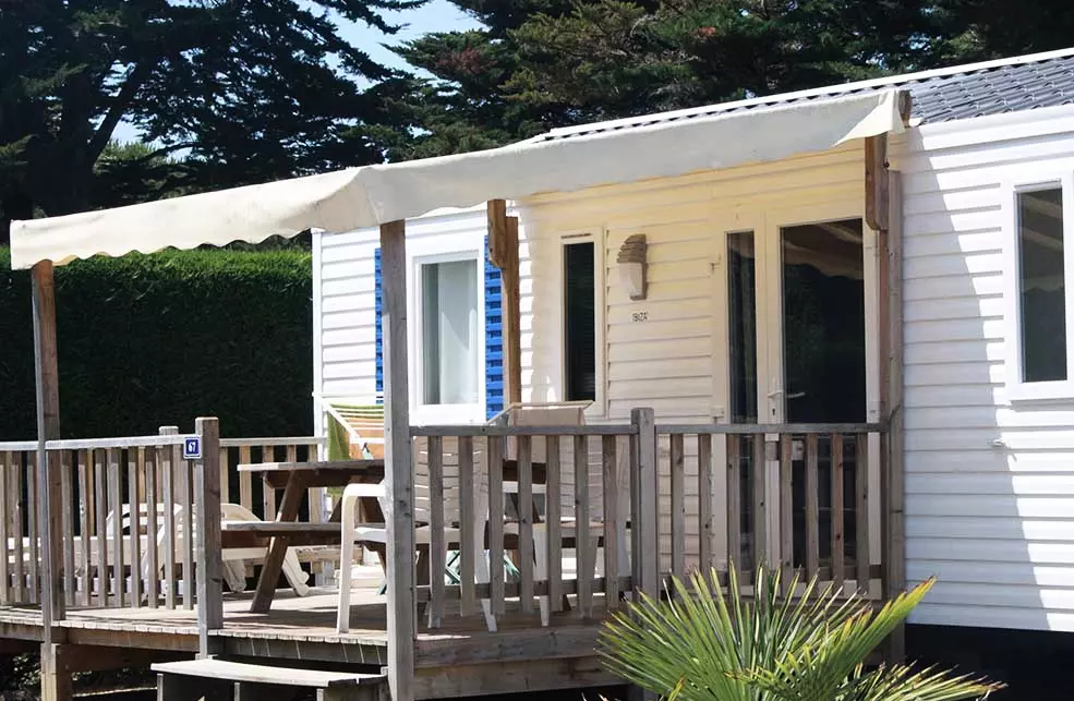 Mobil home climatisé pour 6 personnes, composé d'un salon avec télévision, d'un coin cuisine équipé, d'une chambre avec un lit double, de 2 chambres avec chacune 2 lits simples, d'une salle de douche, de WC séparés, d'une terrasse.