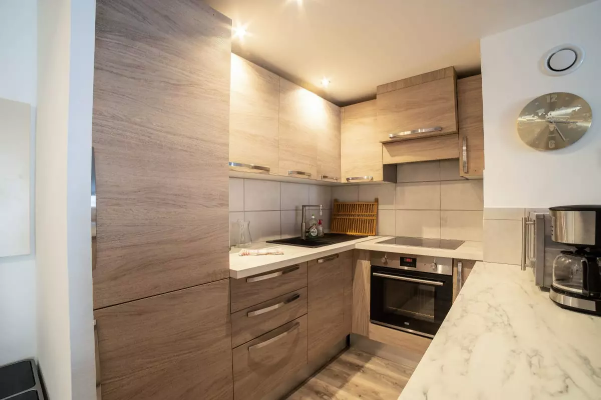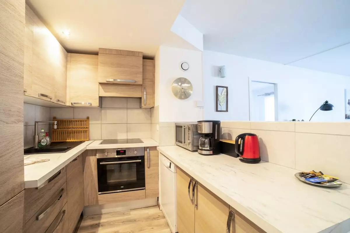 Il est composé de deux chambres, d'une cuisine équipée, de deux salles d'eau et d'un salon cosy avec une télévision pour vous détendre après une intense journée.