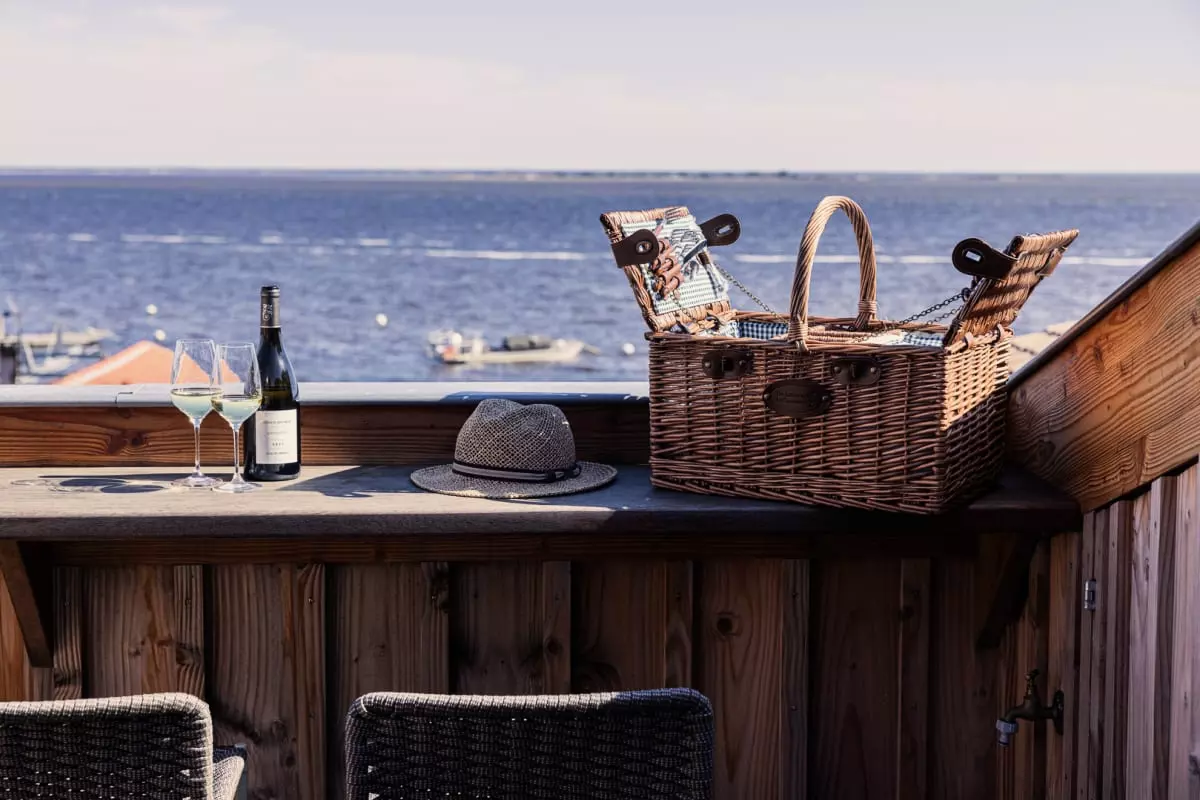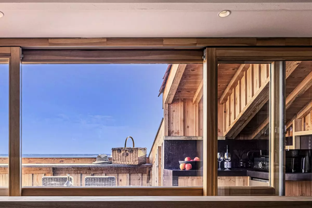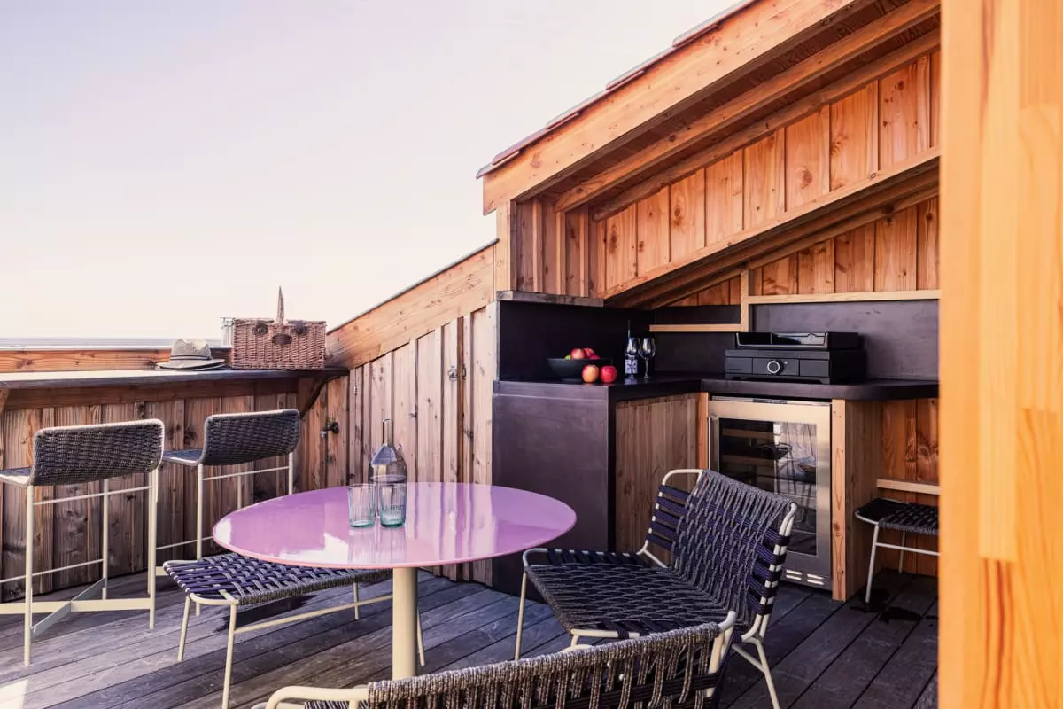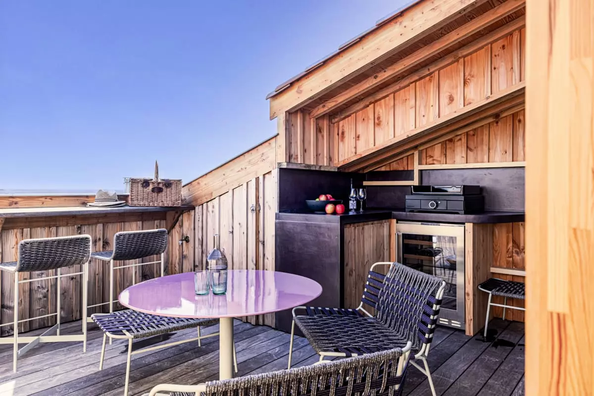 L'appartement Yndo, imaginé par Agnès Guiot du Doignon, une figure marquante du design et de l'architecture d'intérieur, offre également une terrasse panoramique offrant une vue imprenable sur tout le bassin d'Arcachon, l'île aux oiseaux et la majestueuse Dune du Pilat en arrière-plan. C'est l'endroit idéal pour savourer un café le matin, déguster un repas en plein air ou simplement admirer le paysage à couper le souffle.