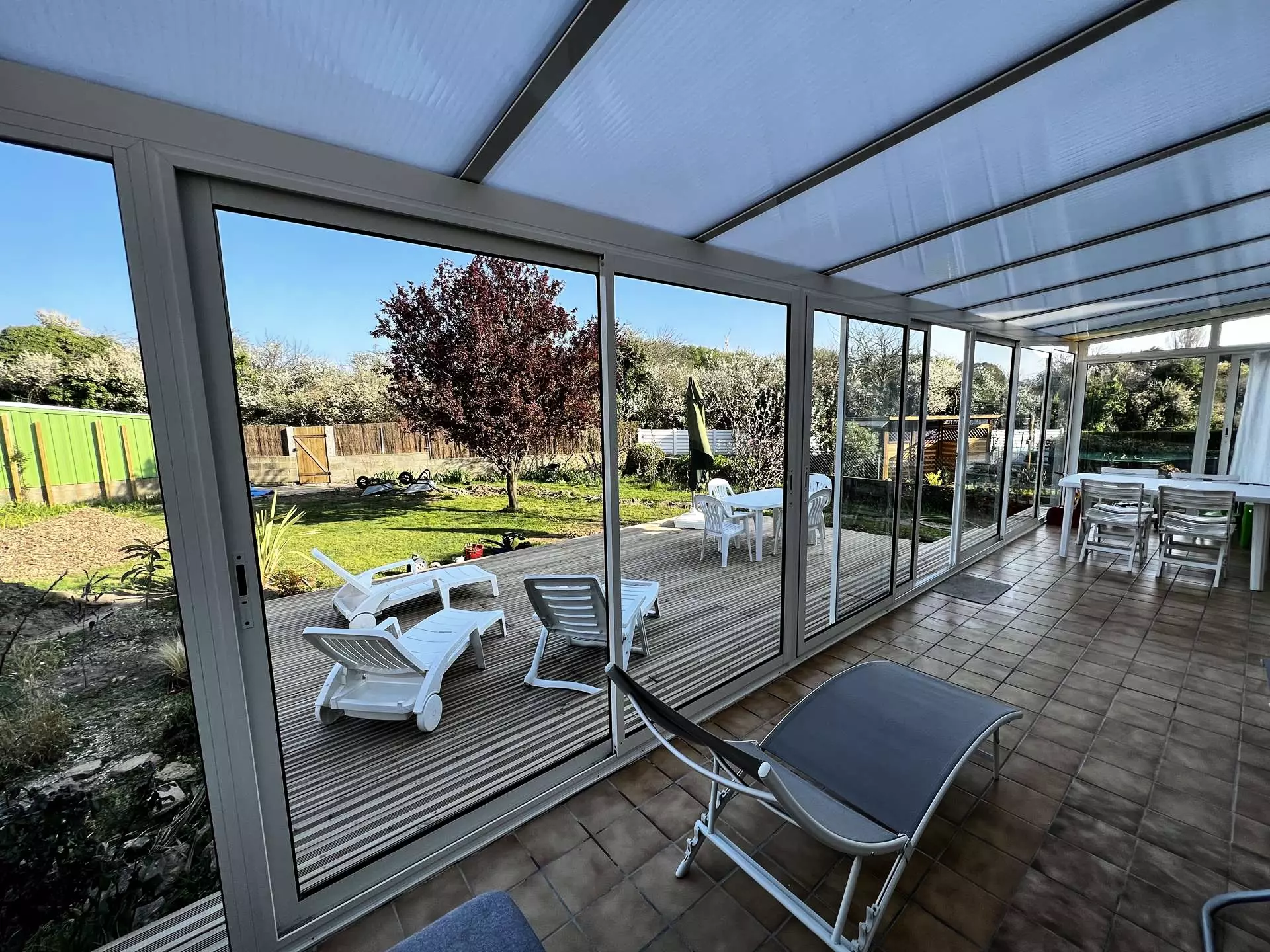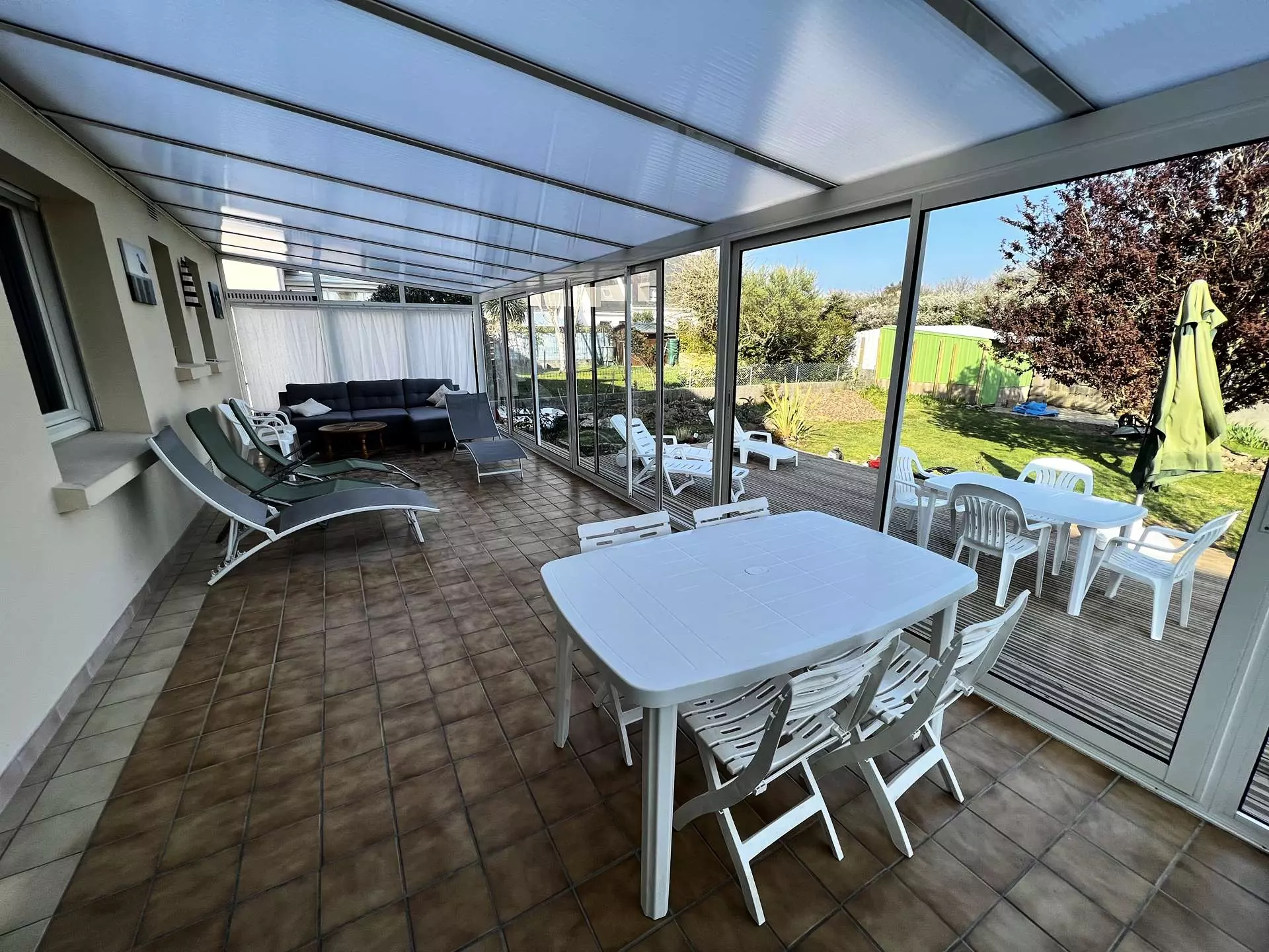 Véranda de 30 m² donnant accès à une grande terrasse et un jardin clos exposé Sud. Petit portillon au fond du jardin permettant d'accéder directement à la plage en 3 min à pied. Cabanon indépendant pouvant accueillir des vélos.