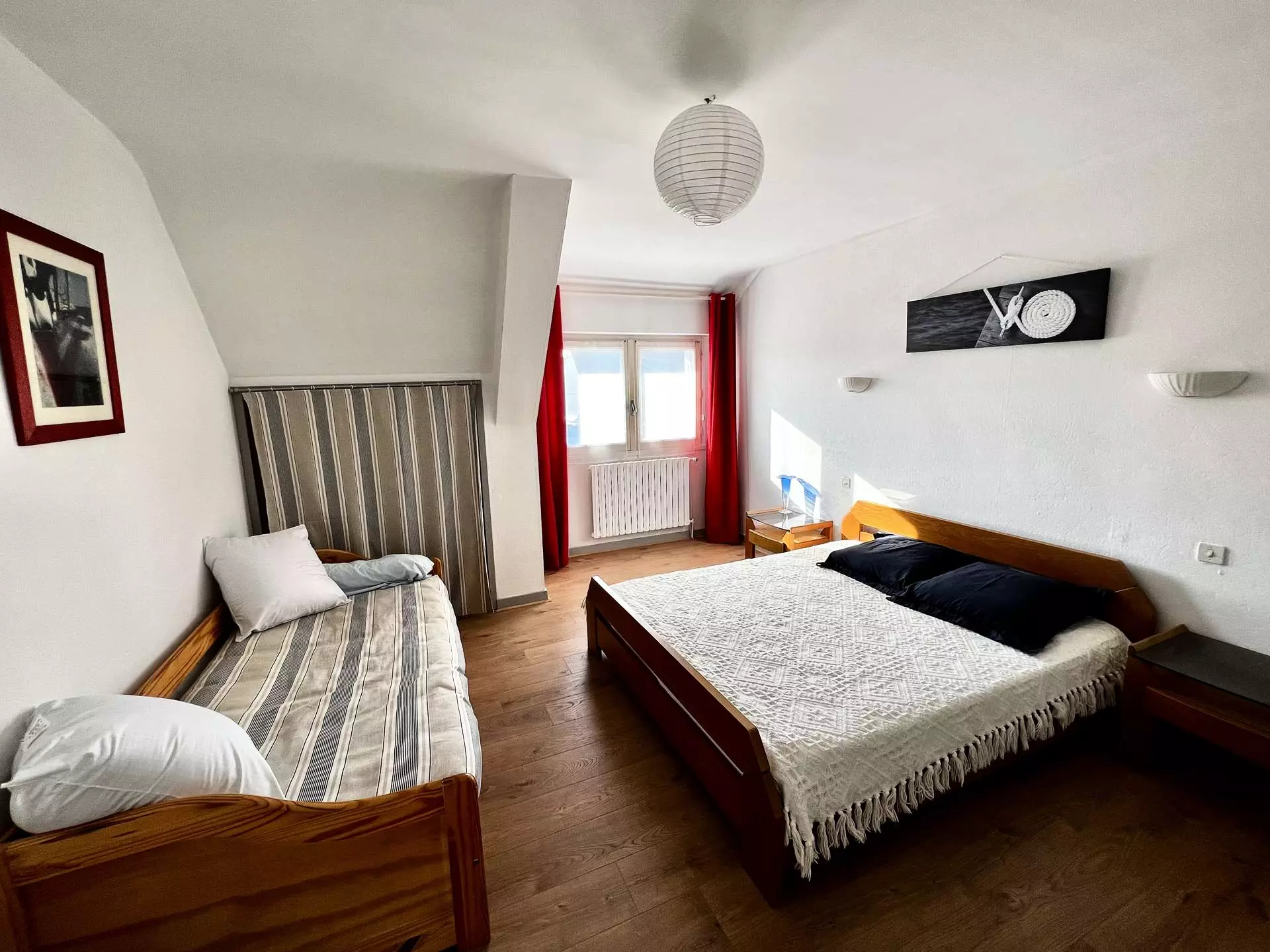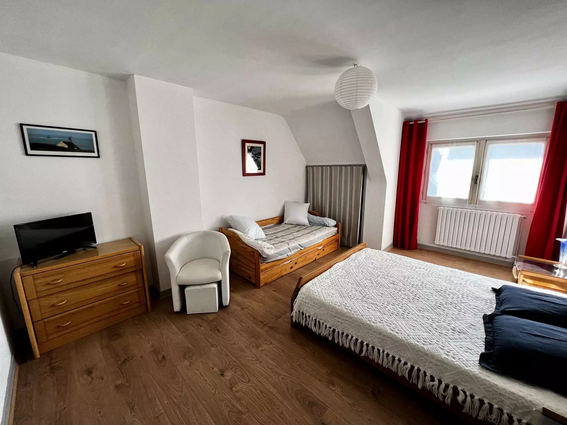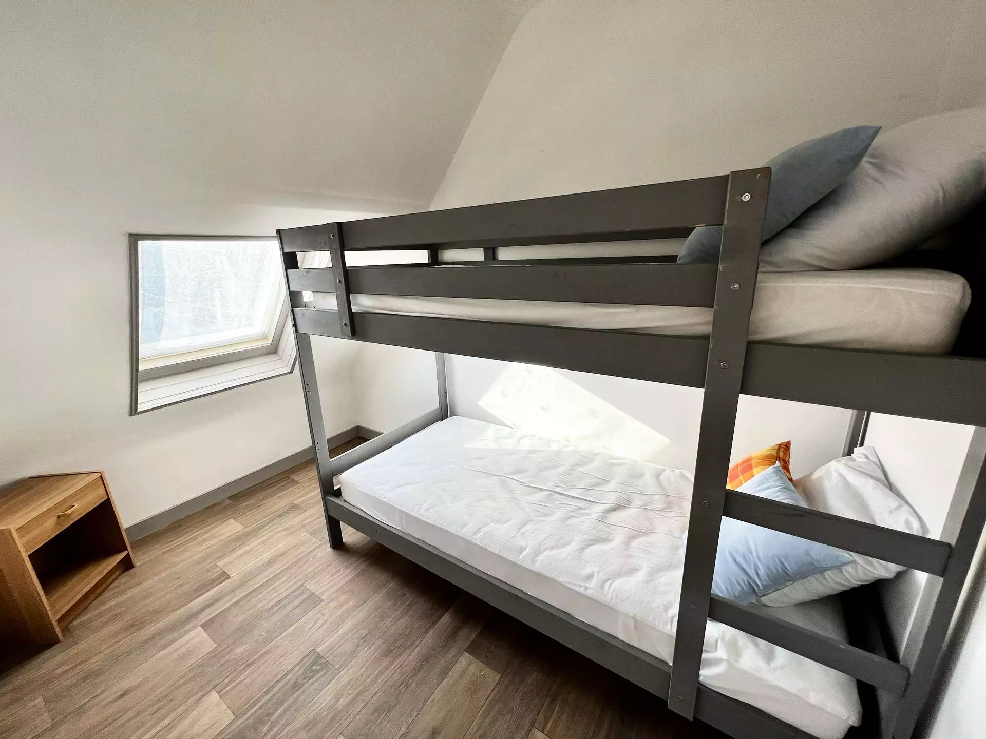 Chambre 3 : 1 lit en 140 (couette), 1 lit gigogne avec 2 couchages en 90 (couettes) et placard sous pente