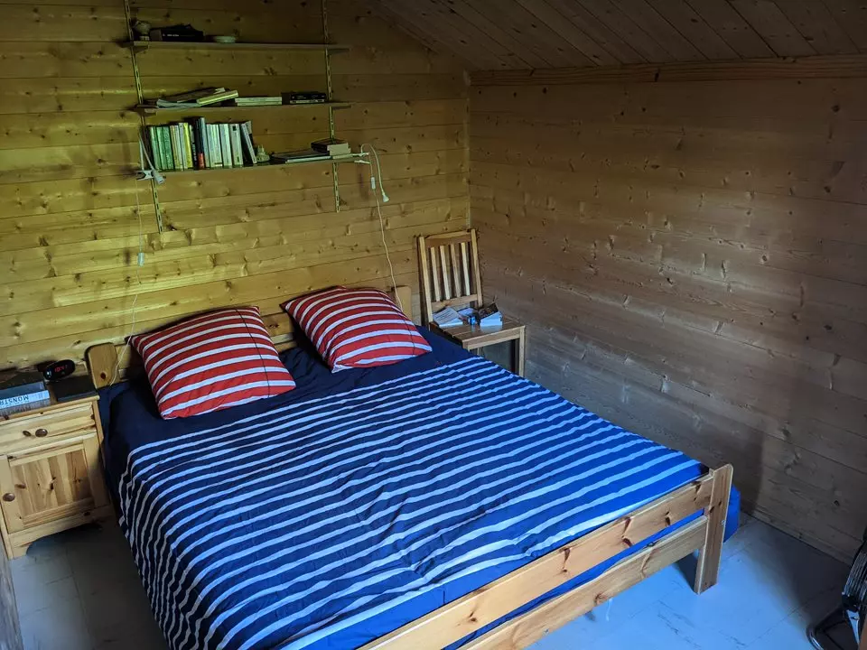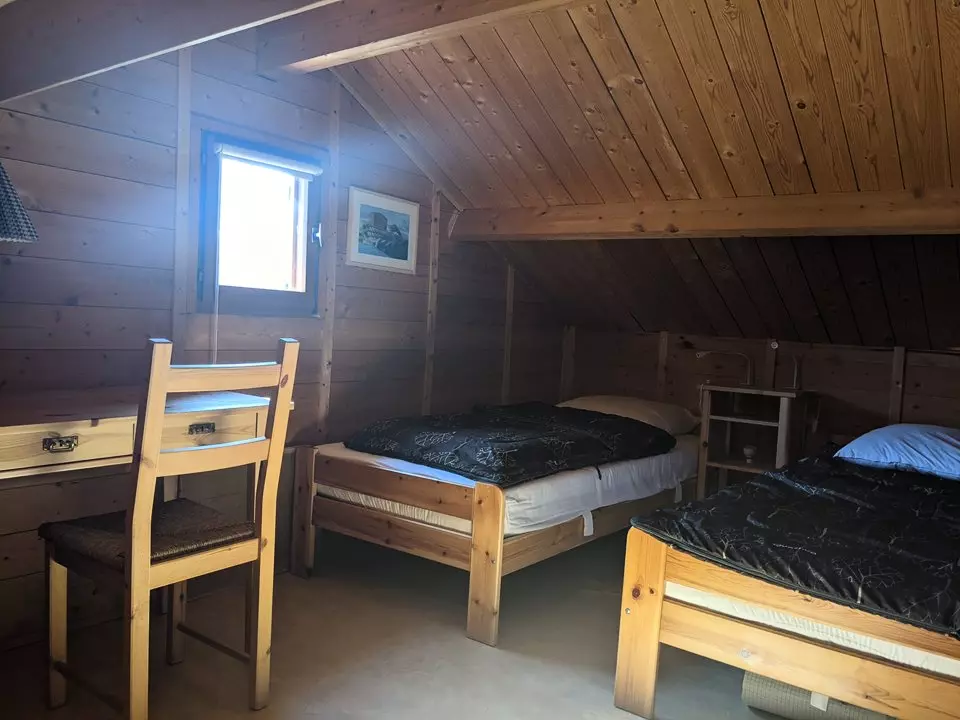 Il se compose d'un séjour-salle à manager avec cuisine ouverte, d'une salle d'eau (WC séparés), d'une chambre parentale et de deux chambres comportant chacune deux lits simples (dont l'une en mezzanine). Jardin d'environ 300 m², terrasse en bois, balançoires, barbecue, salon de jardin. Idéal pour un séjour en famille.