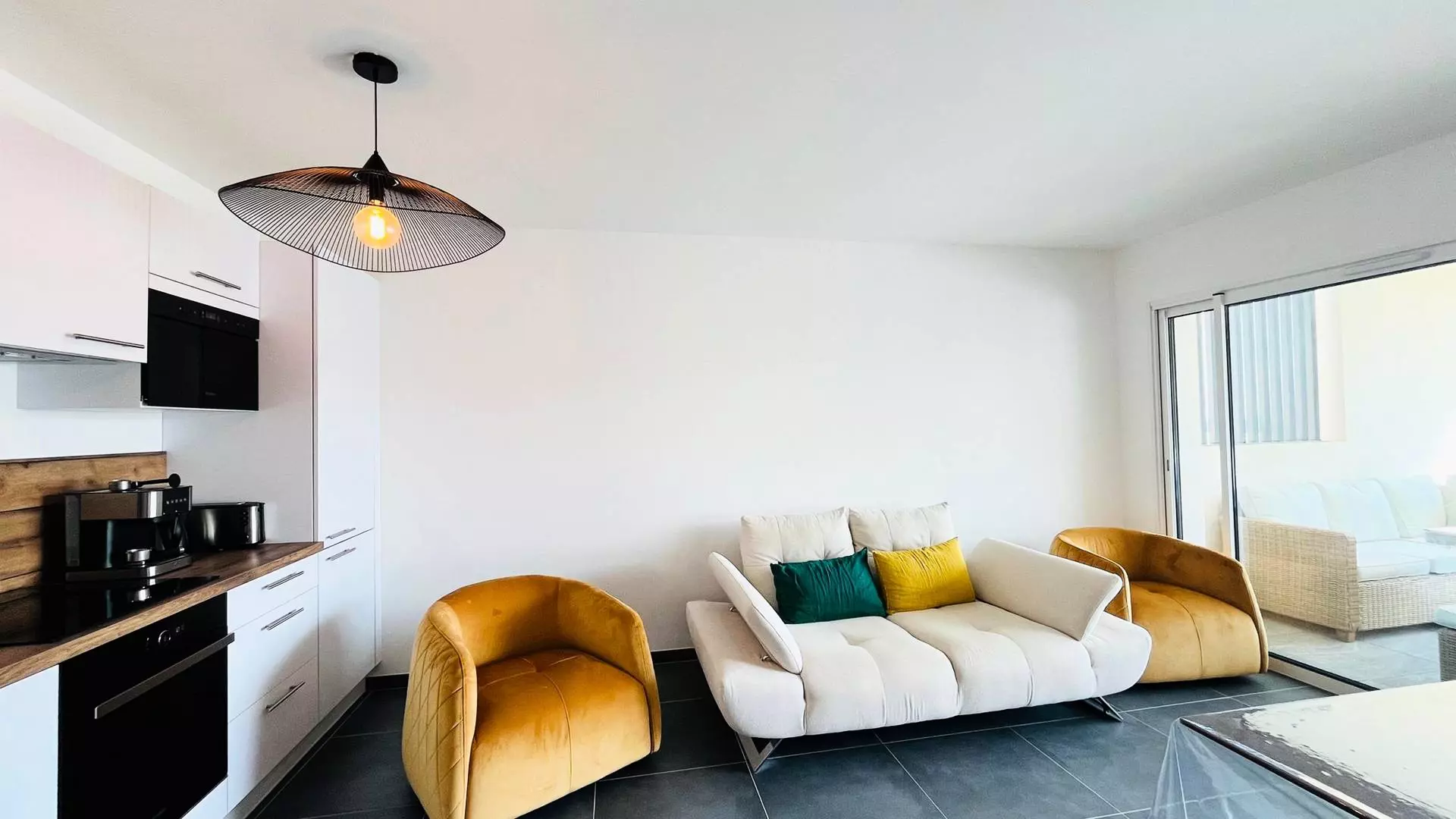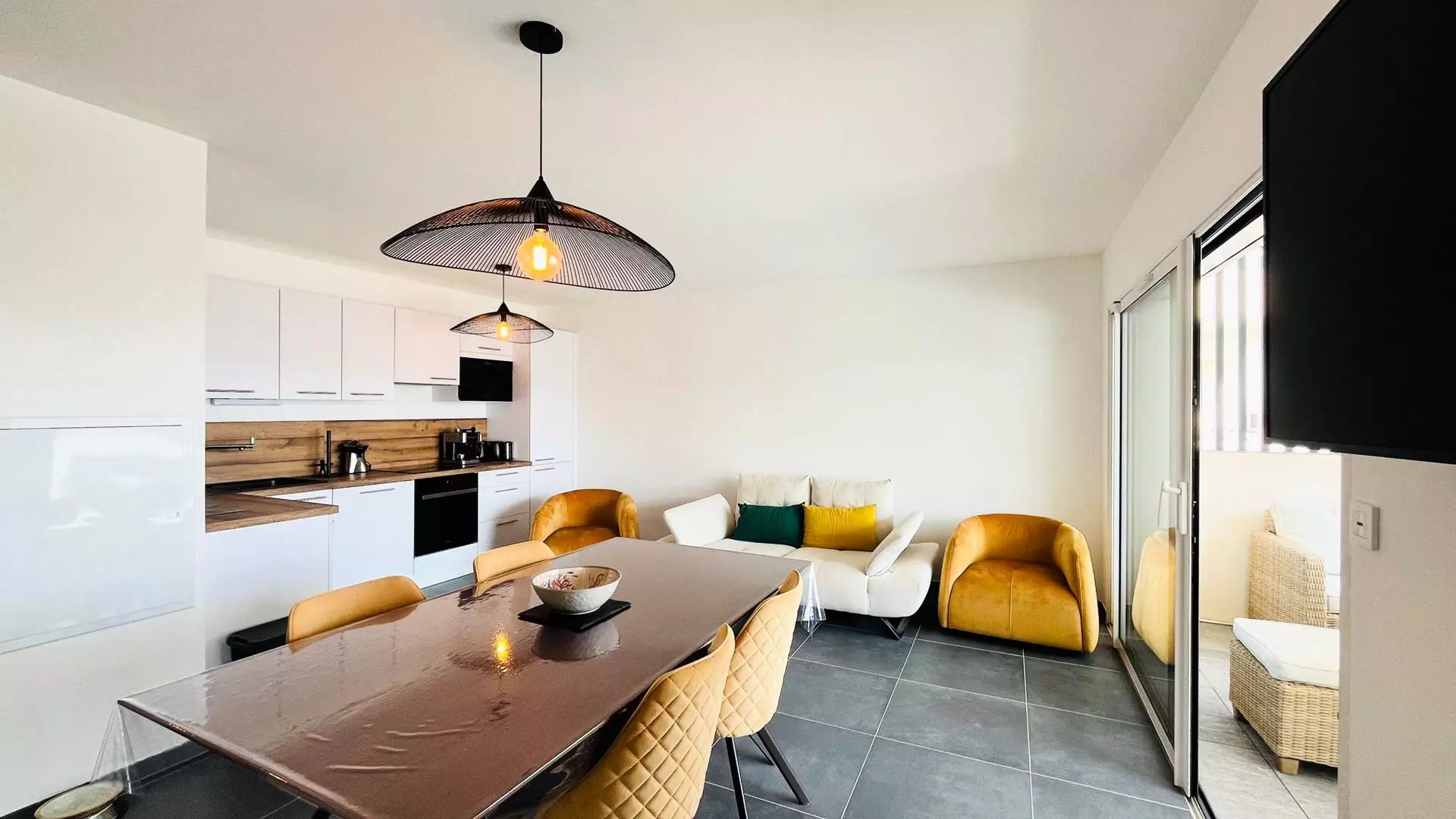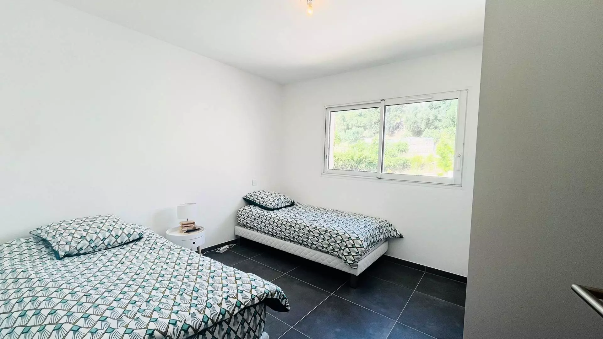 L' appartement, au premier étage est composé d'une cuisine entièrement équipée ouverte sur un grand salon lumineux, d'une salle d'eau, d'une première chambre avec deux lits simples, d'une seconde chambre avec un lit double.