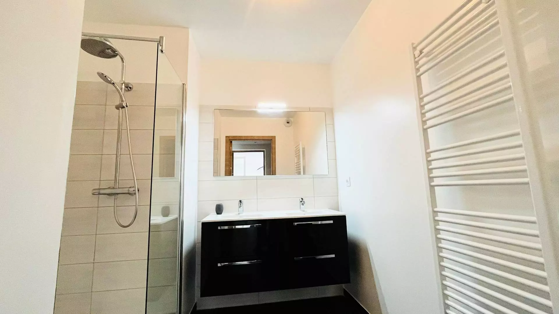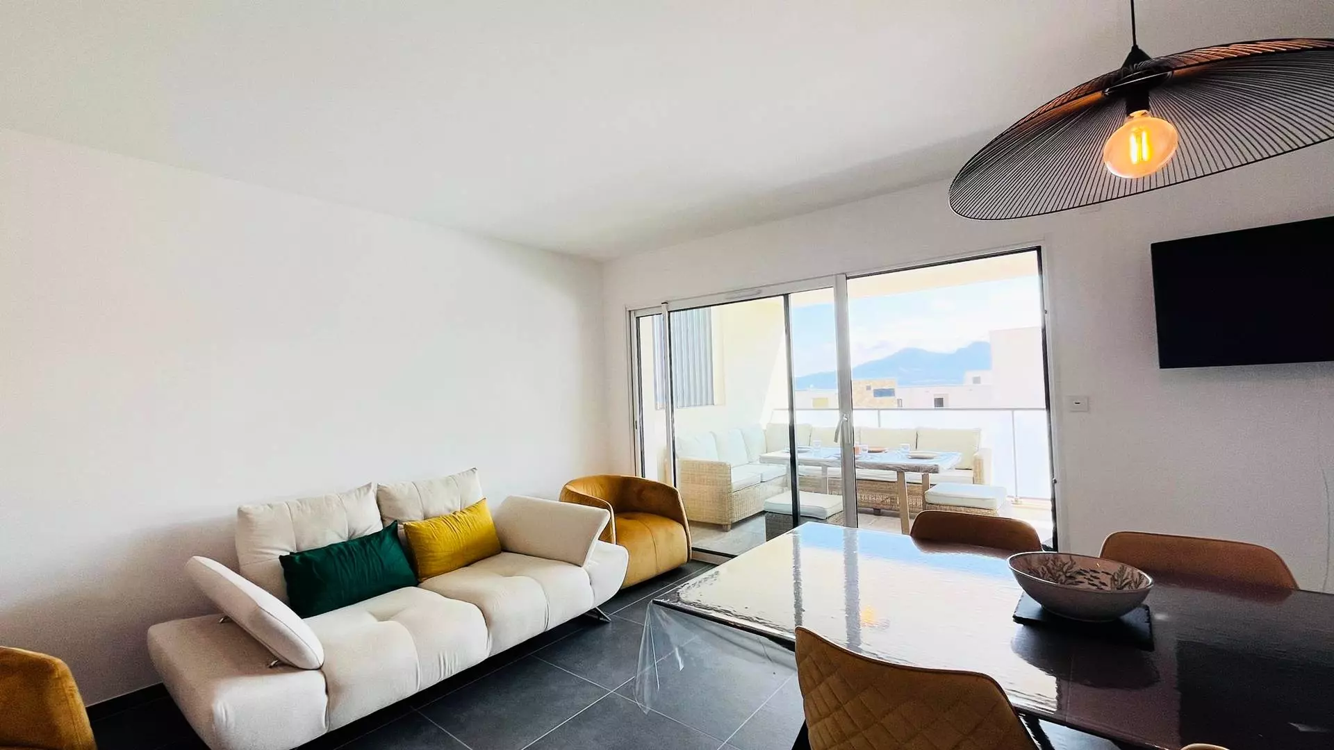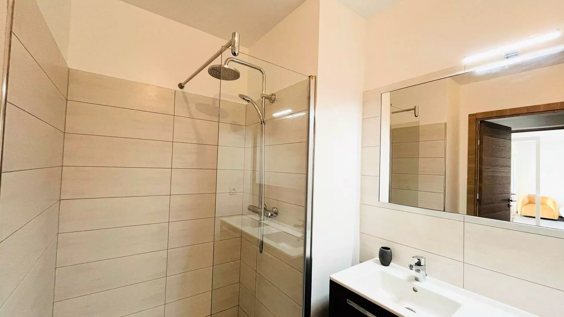L' appartement, au premier étage est composé d'une cuisine entièrement équipée ouverte sur un grand salon lumineux, d'une salle d'eau, d'une première chambre avec deux lits simples, d'une seconde chambre avec un lit double.