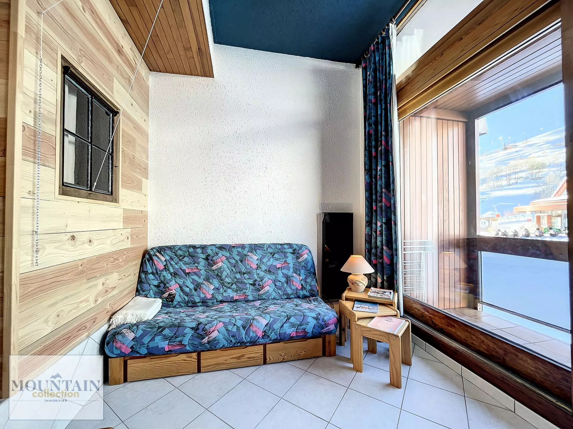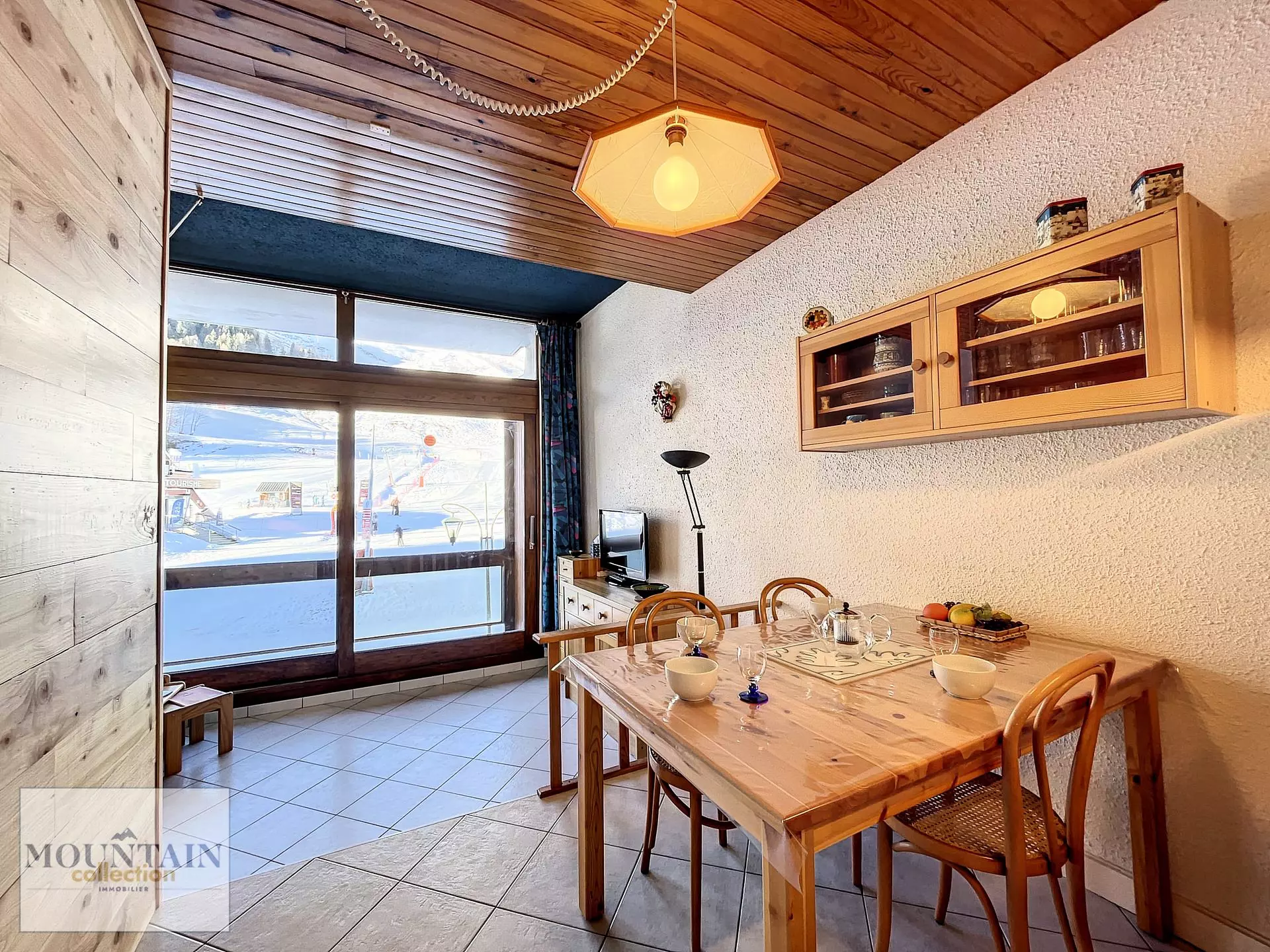 Le séjour est équipé d'une table pouvant accueillir 4 convives, d'un canapé lit en 140 pour 2 personnes et TV écran plat, ouvrant sur un grand balcon avec vue imprenable sur l'Office de tourisme et les pistes.