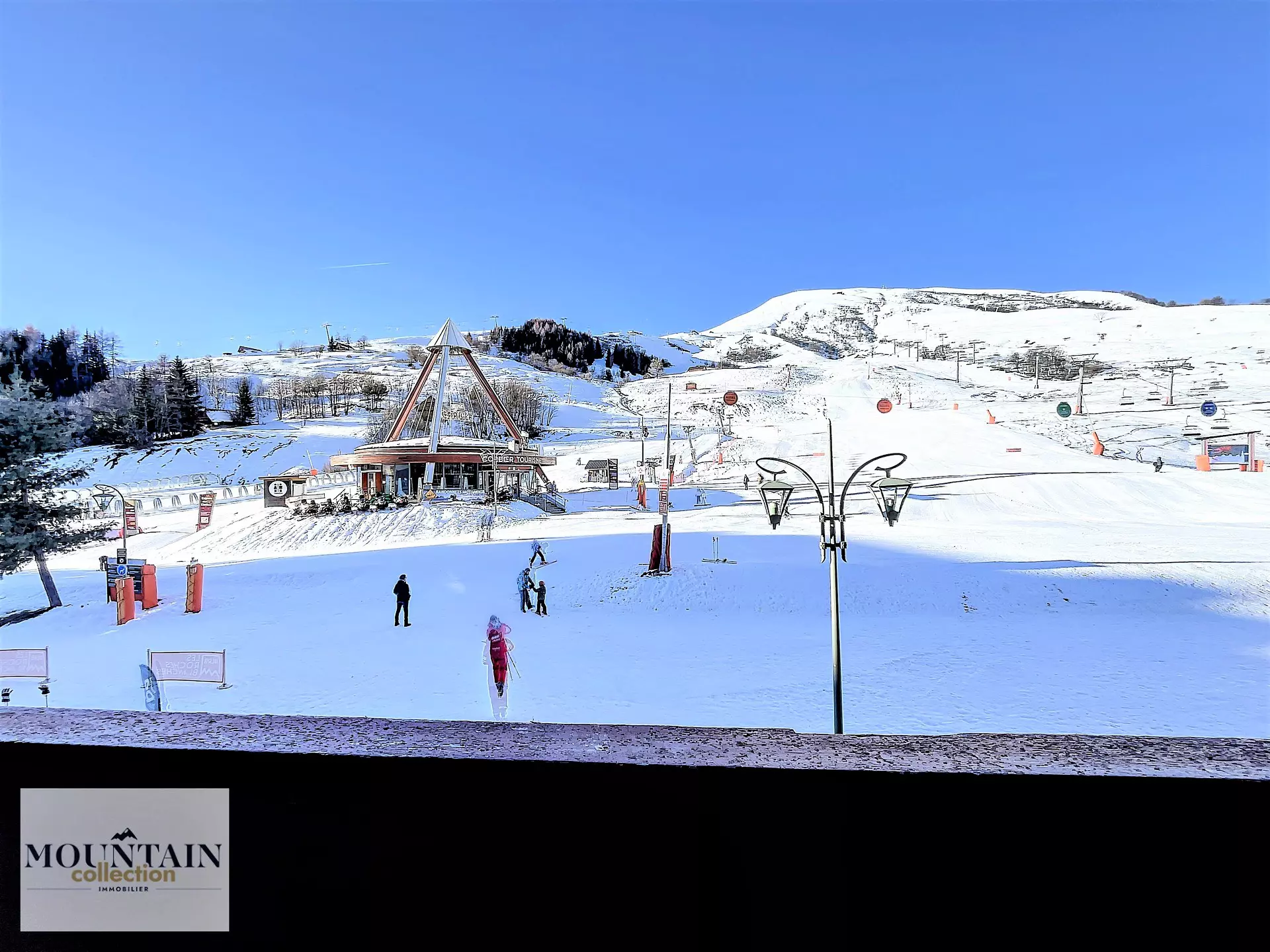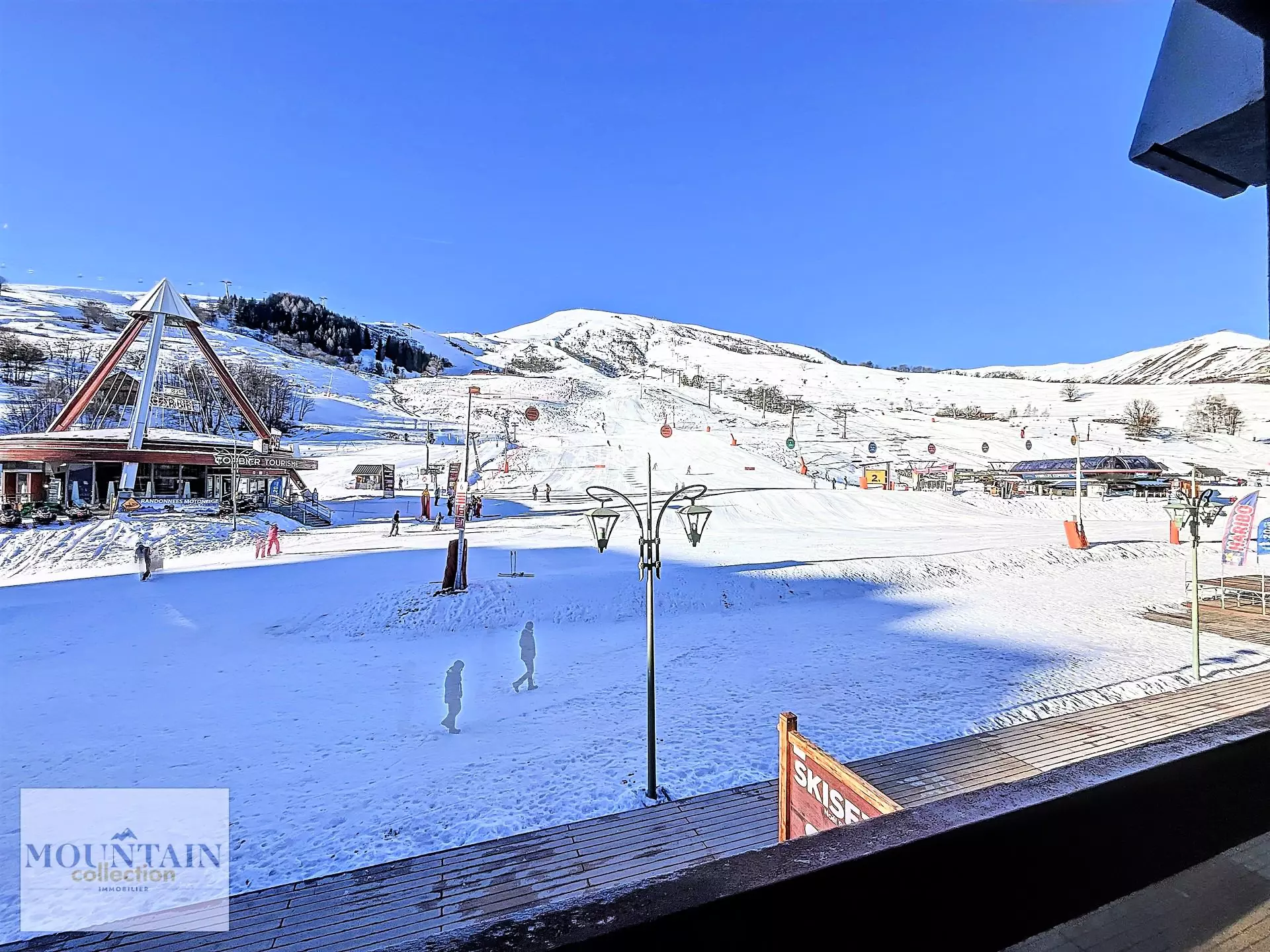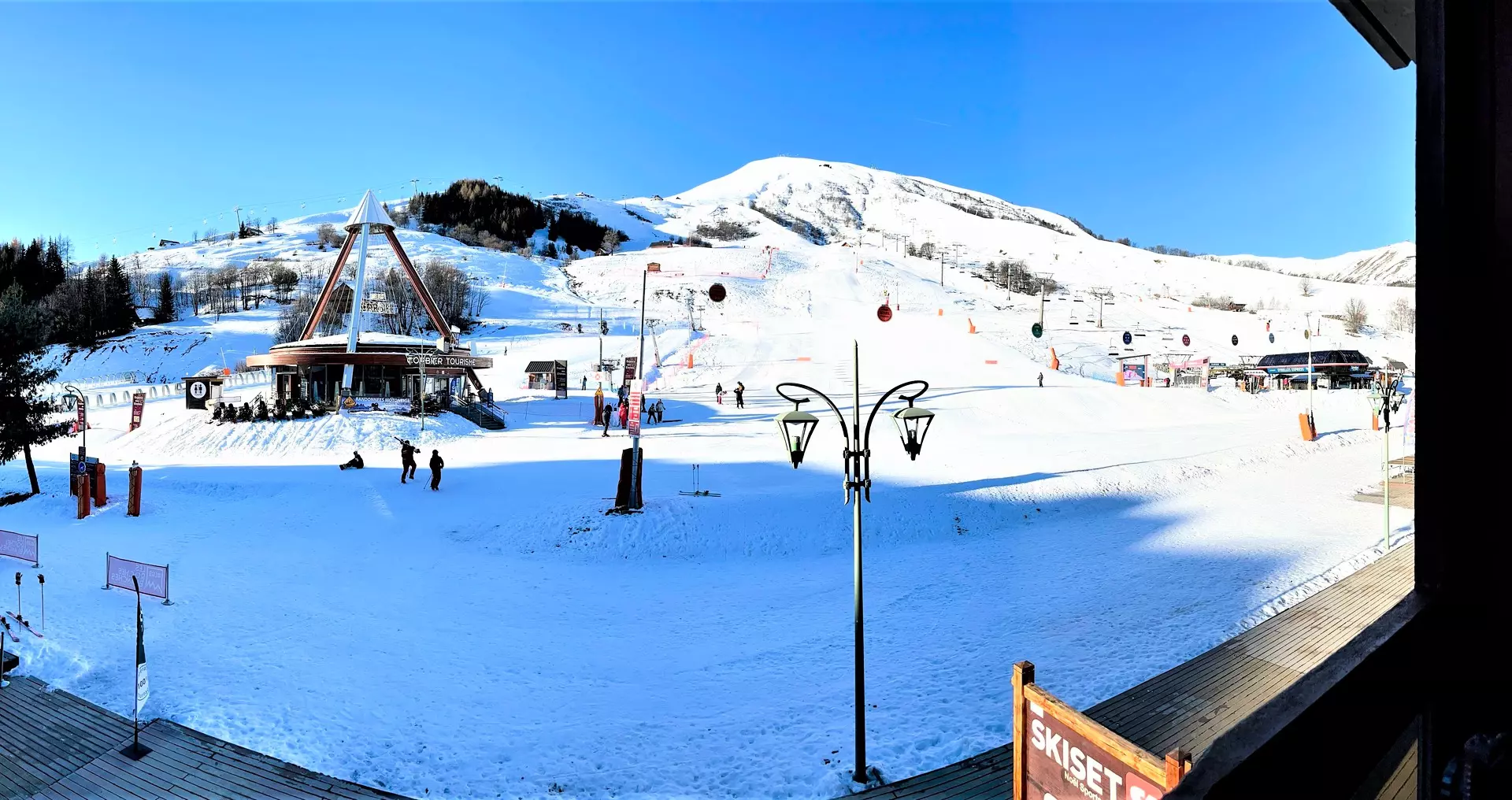 Le grand balcon donnant directement sur le Front neige, vue sur l'Office de tourisme, les pistes et le Sybelles Express.