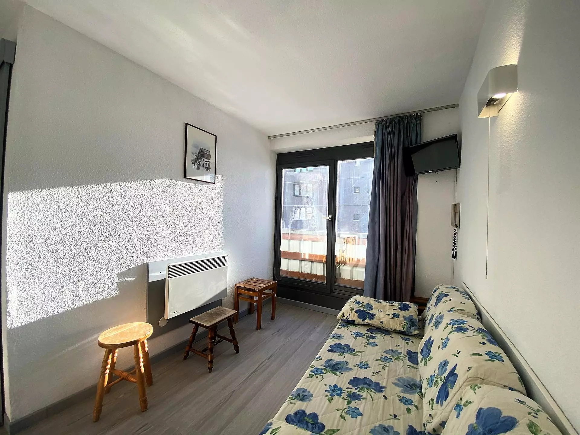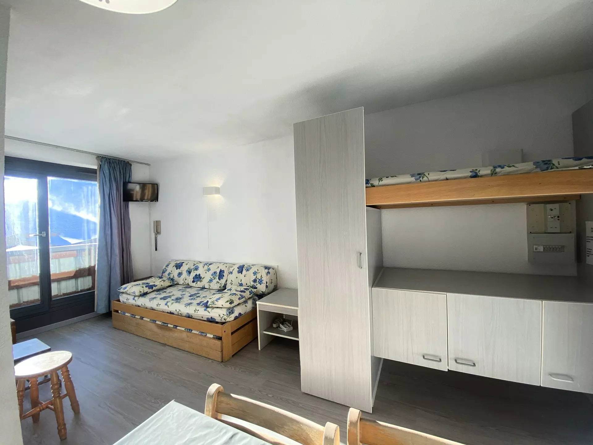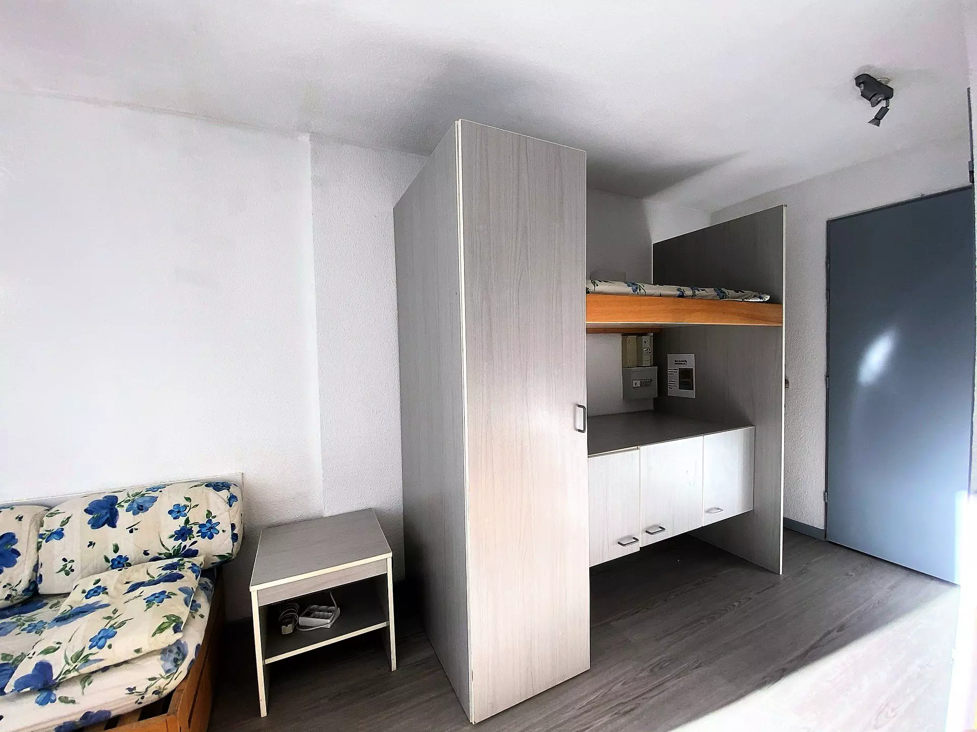 Il y a une chambre séparée du séjour par une porte coulissante avec 2 lits simples. Dans le séjour vous trouverez un canapé lit gigogne pour 2 personnes.