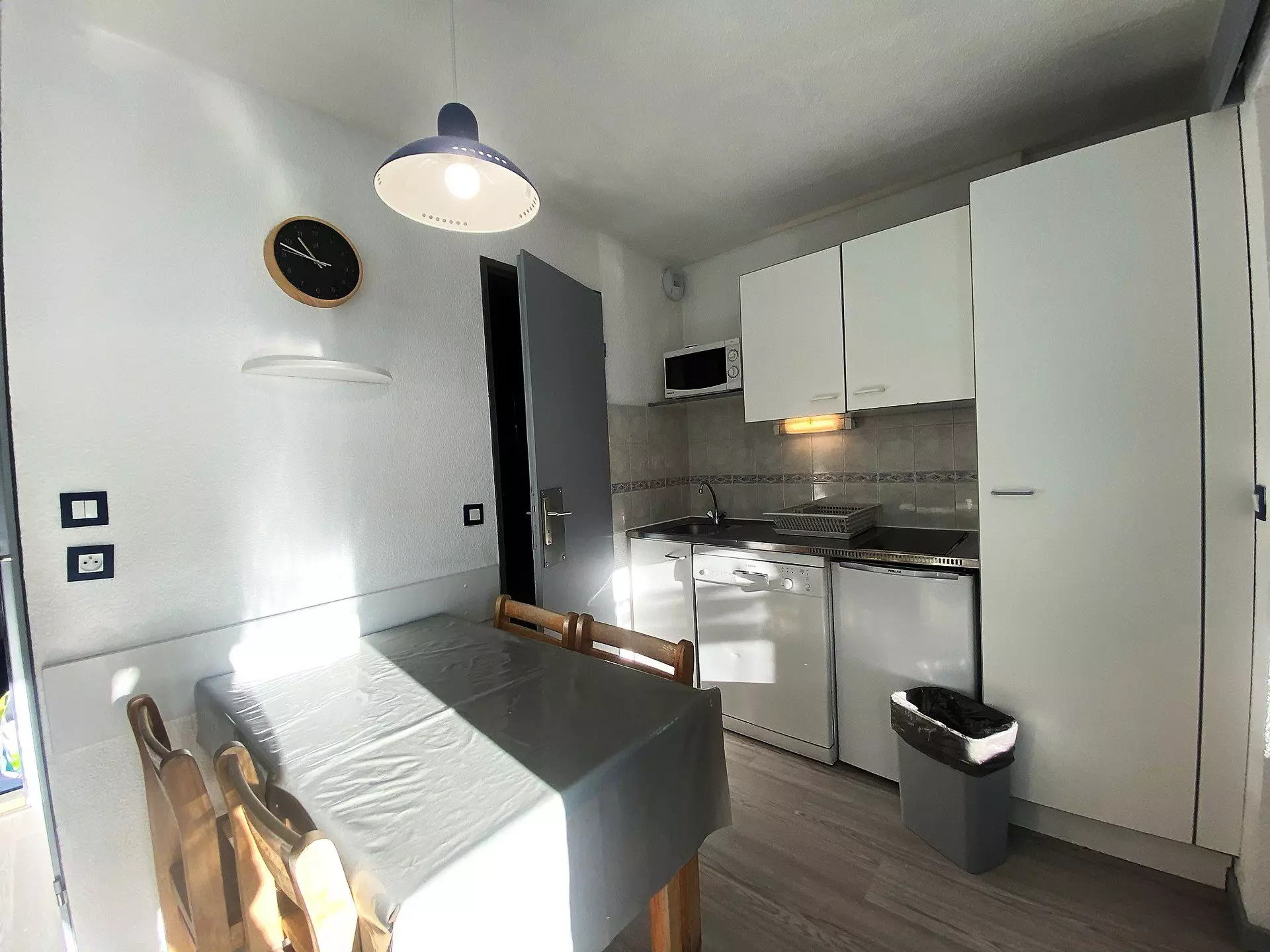 Le balcon est orienté sud/est avec une belle vue sur les montagnes, la cuisine est entièrement équipée avec réfrigérateur, plaques électriques, micro-ondes et lave vaisselle.