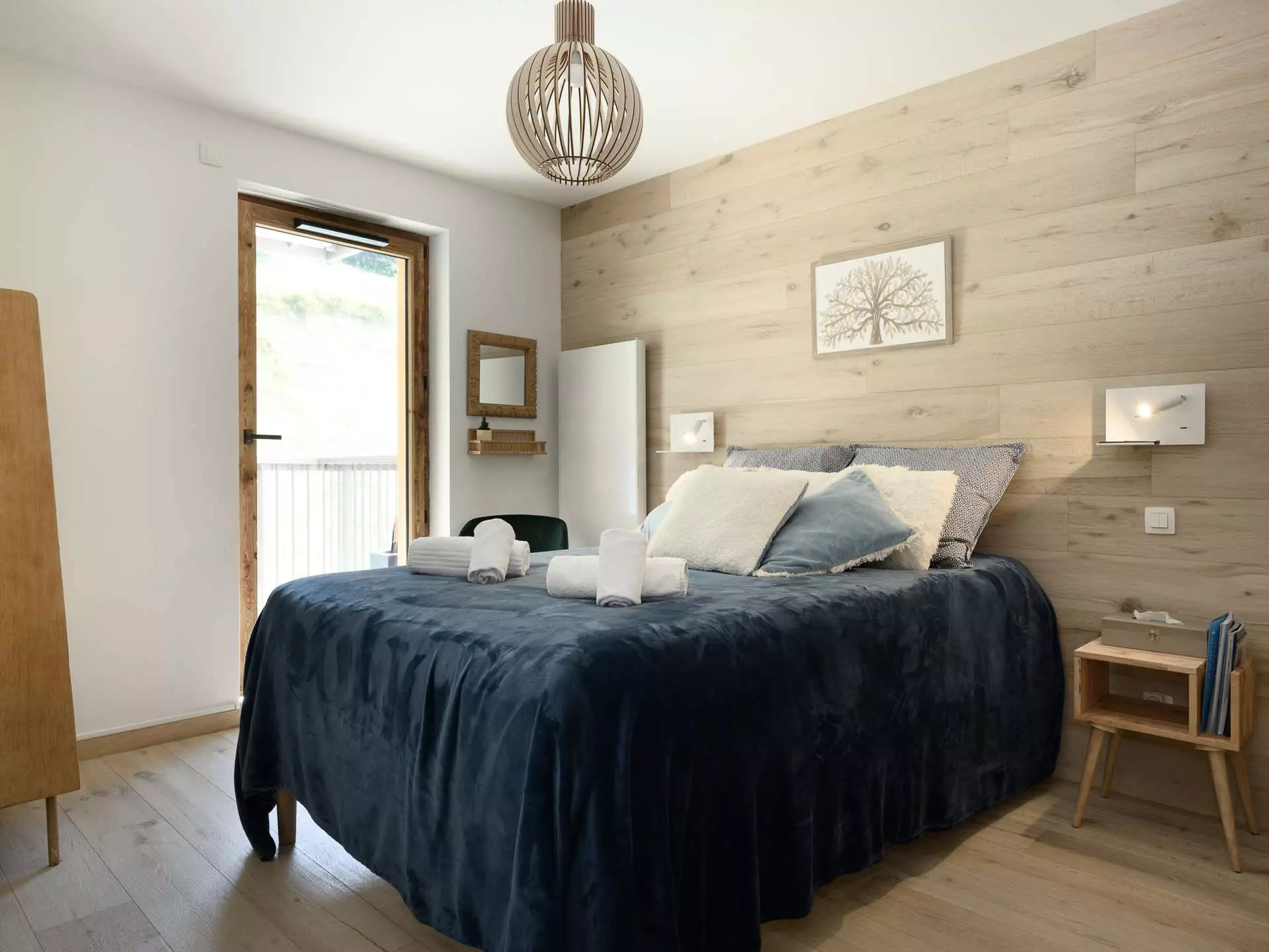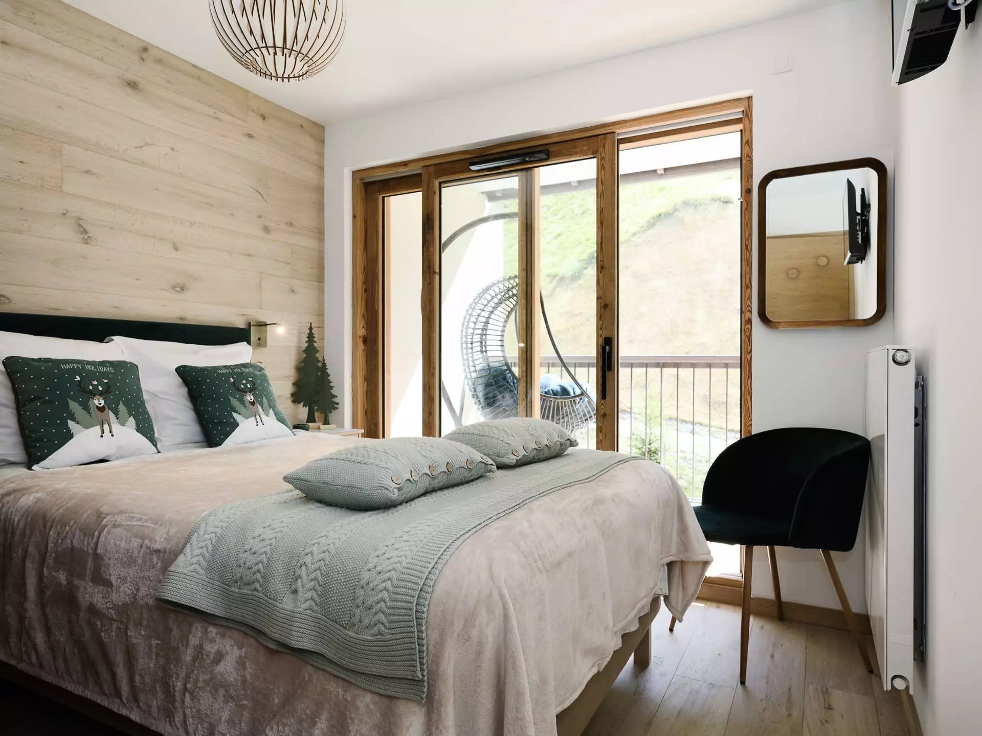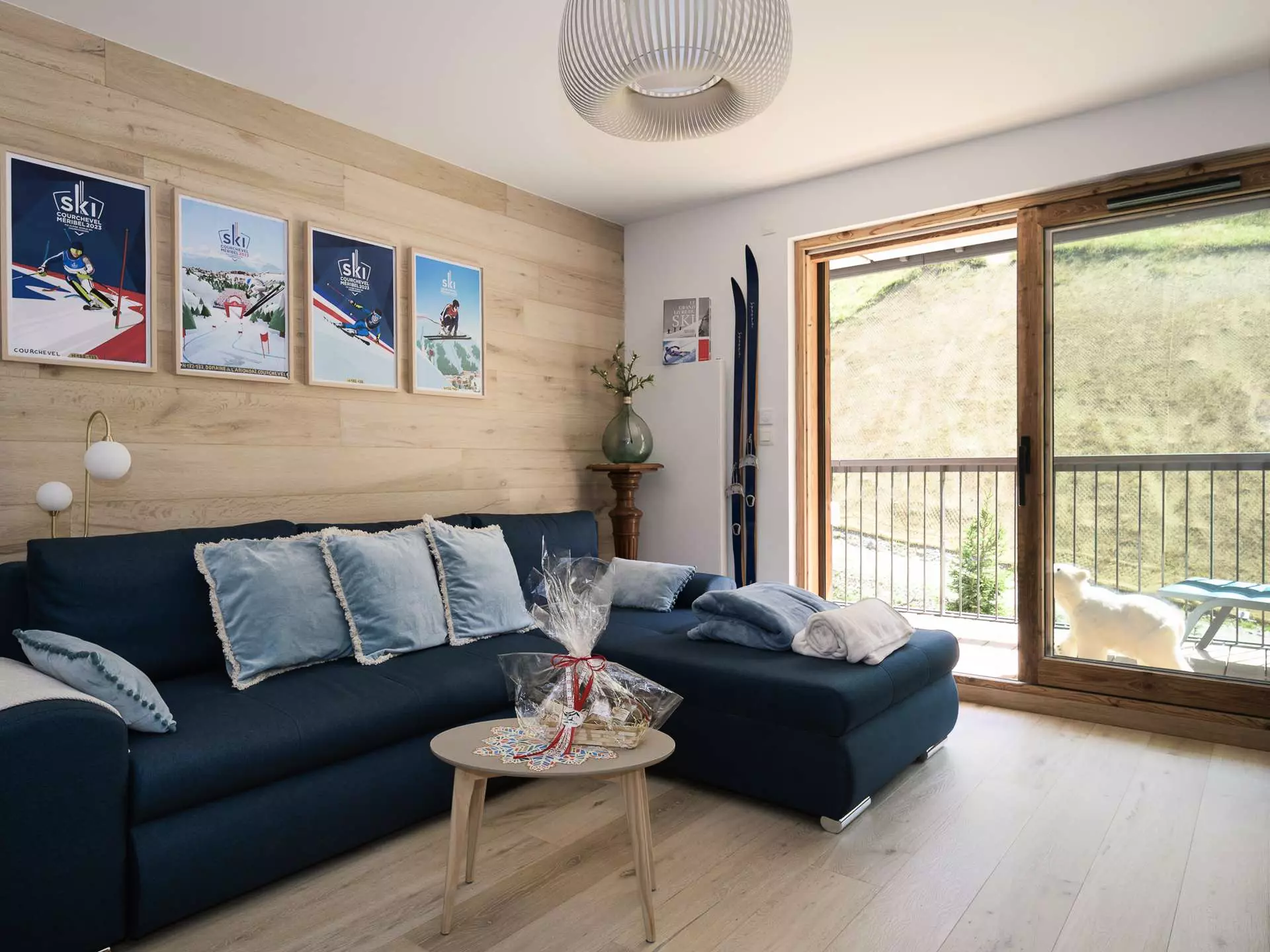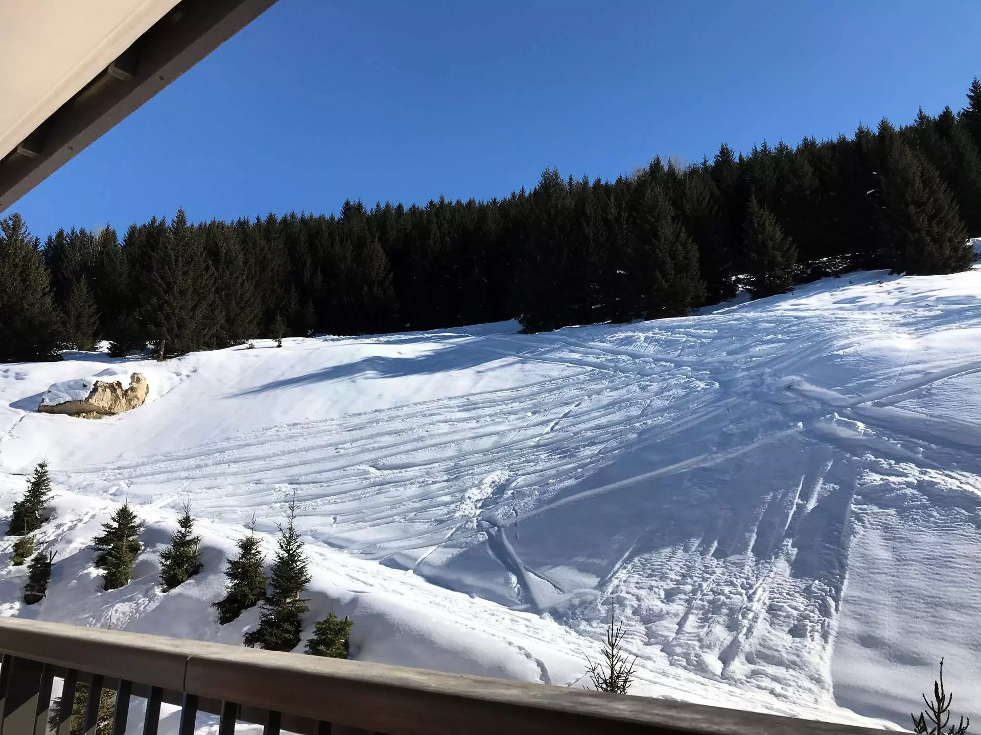 Appartement neuf offrant une décoration chaleureuse et une magnifique vue sur les pistes et la forêt.
