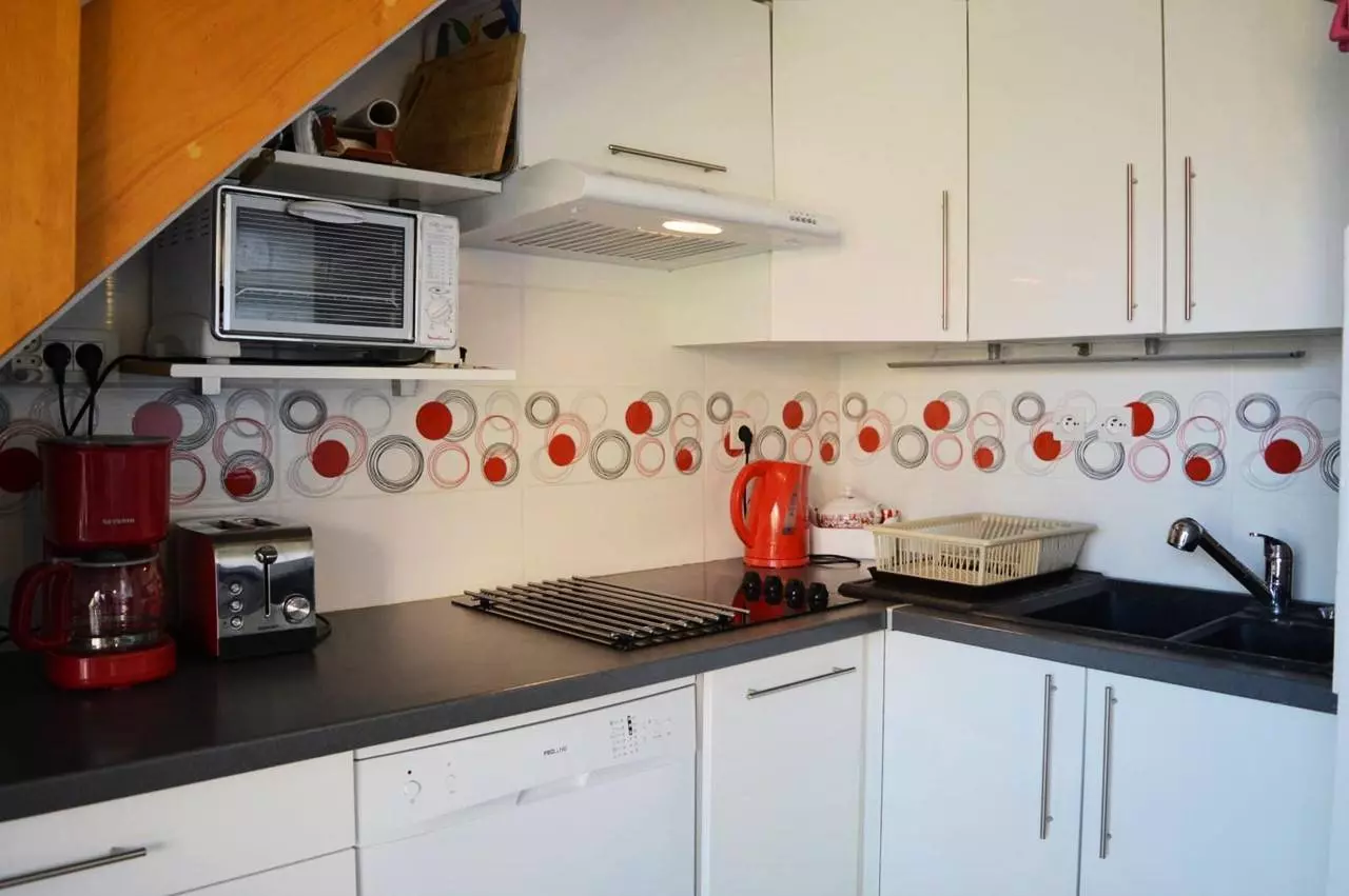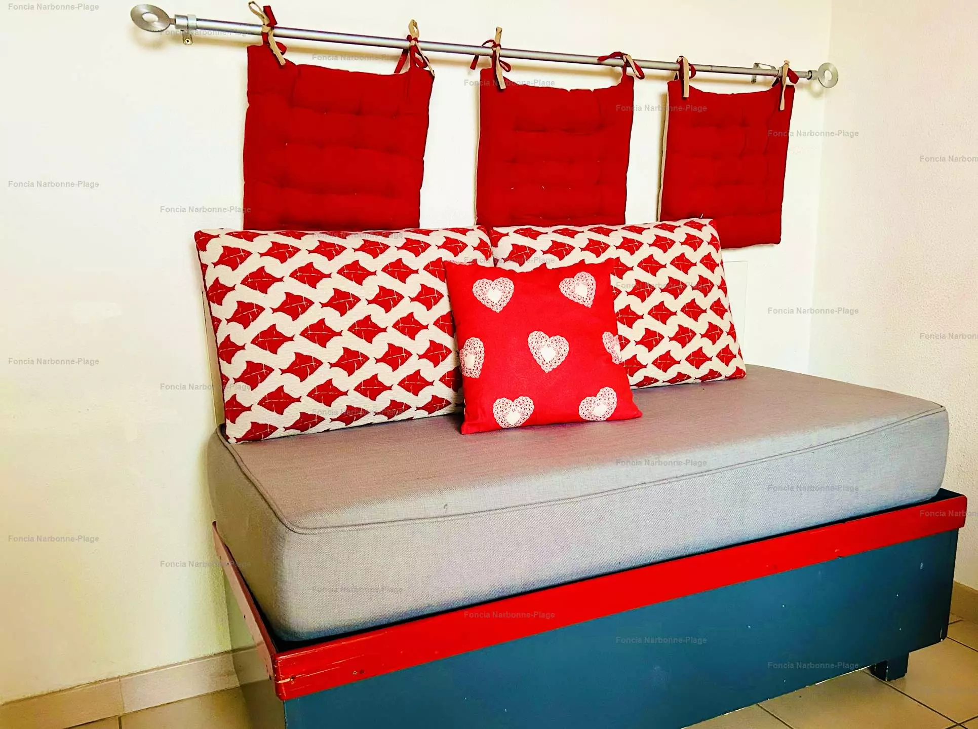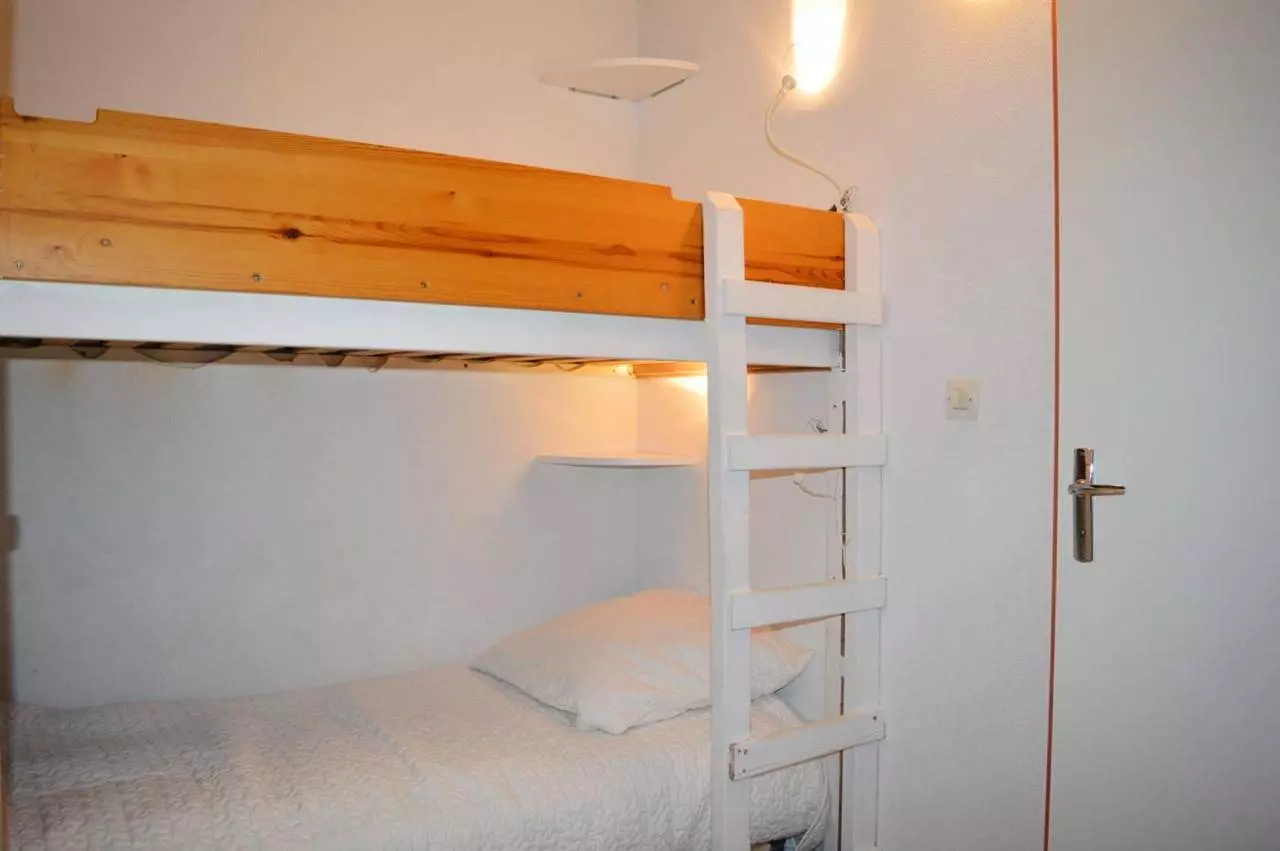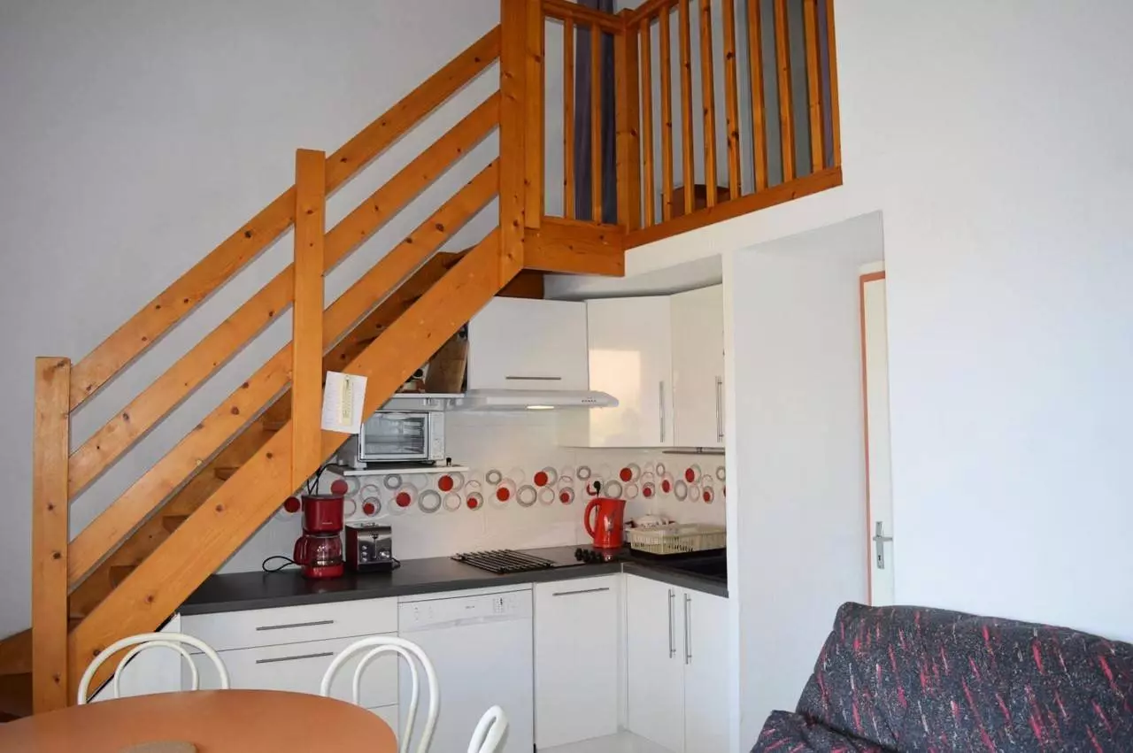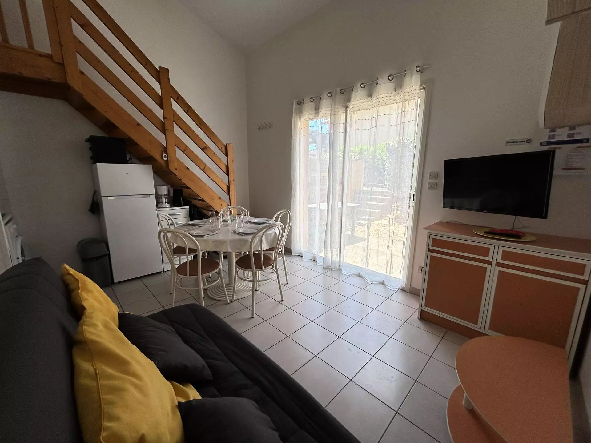 Ce logement de vacances à la mer est composé d'un séjour avec banquette et télévision (sous réserve d'une bonne réception), d'un coin cuisine équipé, d'une chambre avec deux lits 1 personne et d' une salle d'eau avec WC. A l'étage se trouve une chambre avec un lit 2 personnes et une mezzanine comprenant deux lits superposés 1 personne.