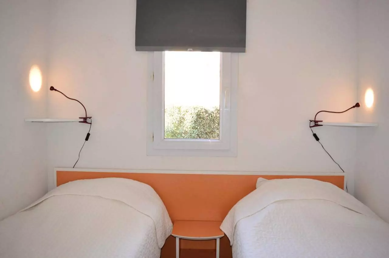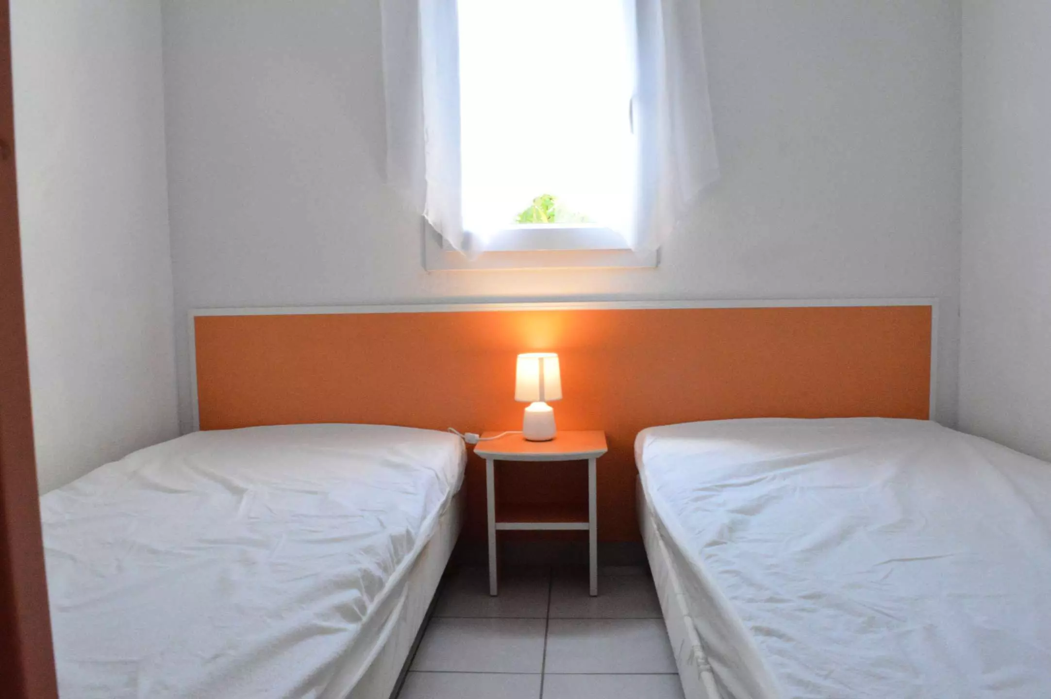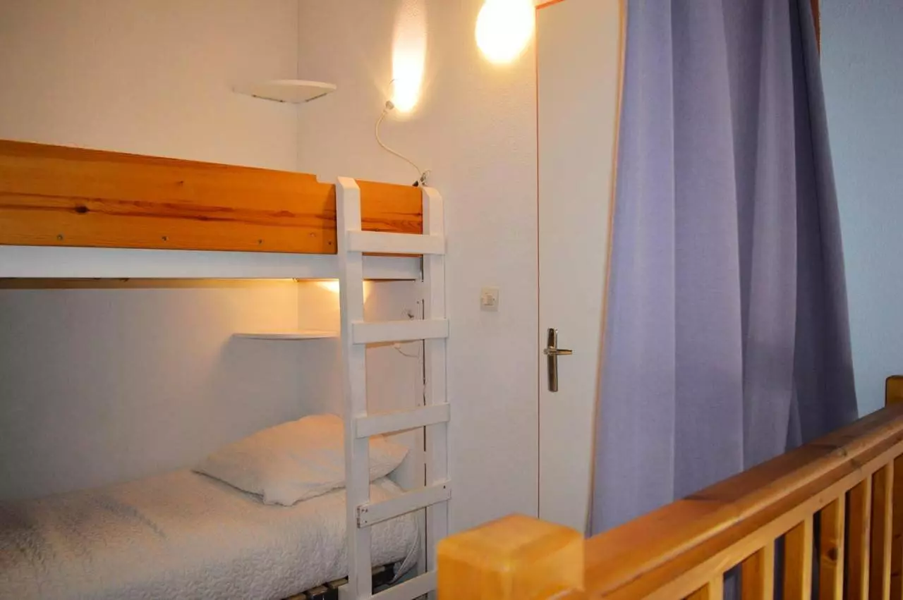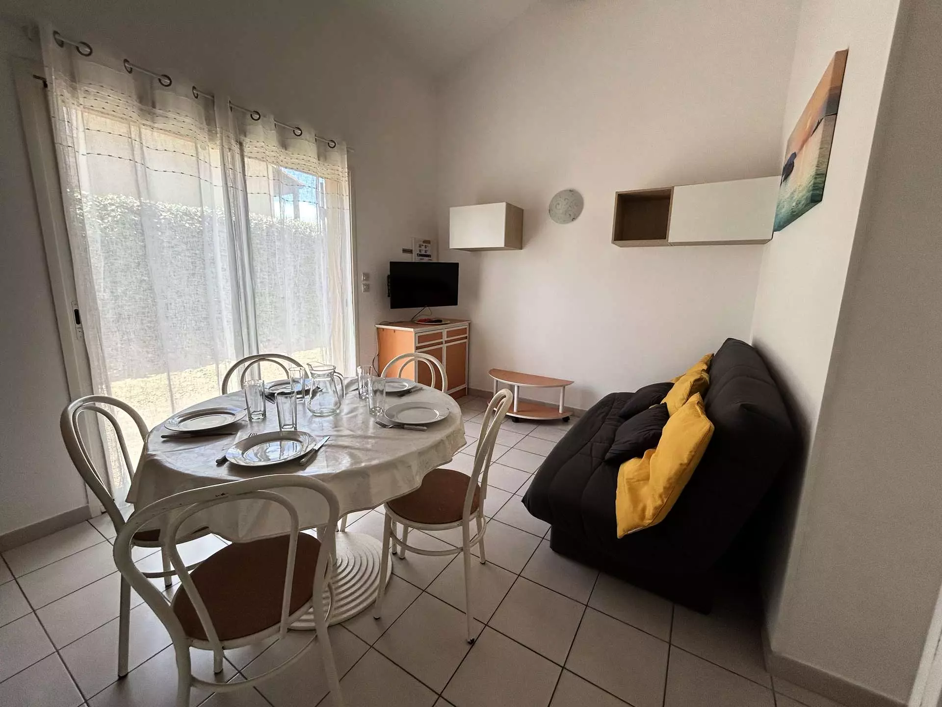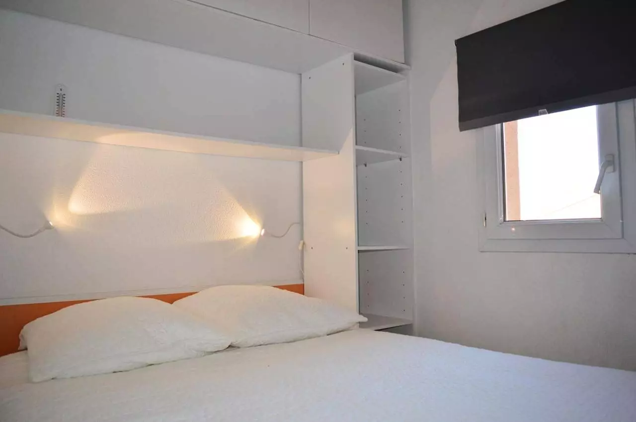 Ce logement de vacances à la mer est composé d'un séjour avec banquette et télévision (sous réserve d'une bonne réception), d'un coin cuisine équipé, d'une chambre avec deux lits 1 personne et d' une salle d'eau avec WC. A l'étage se trouve une chambre avec un lit 2 personnes et une mezzanine comprenant deux lits superposés 1 personne.