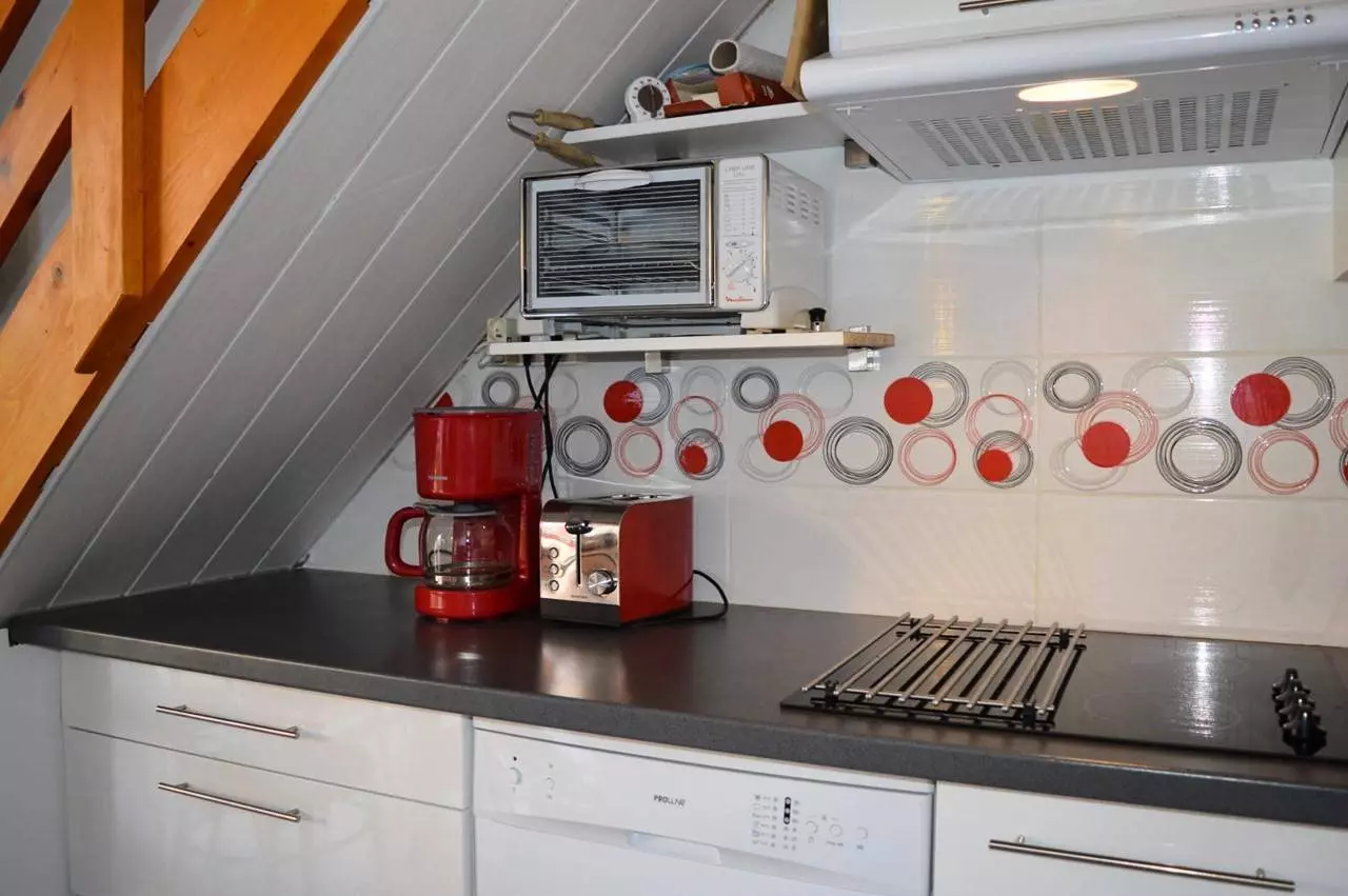 Ce logement de vacances à la mer est composé au rez de chaussé d'un séjour avec banquette et télévision (sous réserve d'une bonne réception), d'un coin cuisine, d'une chambre avec un lits 2 personne et d' une salle de douche avec WC. A l'étage se trouve une chambre avec deux lit simple et une mezzanine comprenant un lit 1 personne.