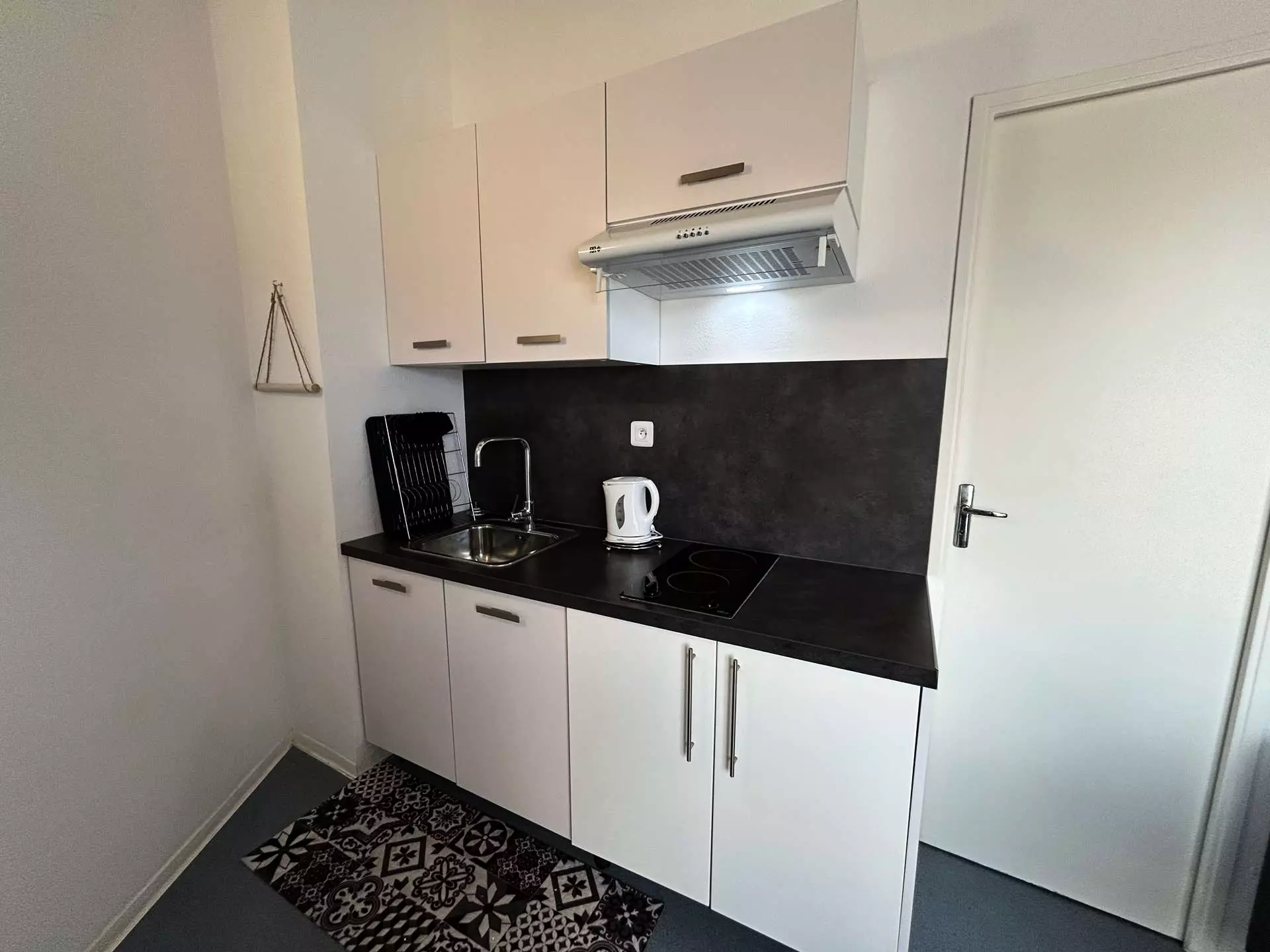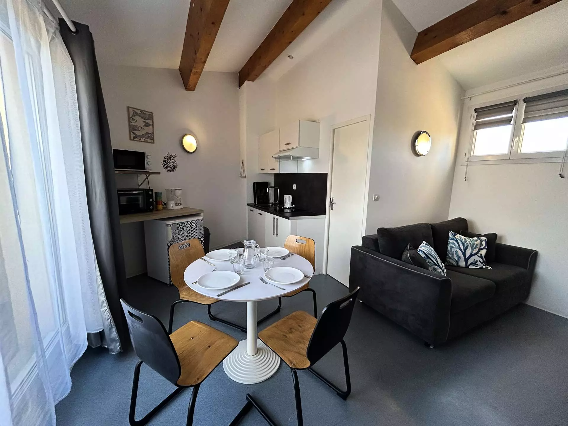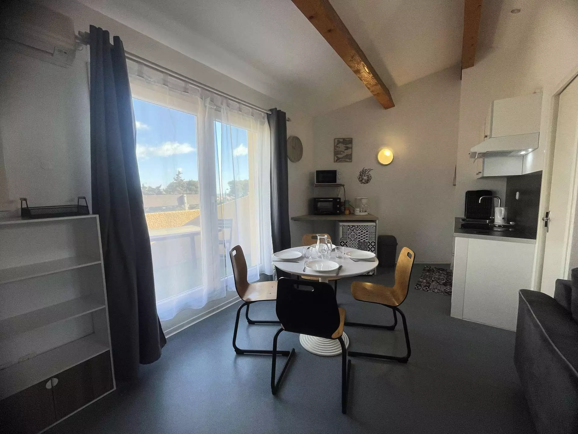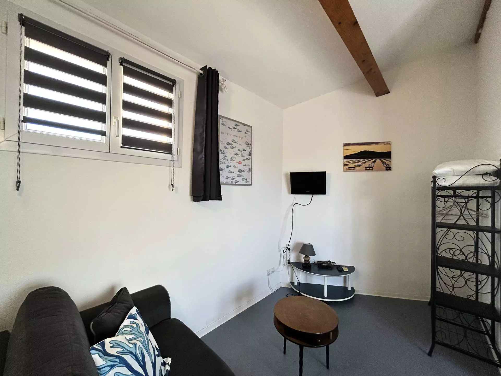 Ce logement de vacances à la mer est composé d'un séjour avec un canapé convertible et télévision (sous réserve d'une bonne réception), d'un coin cuisine, d'une salle d'eau avec WC et d'un balcon.