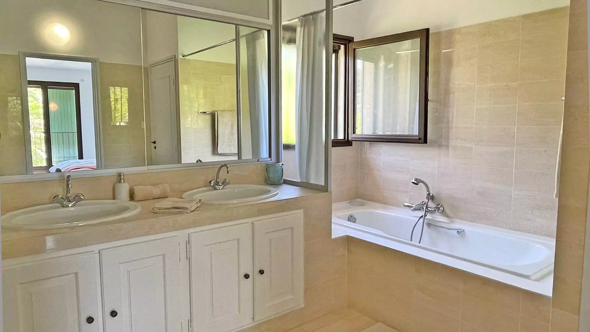• Suite parentale avec lit double King Size 180x200cm, placards, espace bureau, vue sur le jardin, et salle de bains avec baignoire, douche, meuble double vasque, WC