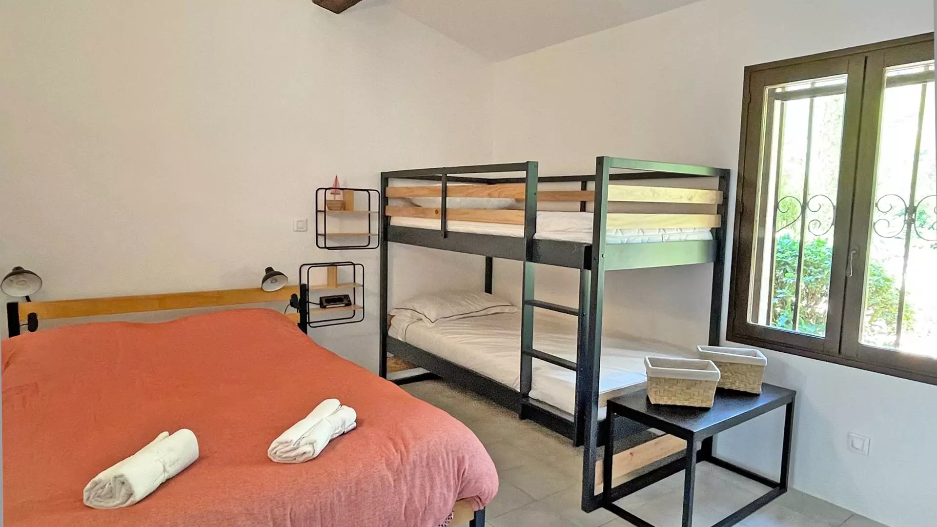 • Chambre 2 : lit double 140x200cm et lits superposés 2x90, placards, salle de douche et WC en suite