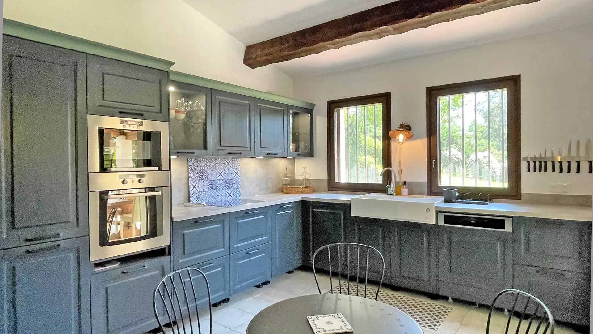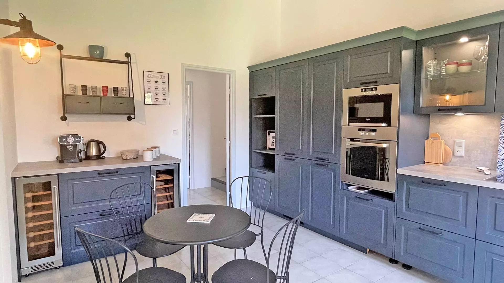 • Cuisine entièrement équipée : réfrigérateur / congélateur, plaques de cuisson 4 feux vitrocéramique, cafetière électrique type "Barista", bouilloire, grille pain, four, micro-ondes, lave-vaisselle, vaisselles et ustensiles divers