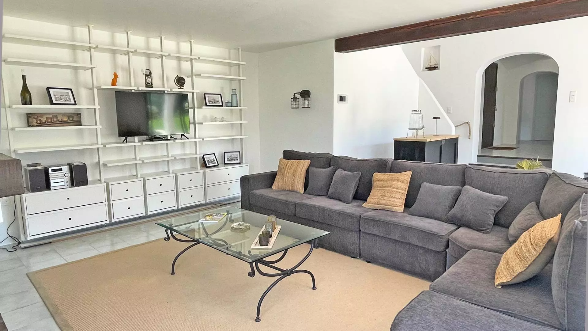 • Salon avec grand canapé panoramique, télévision, chaine HiFi, cheminée décorative