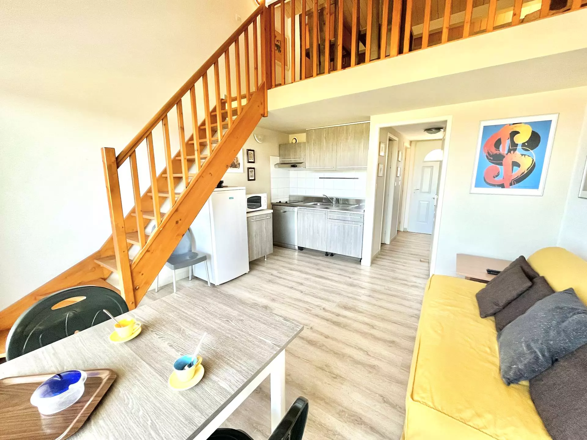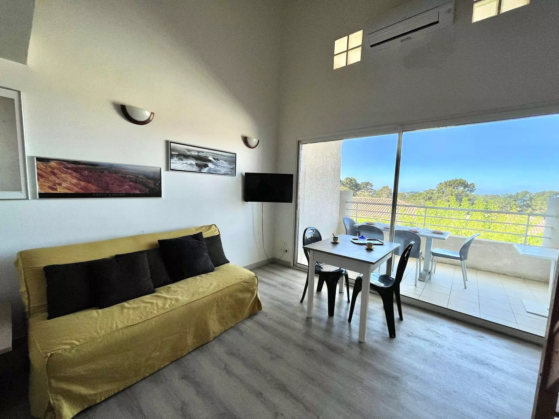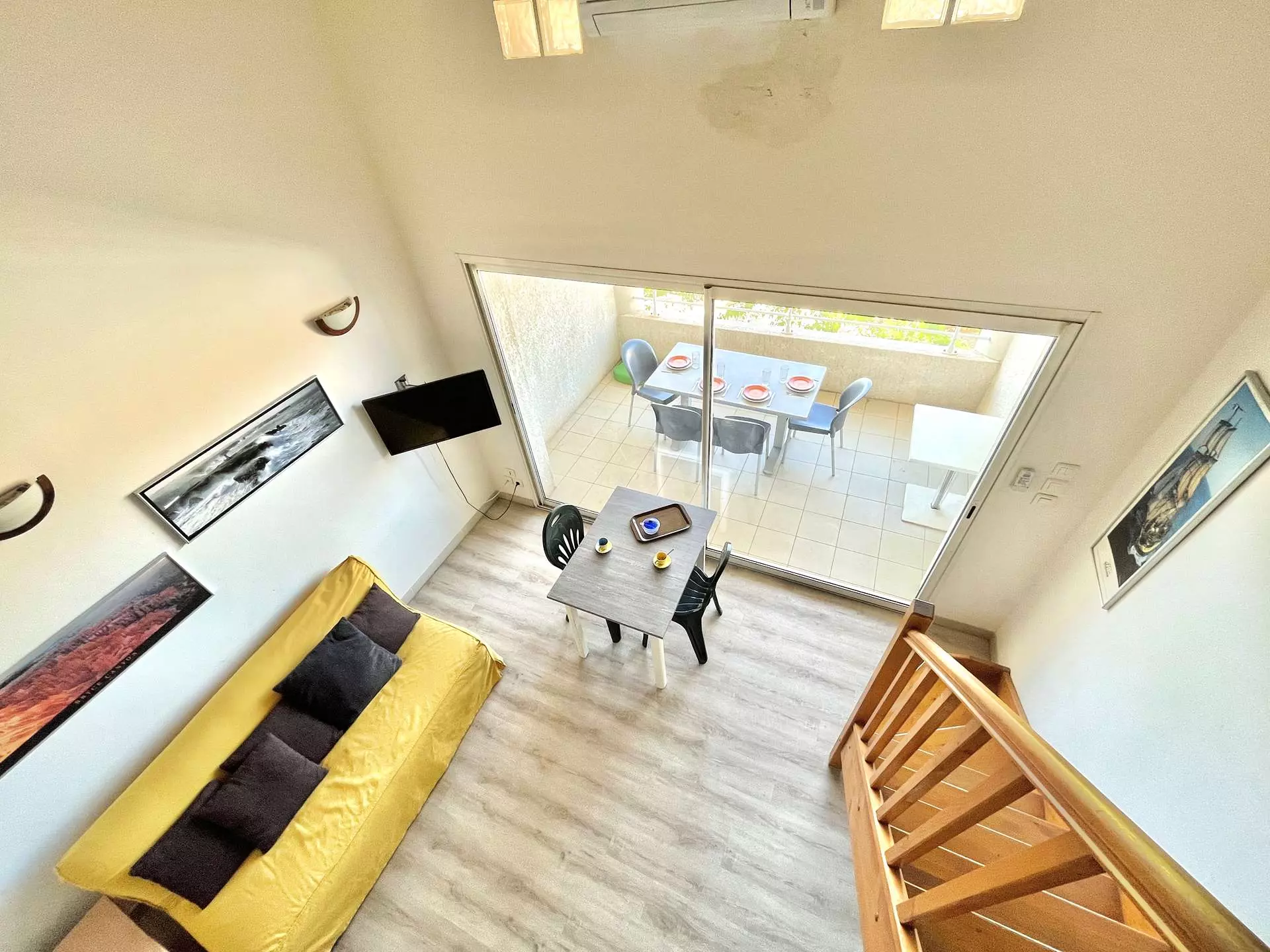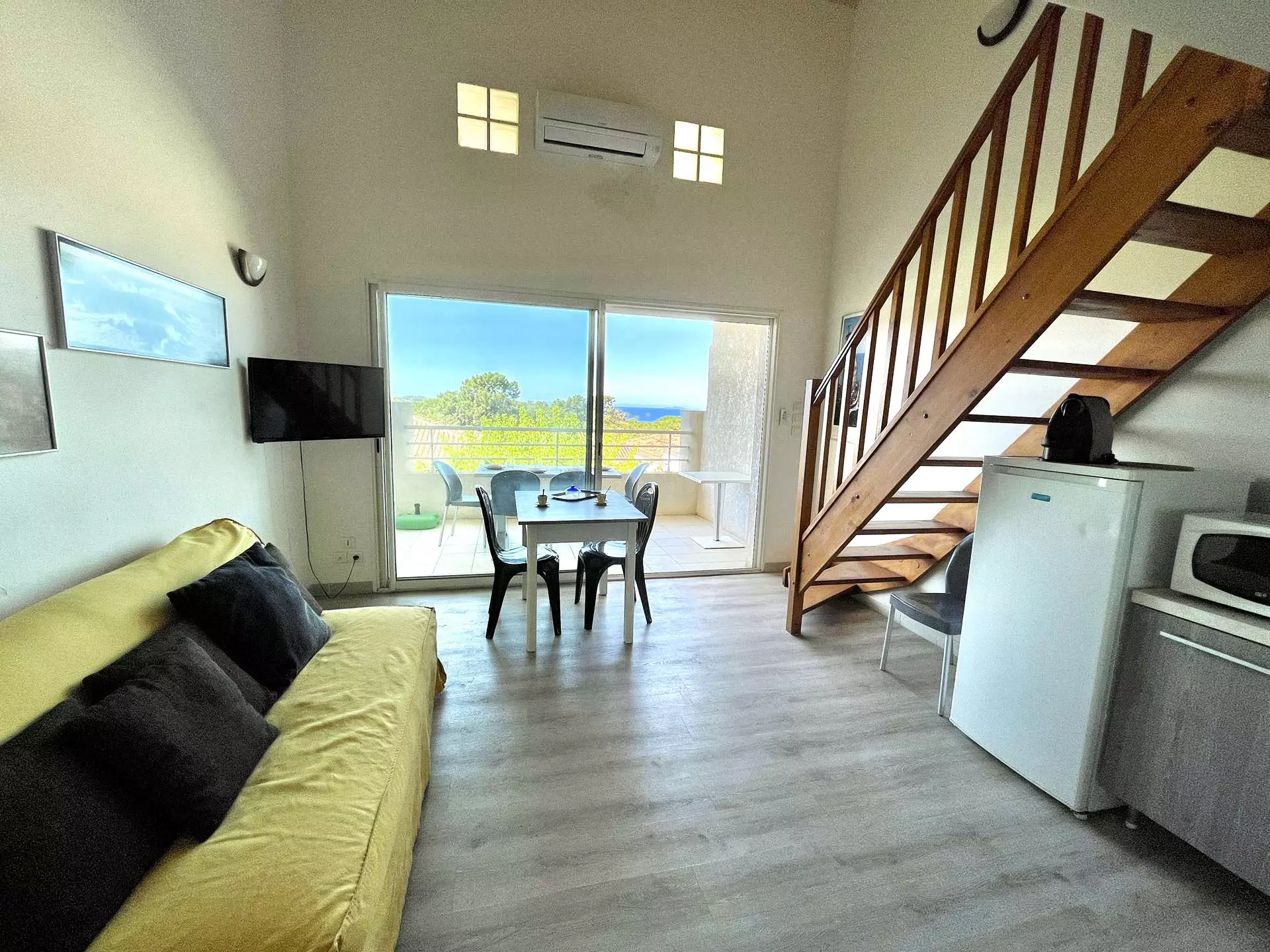 Cet appartement climatisé d'une superficie d'environ 40m² se compose comme suit: une entrée avec rangements, une cuisine ouverte sur le salon climatisé et équipé d'un canapé convertible pour 2 personnes, le tout donnant sur la terrasse vue mer, une salle d'eau, un wc indépendant, et une mezzanine équipée d'un lit double en 160 avec rangements.
