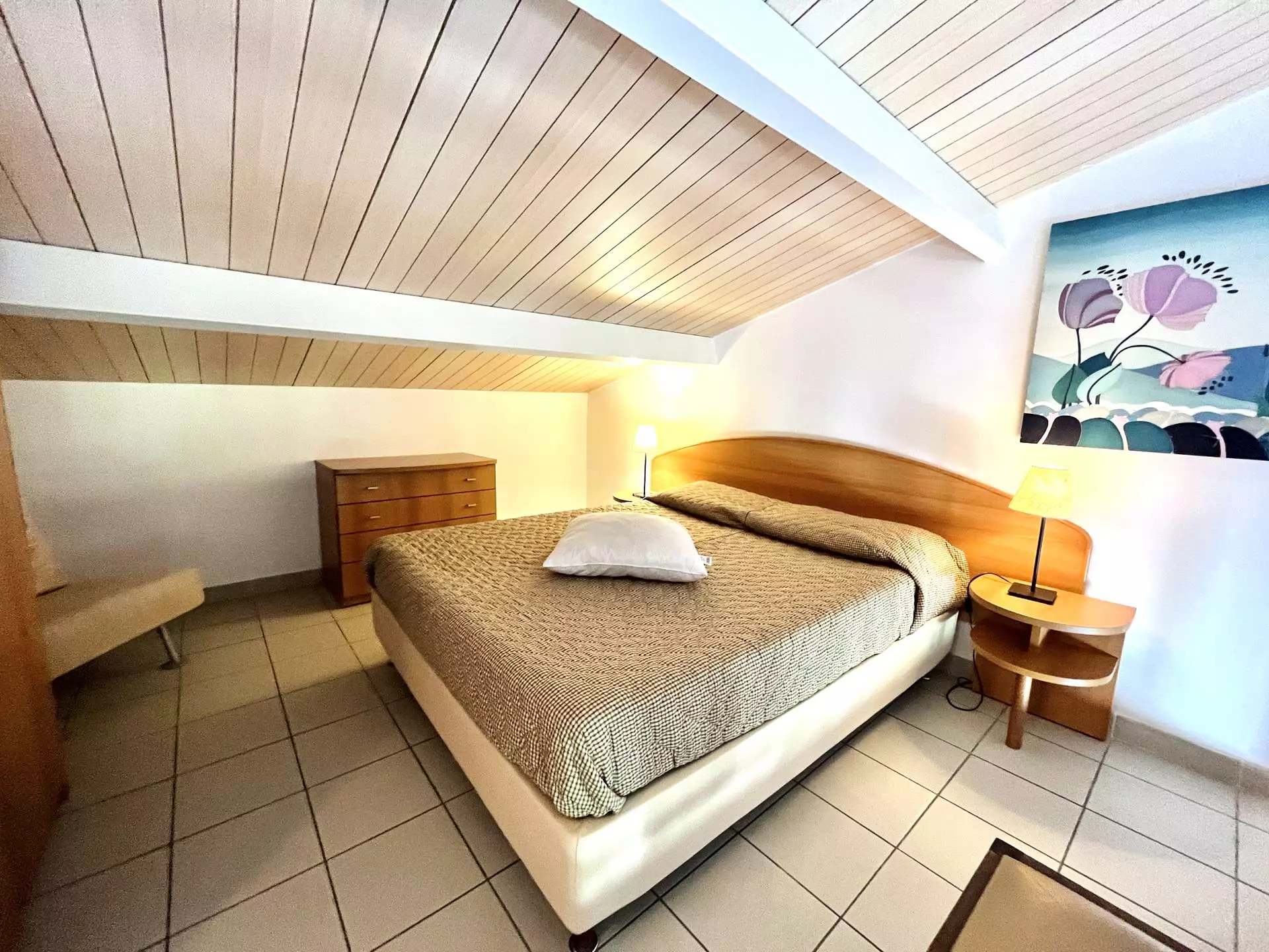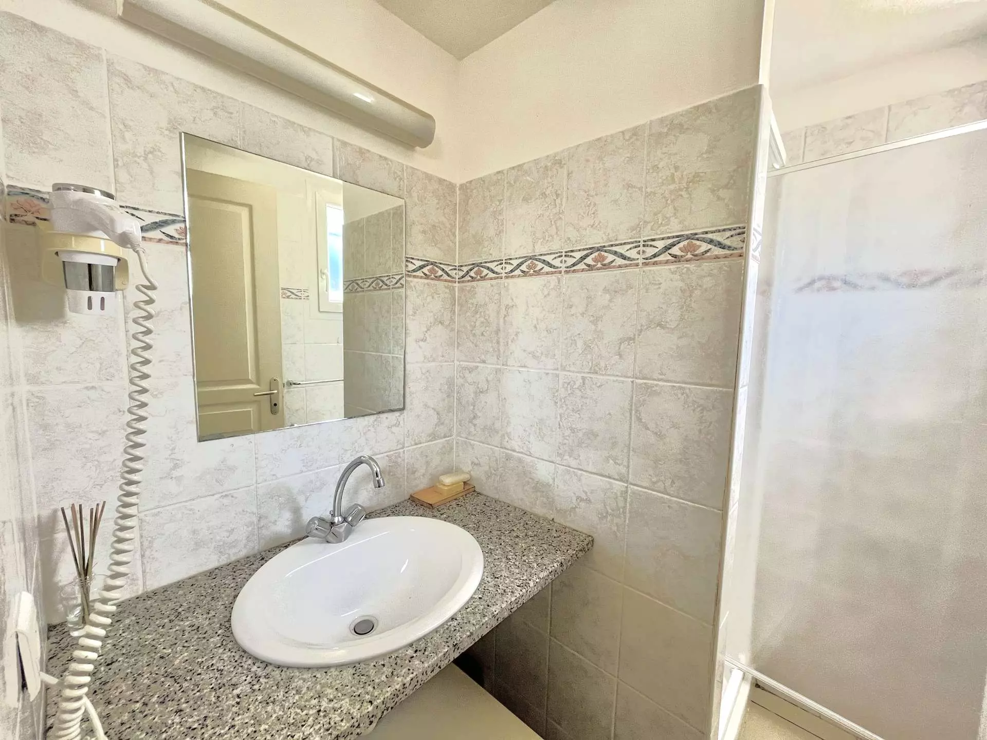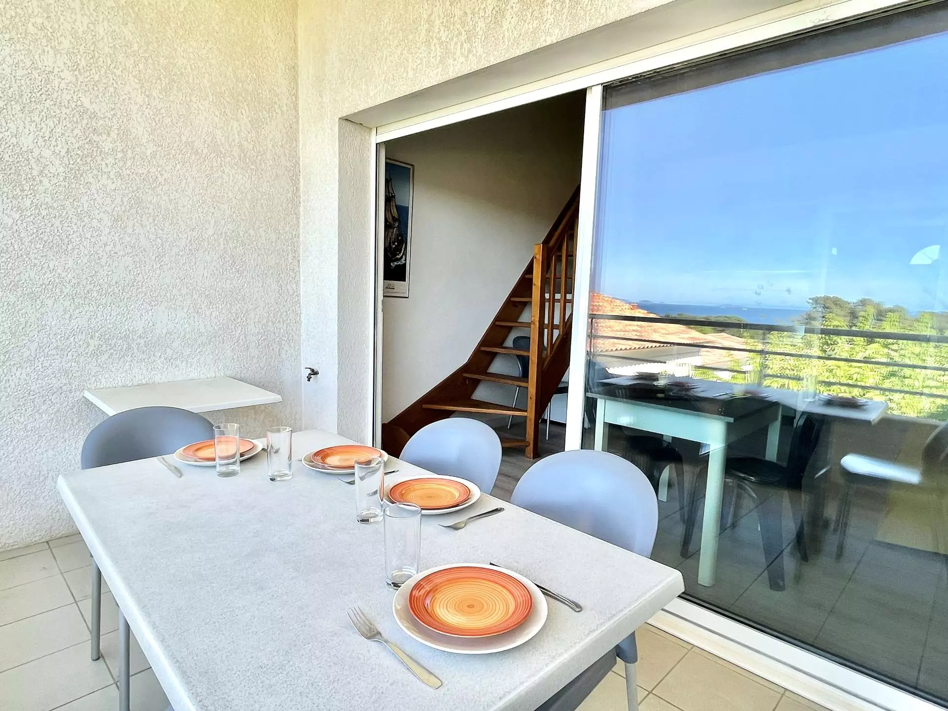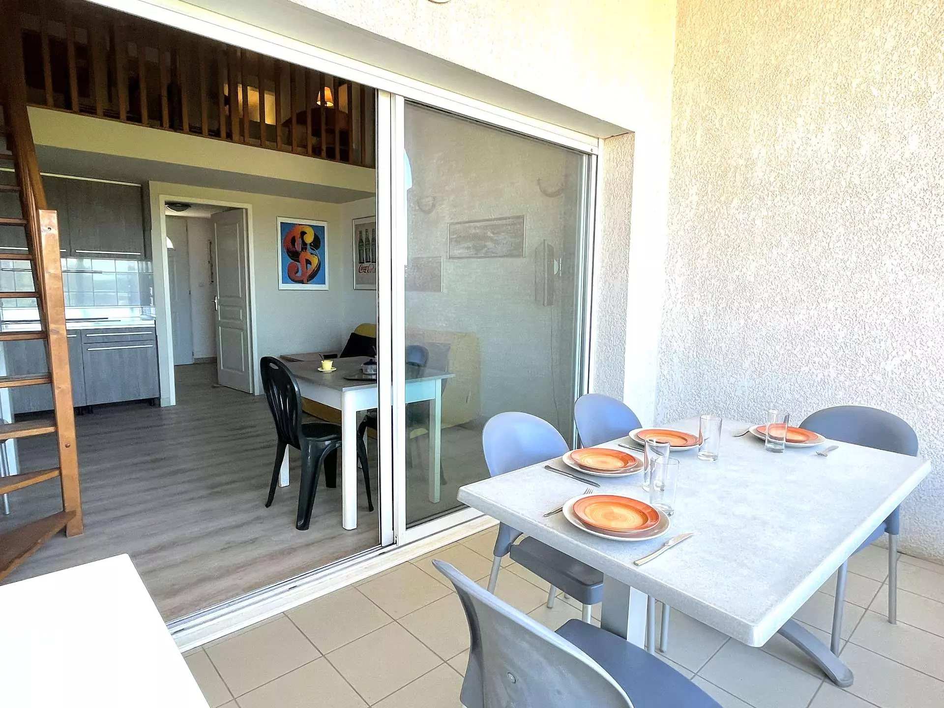 Cet appartement climatisé d'une superficie d'environ 40m² se compose comme suit: une entrée avec rangements, une cuisine ouverte sur le salon climatisé et équipé d'un canapé convertible pour 2 personnes, le tout donnant sur la terrasse vue mer, une salle d'eau, un wc indépendant, et une mezzanine équipée d'un lit double en 160 avec rangements.