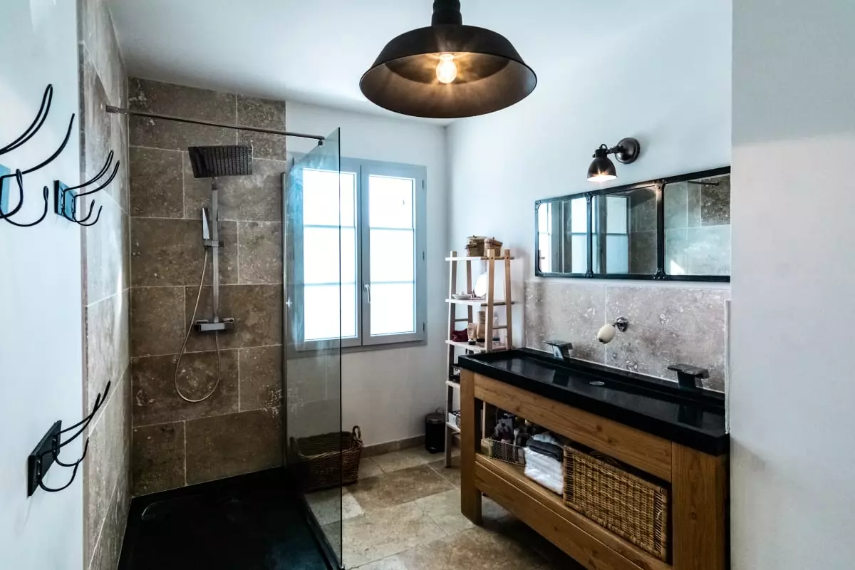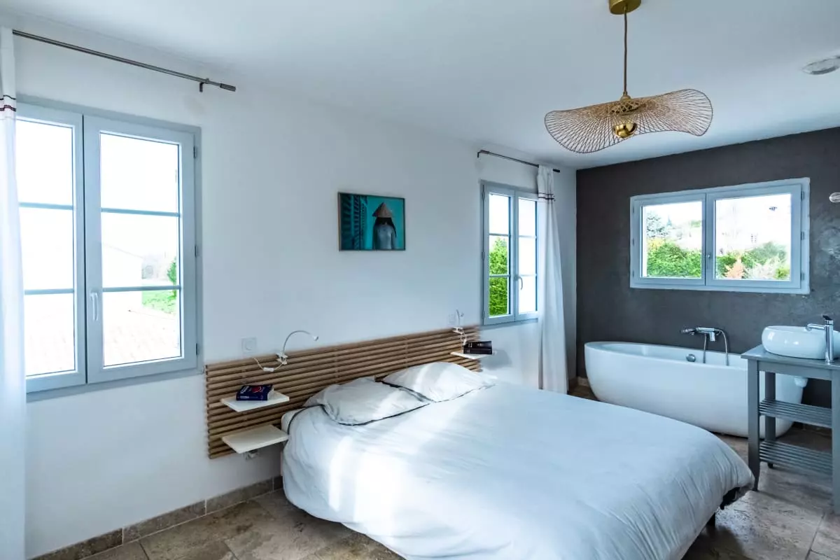 A l'étage, 3 chambres et deux salles de bains modernes. La maison est équipée du WiFi, de la TV et de tout le matériel nécessaire pour cuisiner.