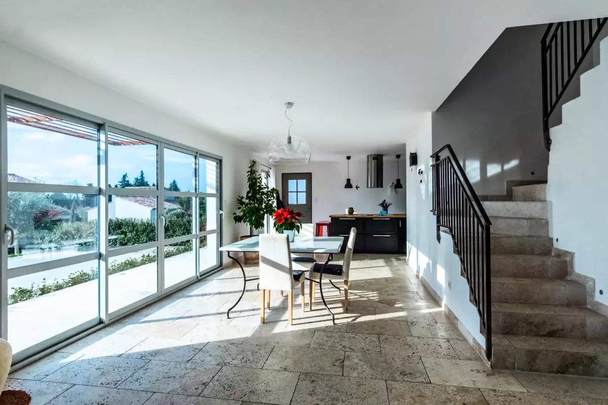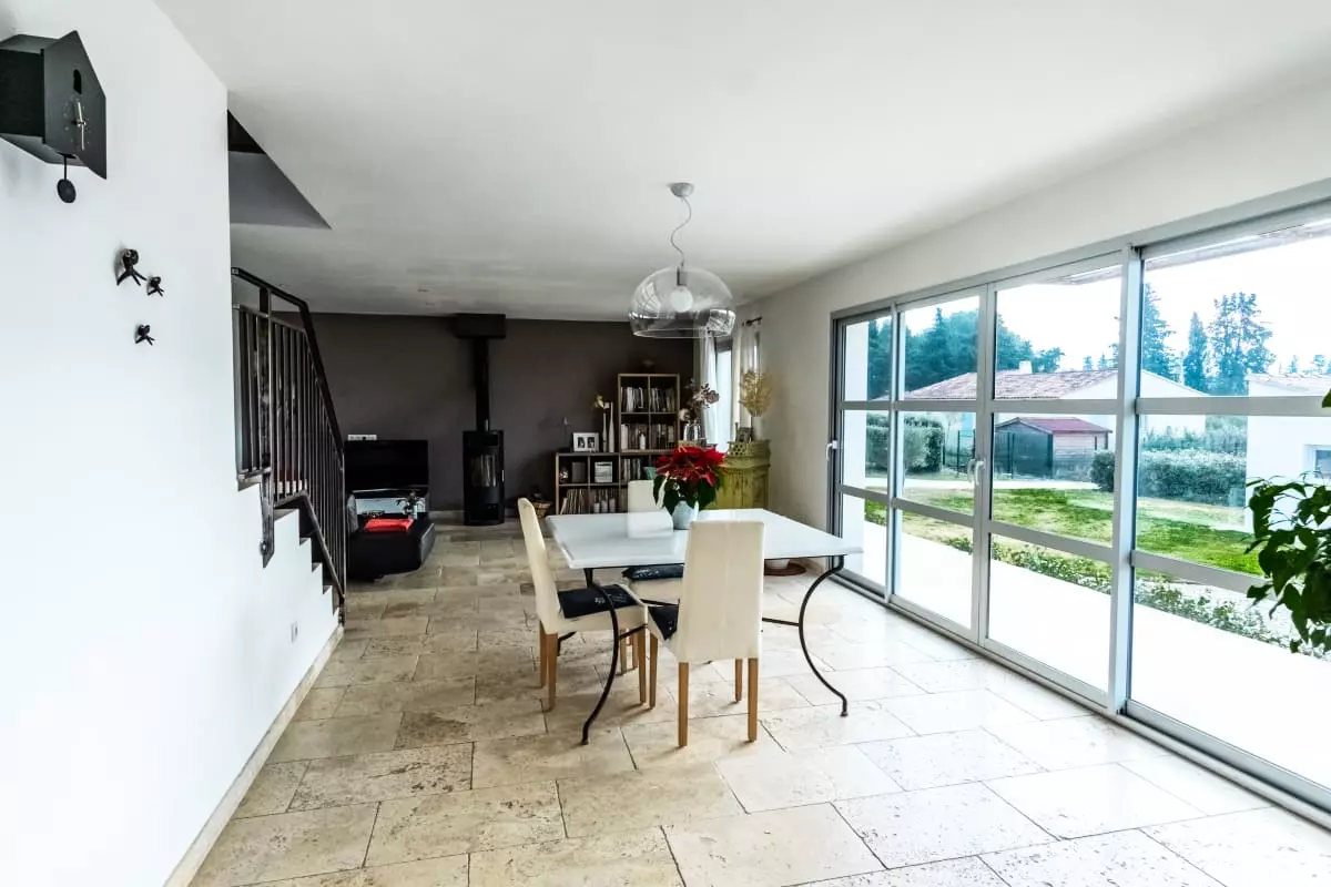 Au rez-de-chaussée, un séjour spacieux et agréable avec les baies vitrées donnant sur la piscine. Une cuisine neuve avec ilot central complète cette belle pièce.