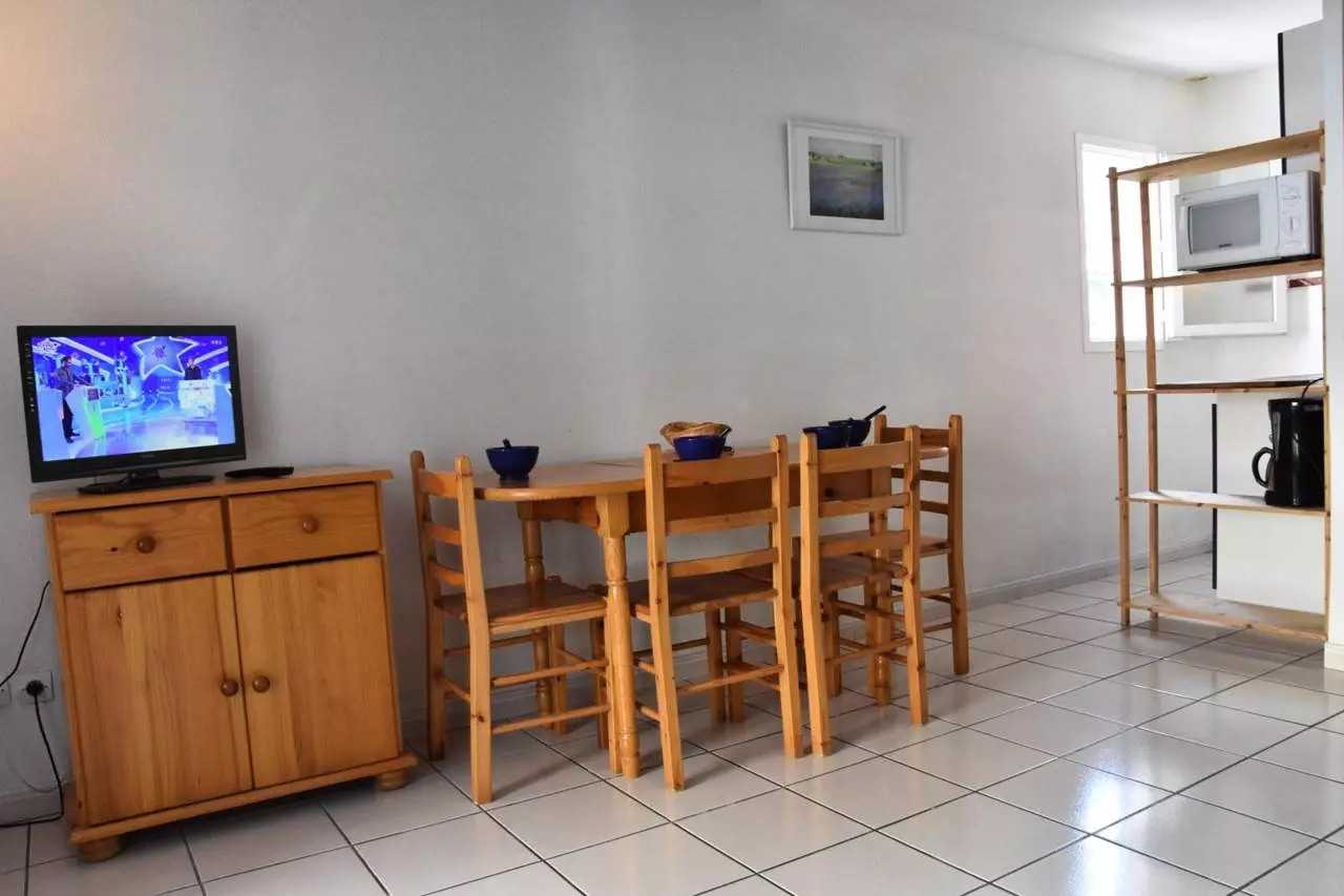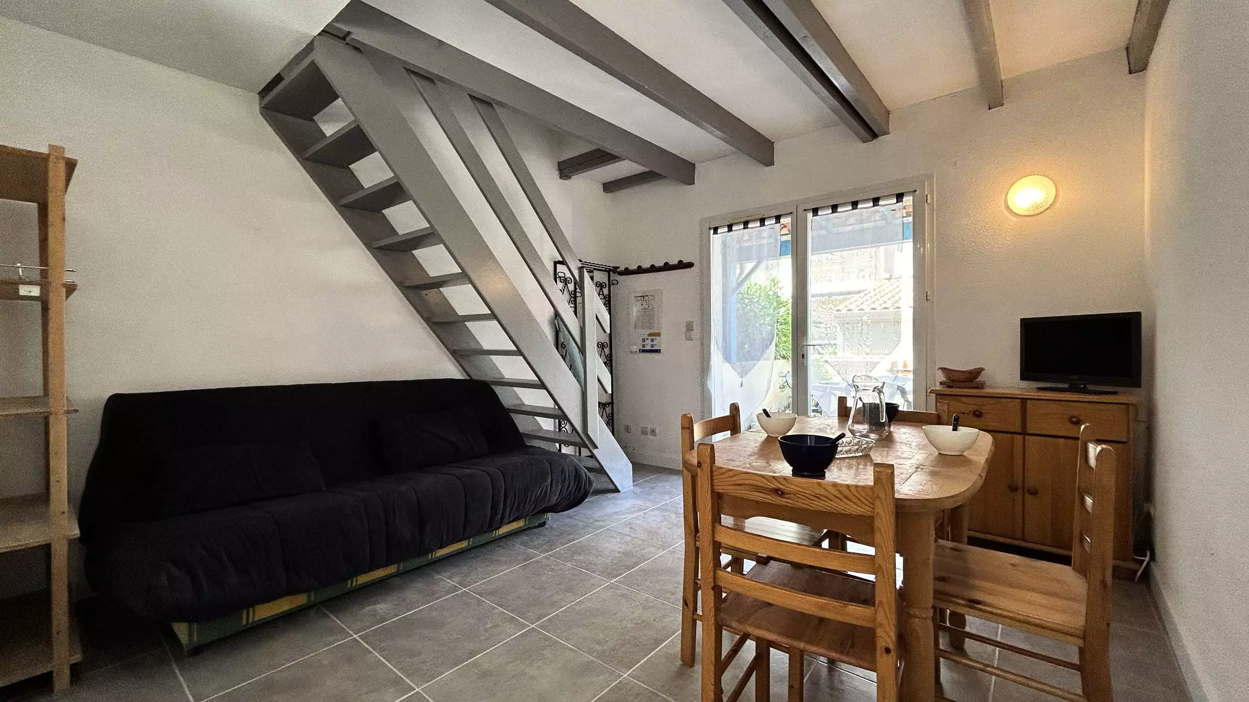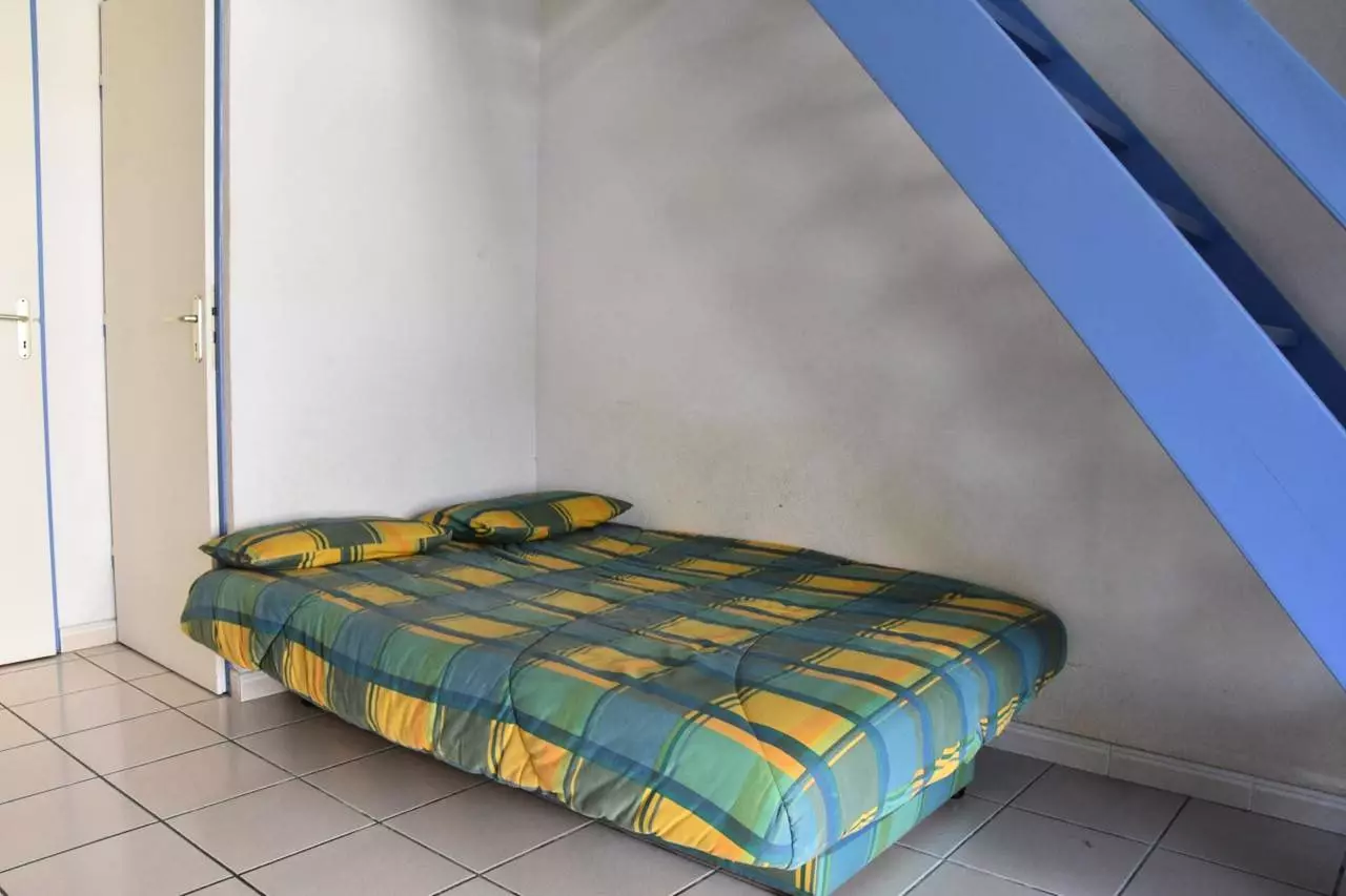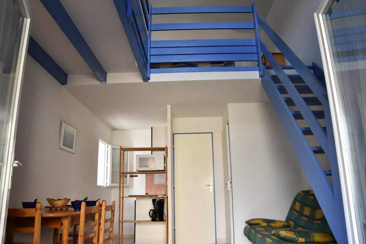 Ce Pavillon de vacances entièrement rénové comprend une terrasse bien exposée , une pièce principale où ce situe le clic-clac (couchage 140*190) , une table en pin avec ces chaises coordonnées et TV, une kitchenette, lave-linge , frigo-congélateur, sur la mezzanine ce trouve 1 espace nuit avec 2 lits séparables en 90*190 ainsi qu'une chambre équipée d'un lit double 140x190 .