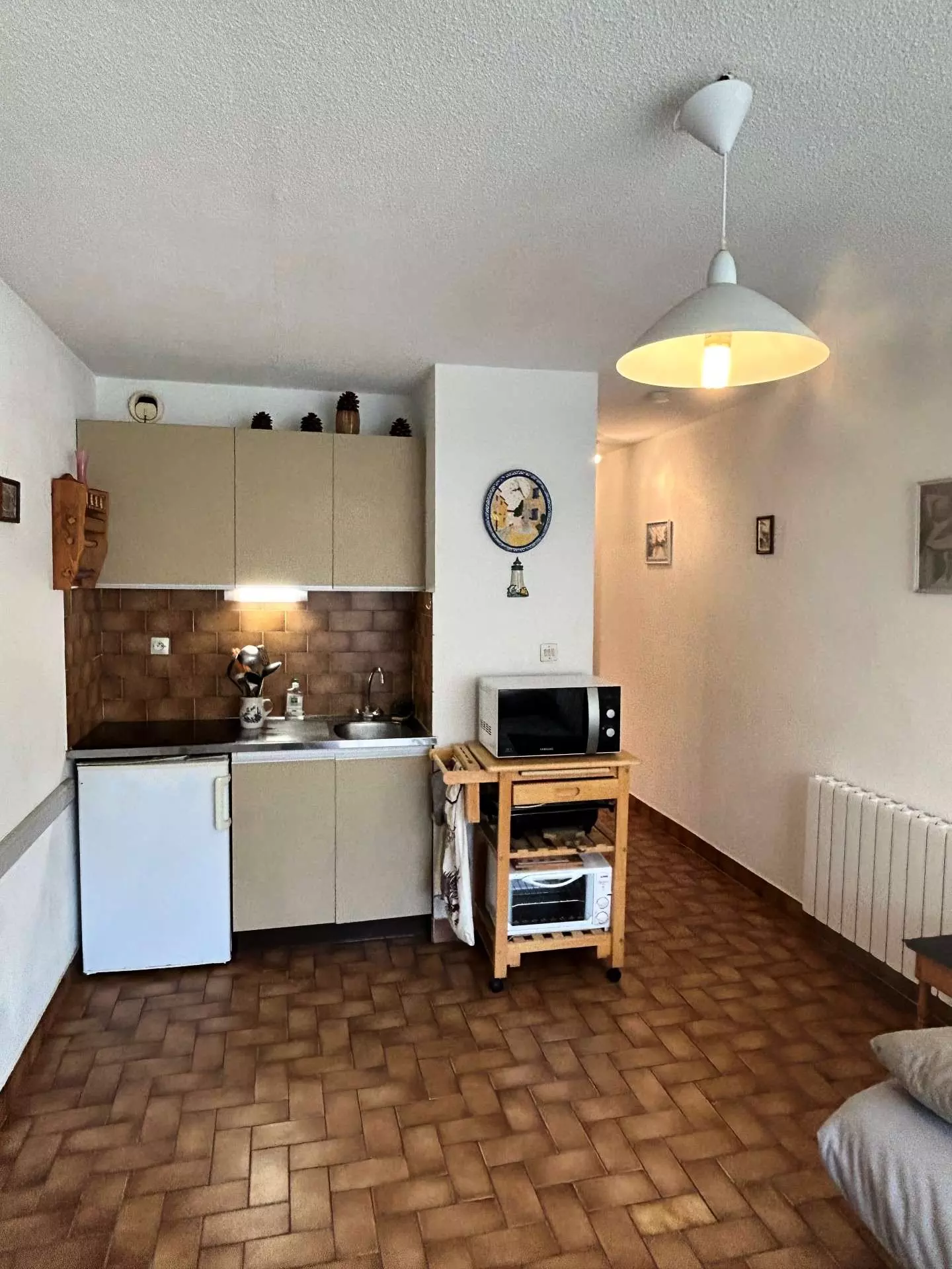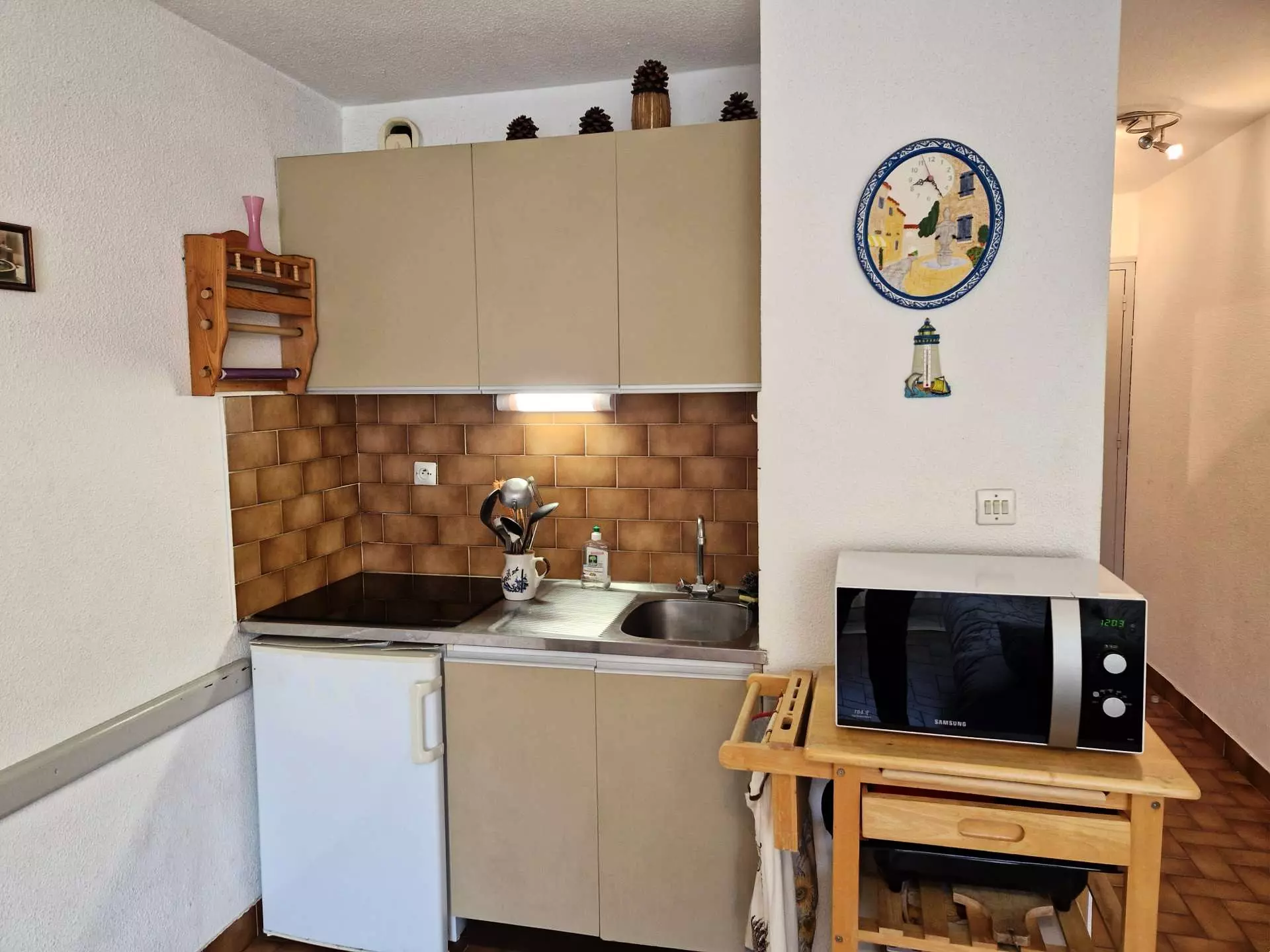 Coin cuisine équipé avec réfrigérateur/congélateur, plaque vitrocéramique, micro ondes, cafetière électrique, bouilloire électrique.