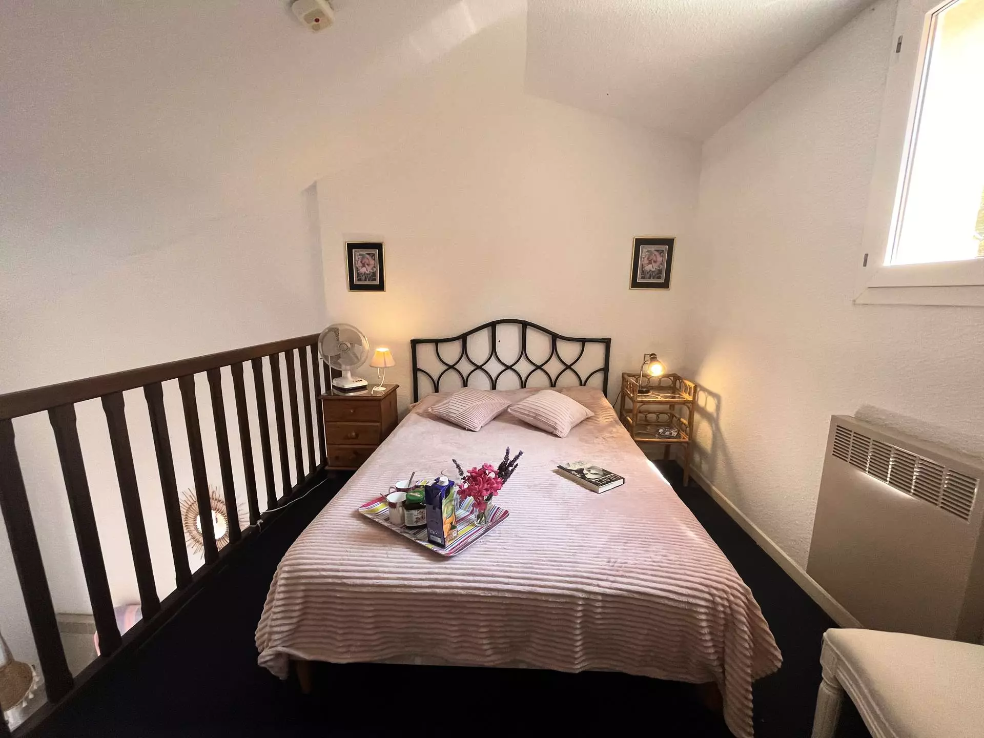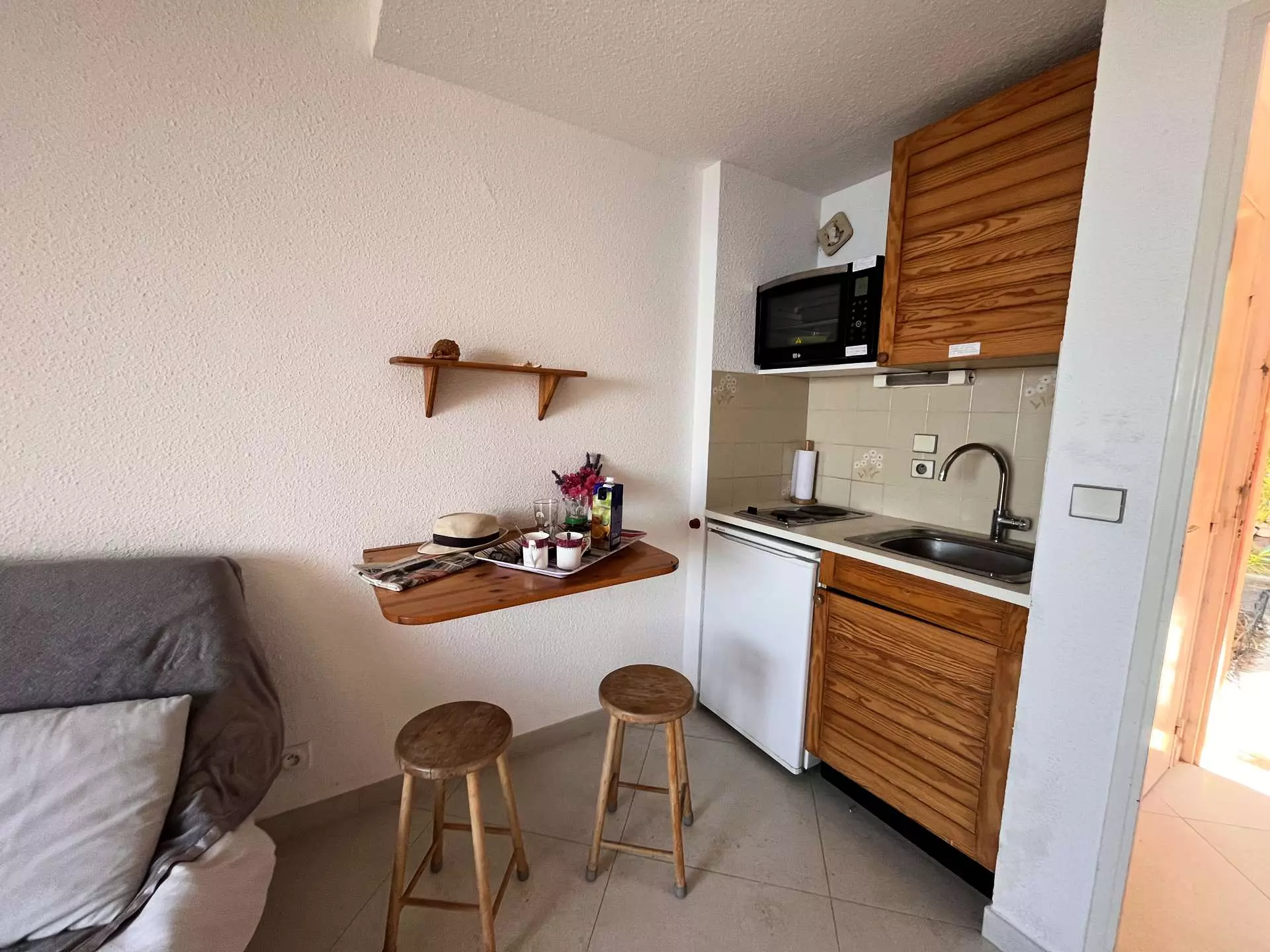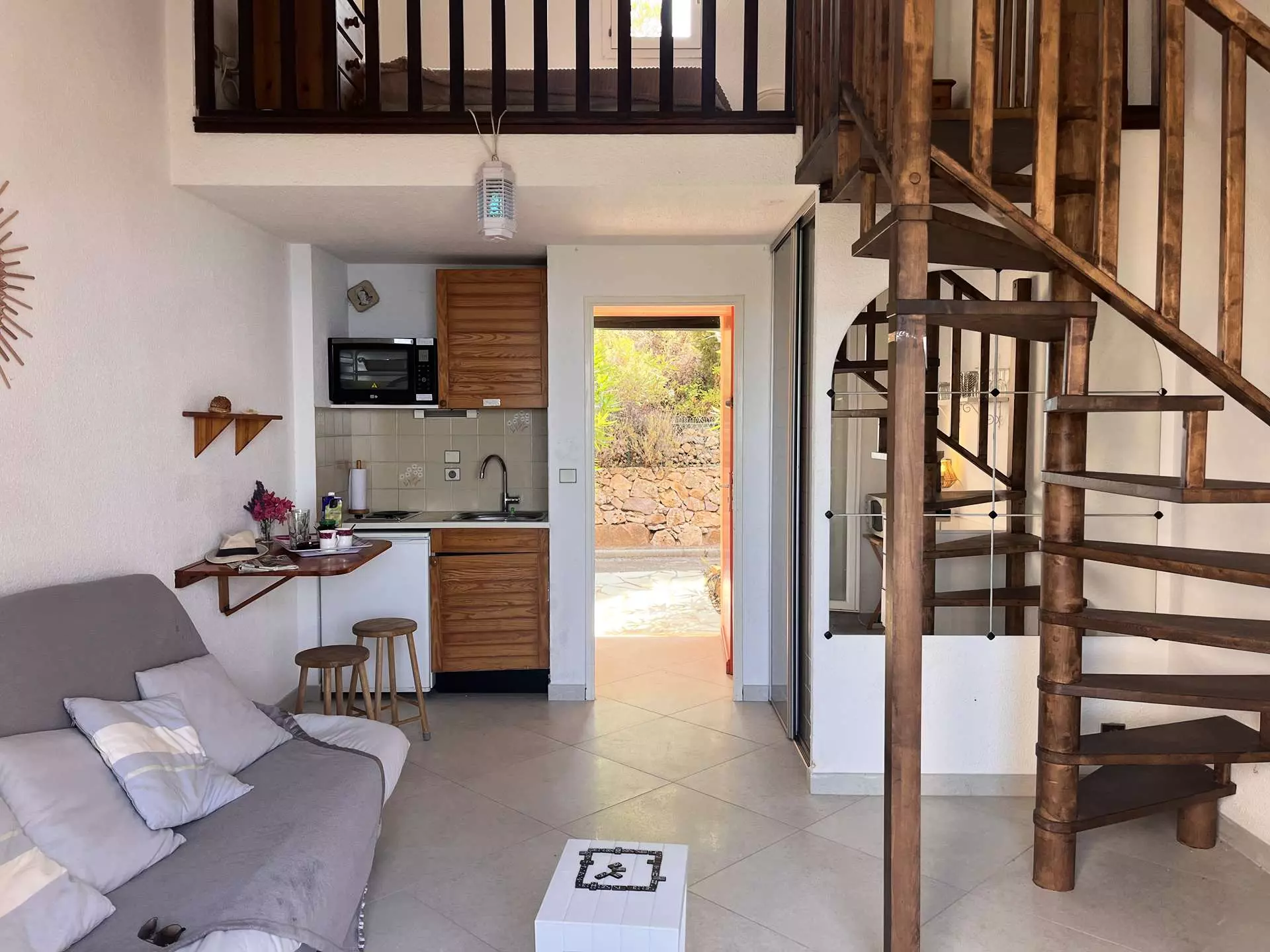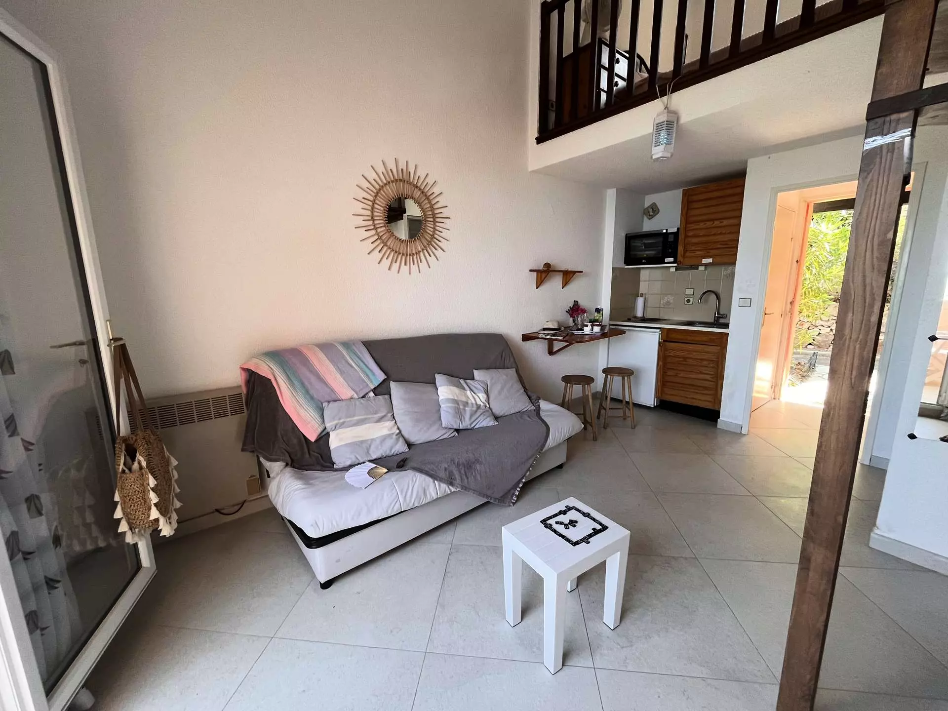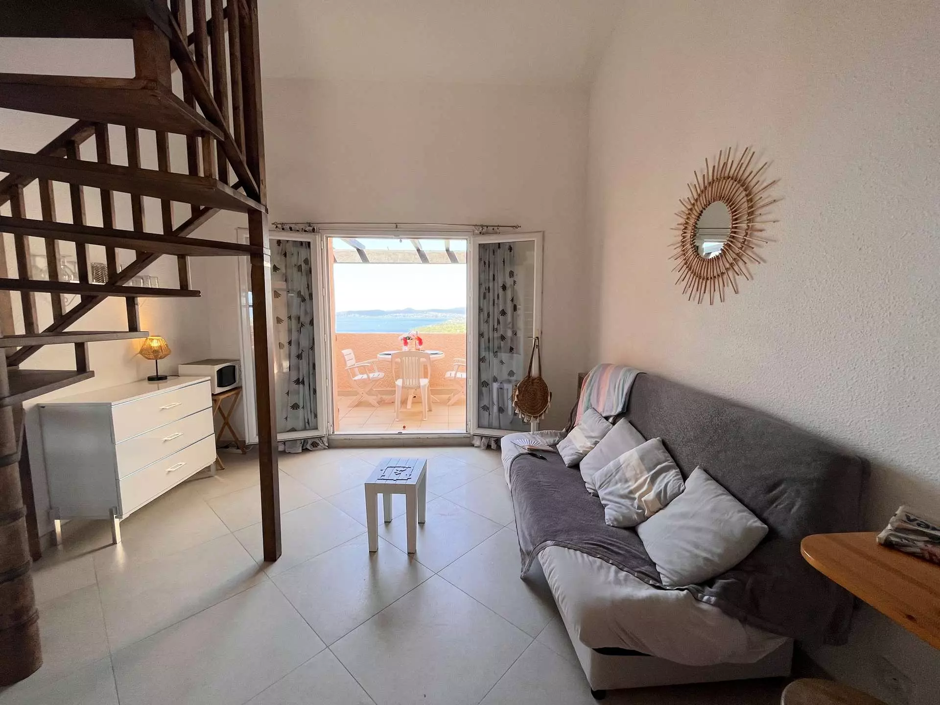 Cet appartement de vacances comprend un séjour avec un canapé convertible deux places, un coin cuisine équipée, une salle d'eau, un wc indépendant et une mezzanine avec un lit deux personnes. Belle terrasse vue mer.