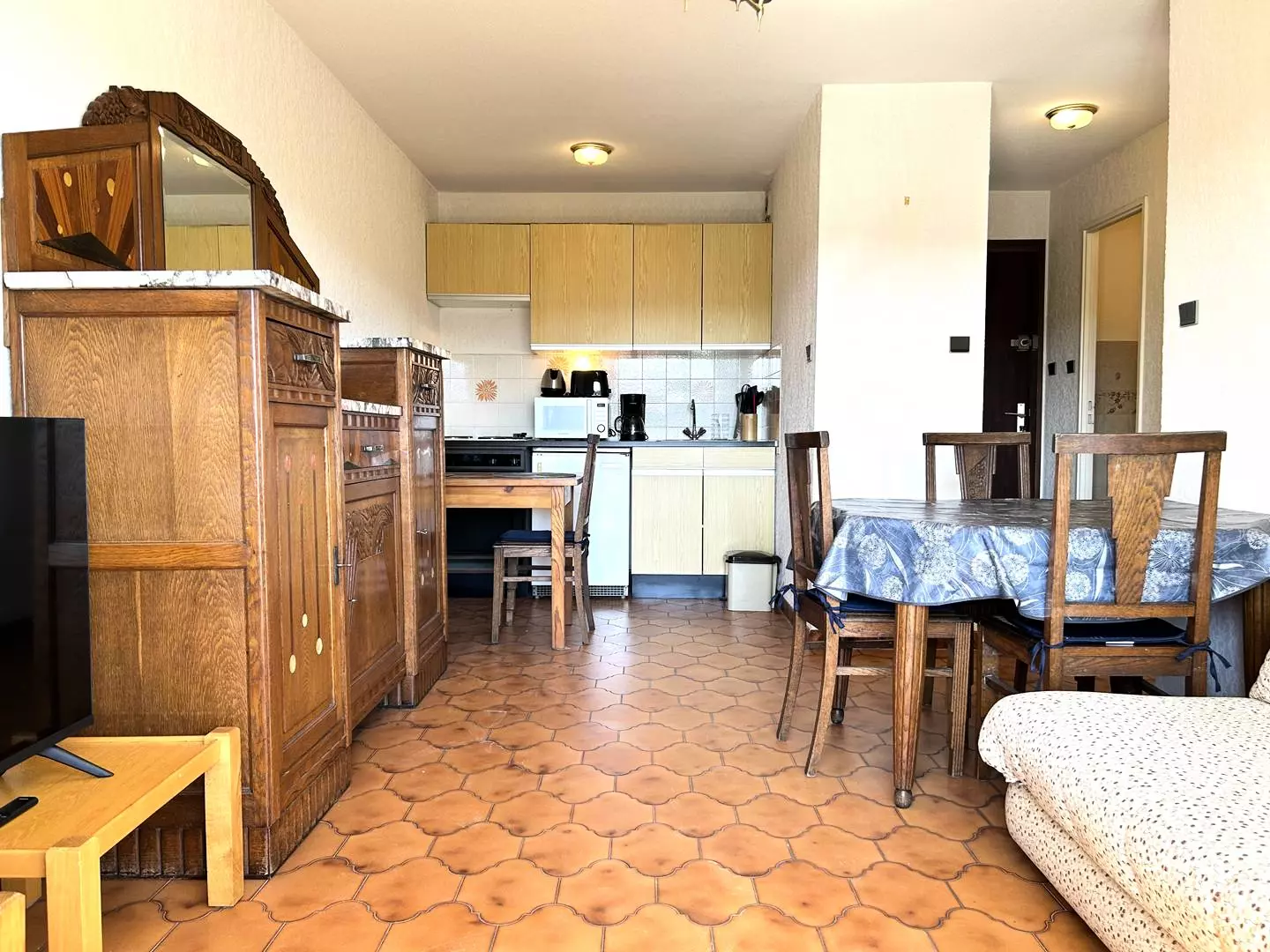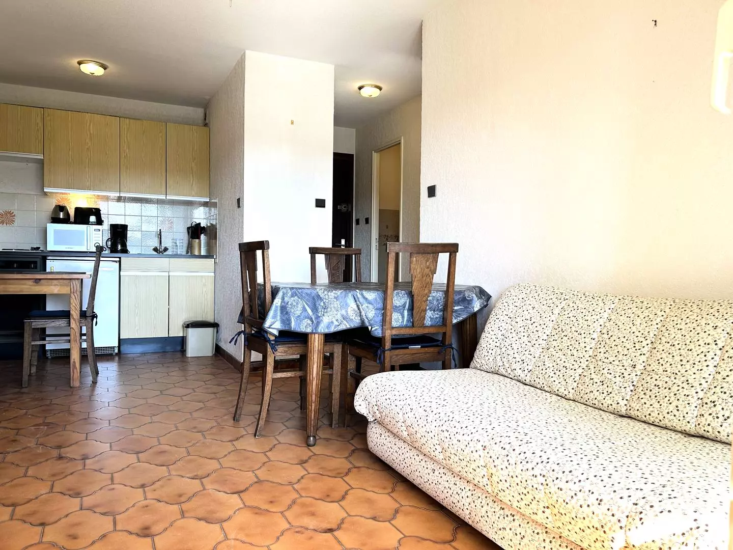 Cette location de vacances offre une grande terrasse avec vue mer, un séjour avec canapé convertible de type chauffeuse conseillée UNIQUEMENT POUR DES ENFANTS, une chambre avec lit double, un coin cuisine ouvert sur le séjour, une salle de bains et un wc indépendant.