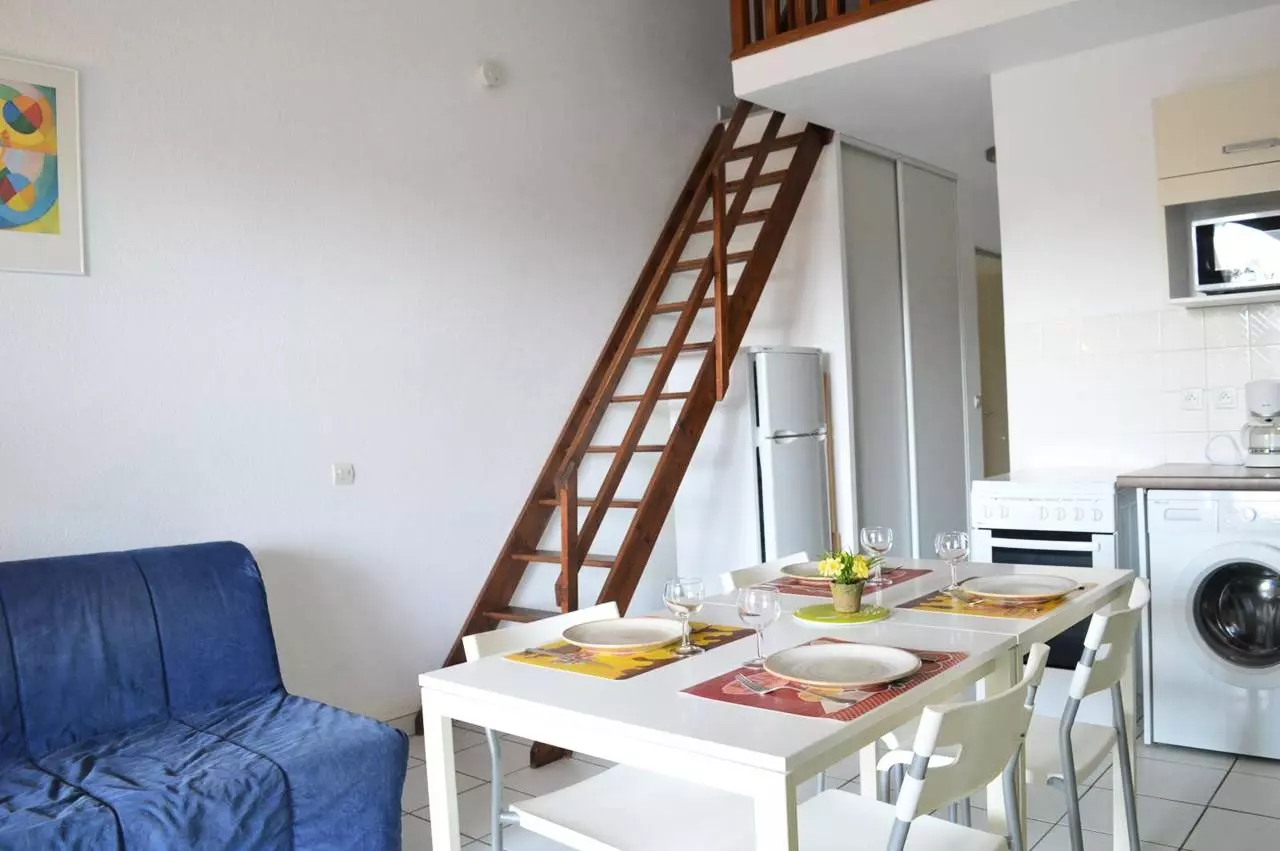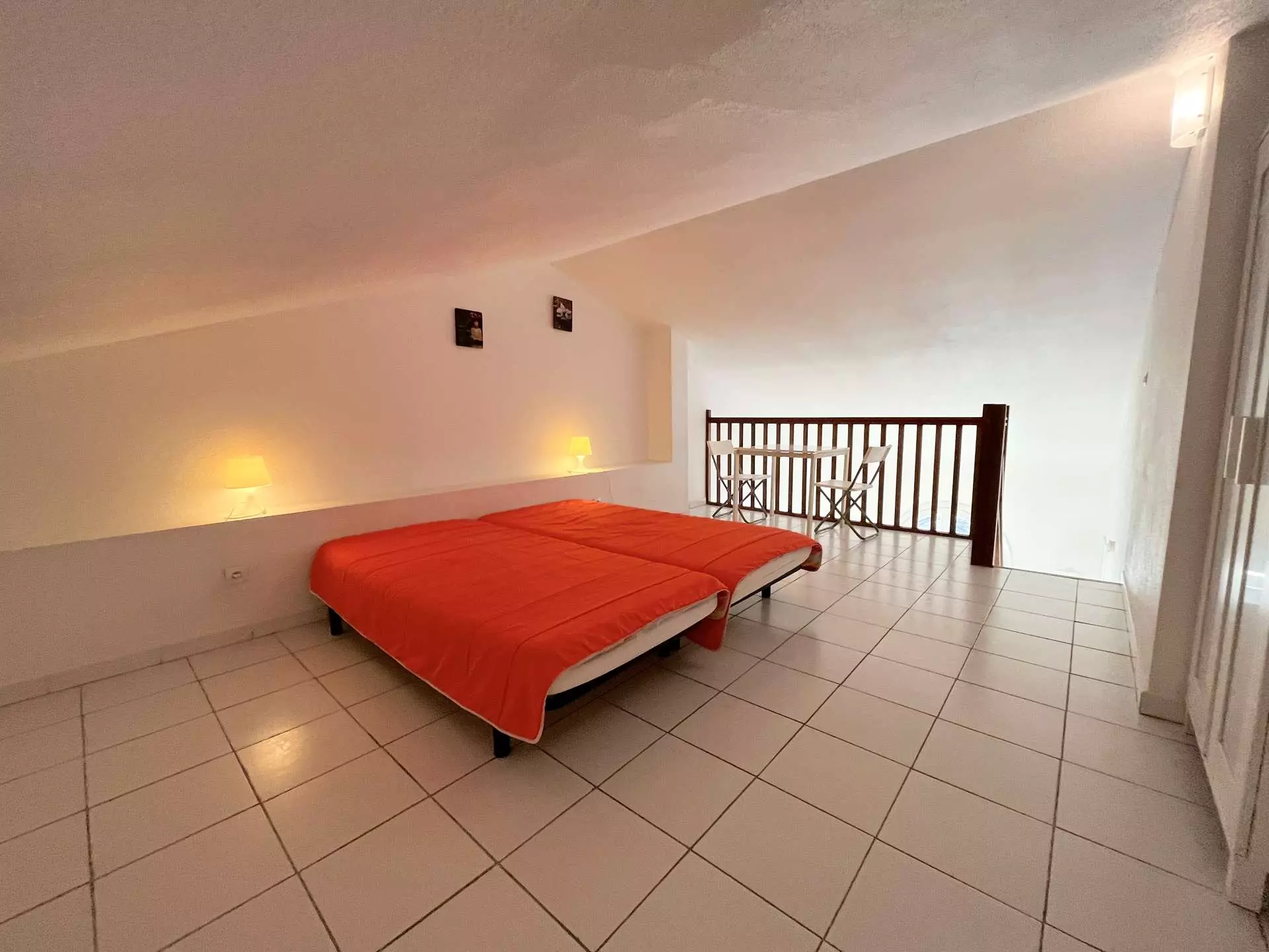 Cet hébergement de vacances, situé au 1er étage se compose d'une entrée, un séjour de 16 m2 avec canapé, une cuisine ouverte équipée, une chambre avec 2 lits 1 place, une mezzanine de 20 m2 avec 2 lits 1 place, une salle de bains avec wc.