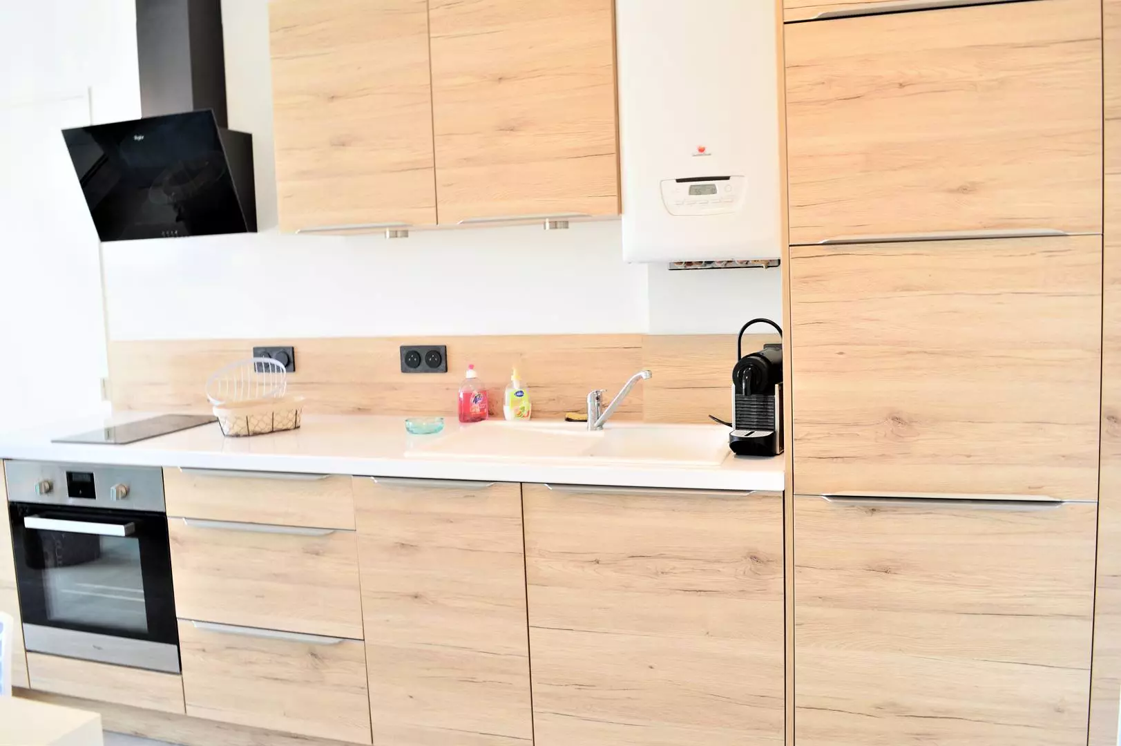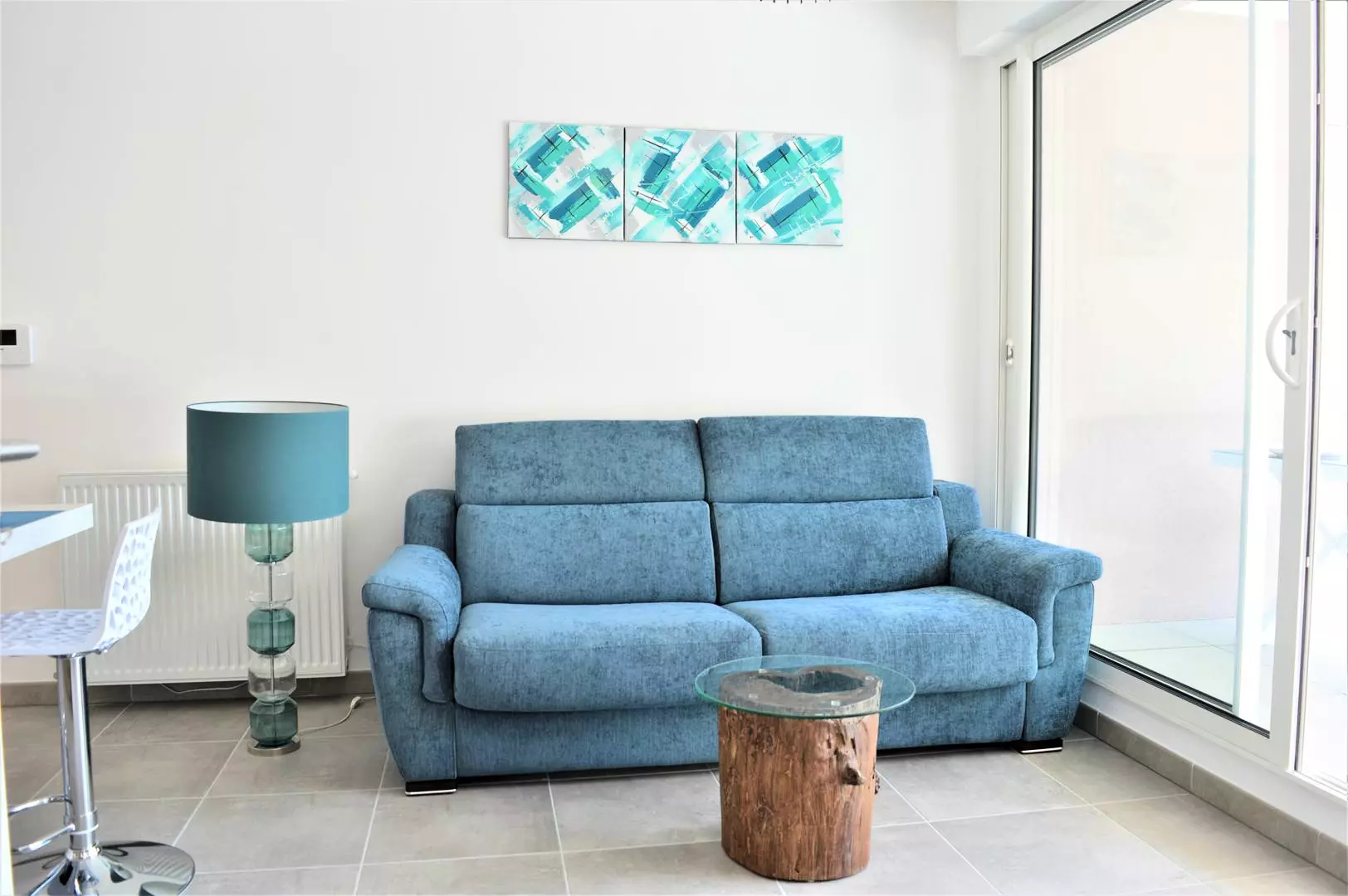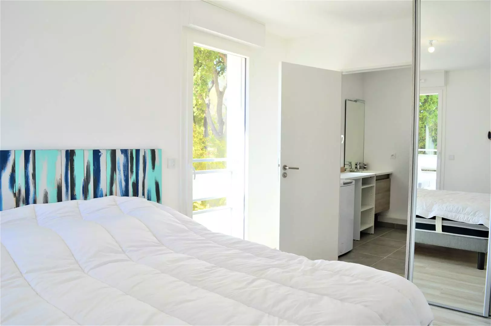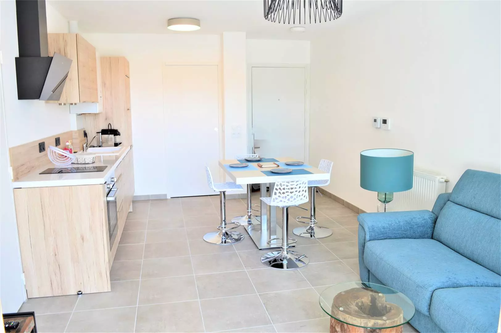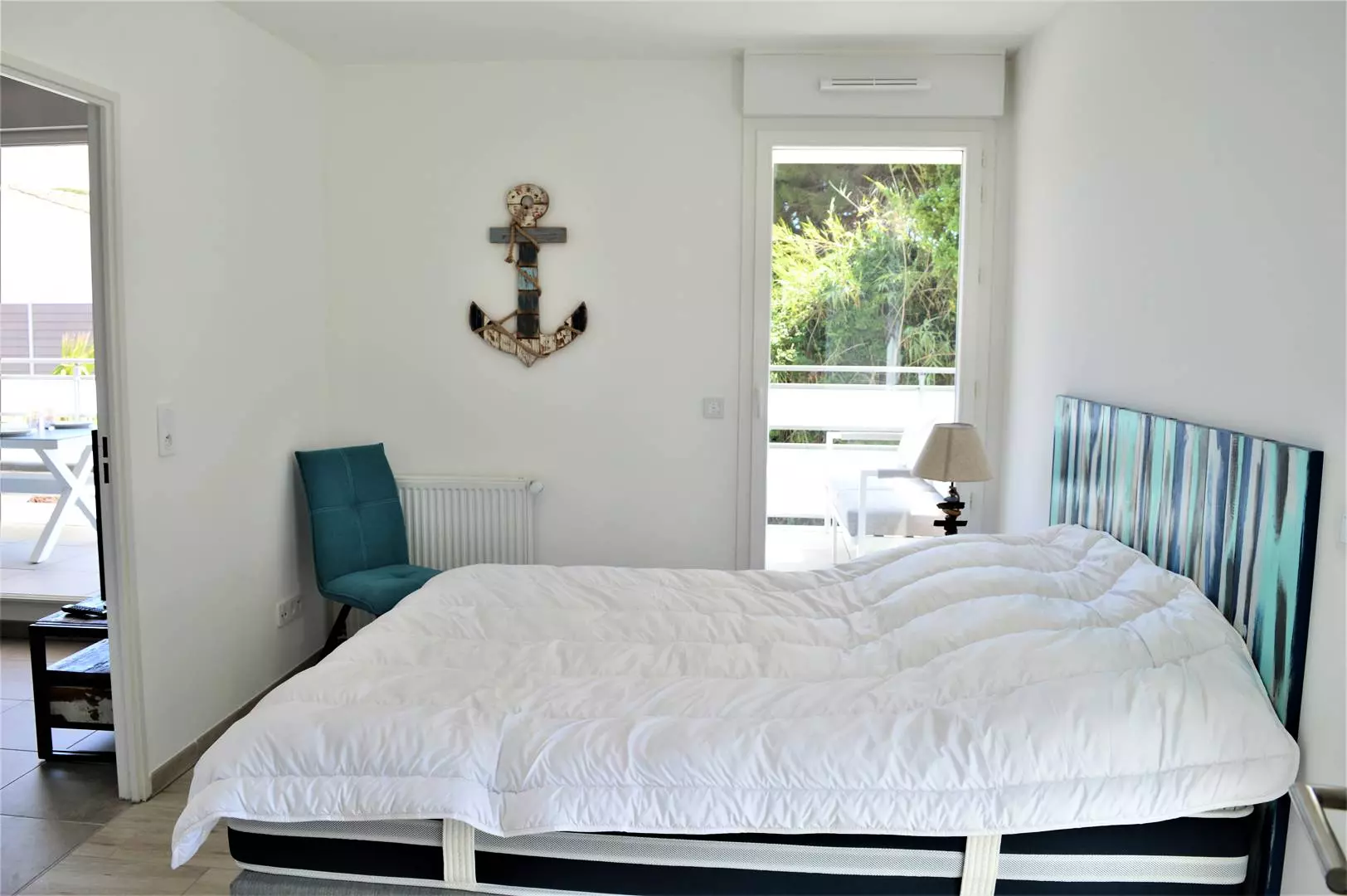 Cet appartement de vacances neuf au 1er étage avec climatisation, est composé d'un salon avec un canapé-lit deux places donnant sur une terrasse de 14 m2, d'une chambre avec un lit deux places 160x200 et sa salle d'eau avec douche à l'italienne et WC.