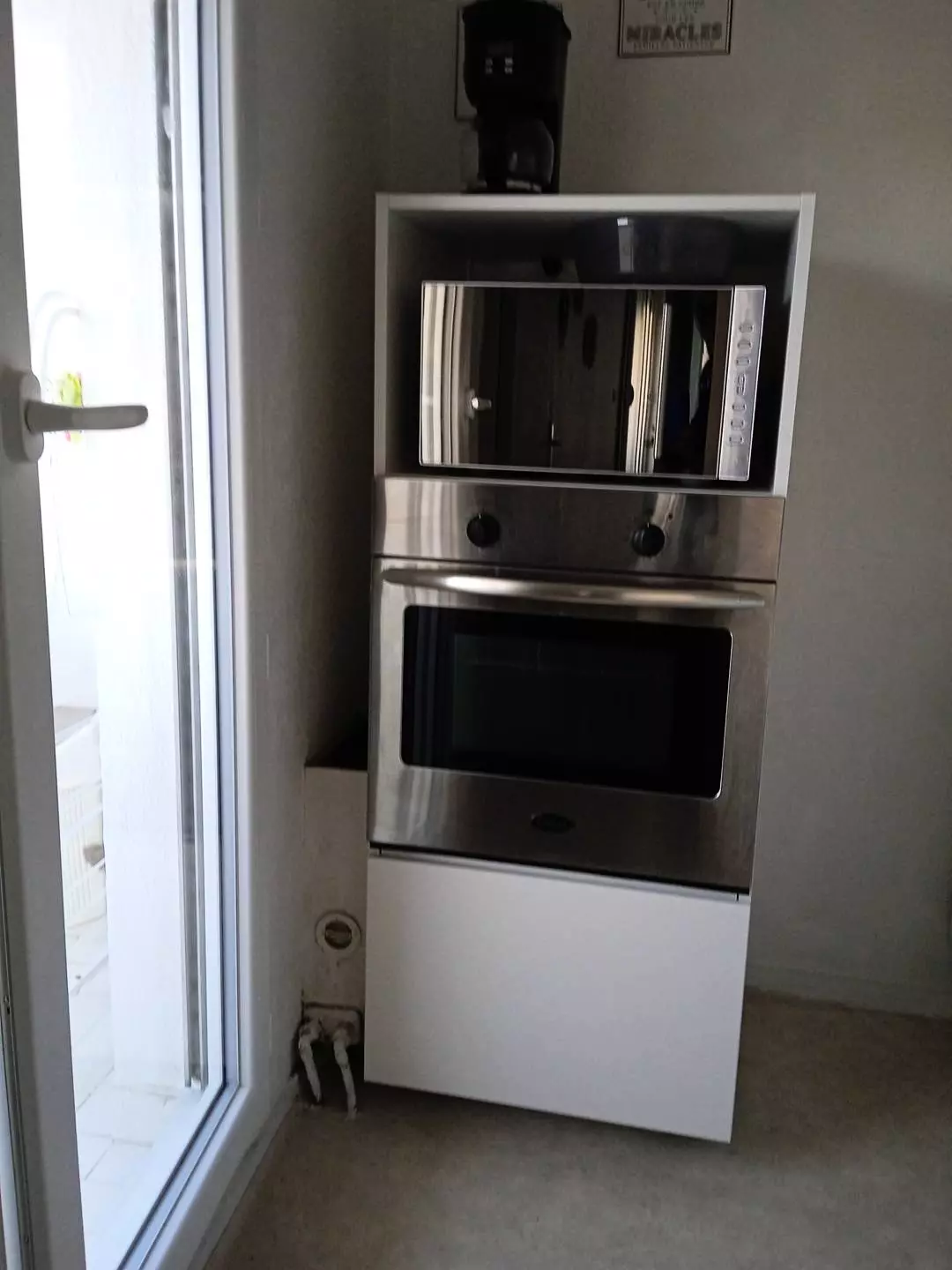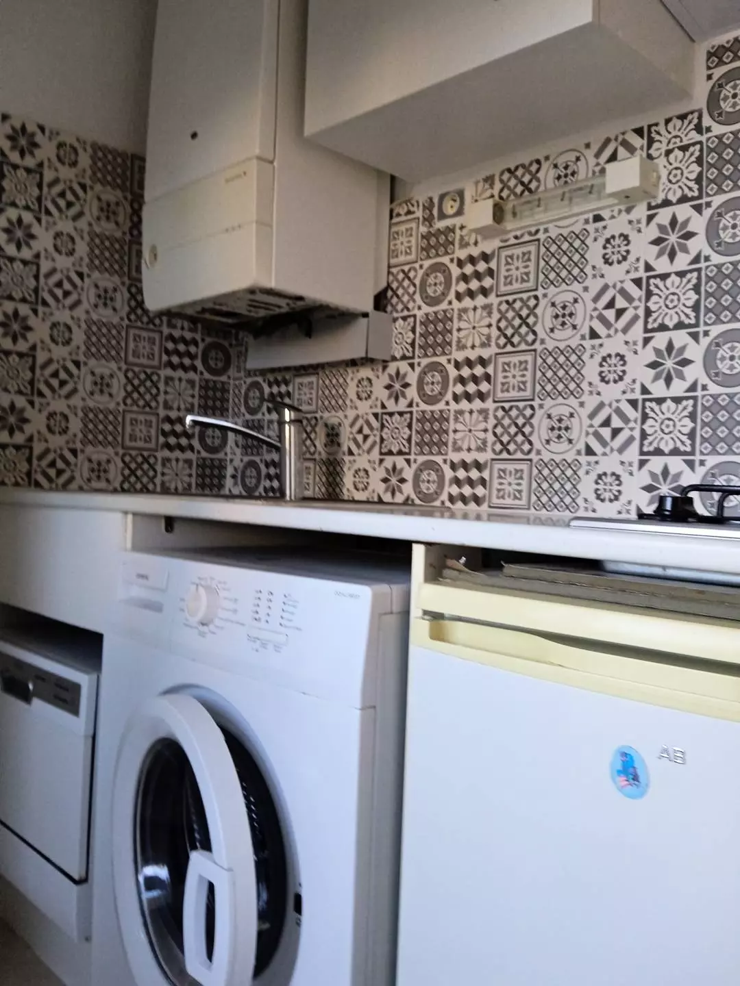 Équipements : Télévision, lave linge, frigo avec partie congélateur, four, micro onde, petit Lave-vaisselle, cafetière à filtre, plaques gaz 2 feux.