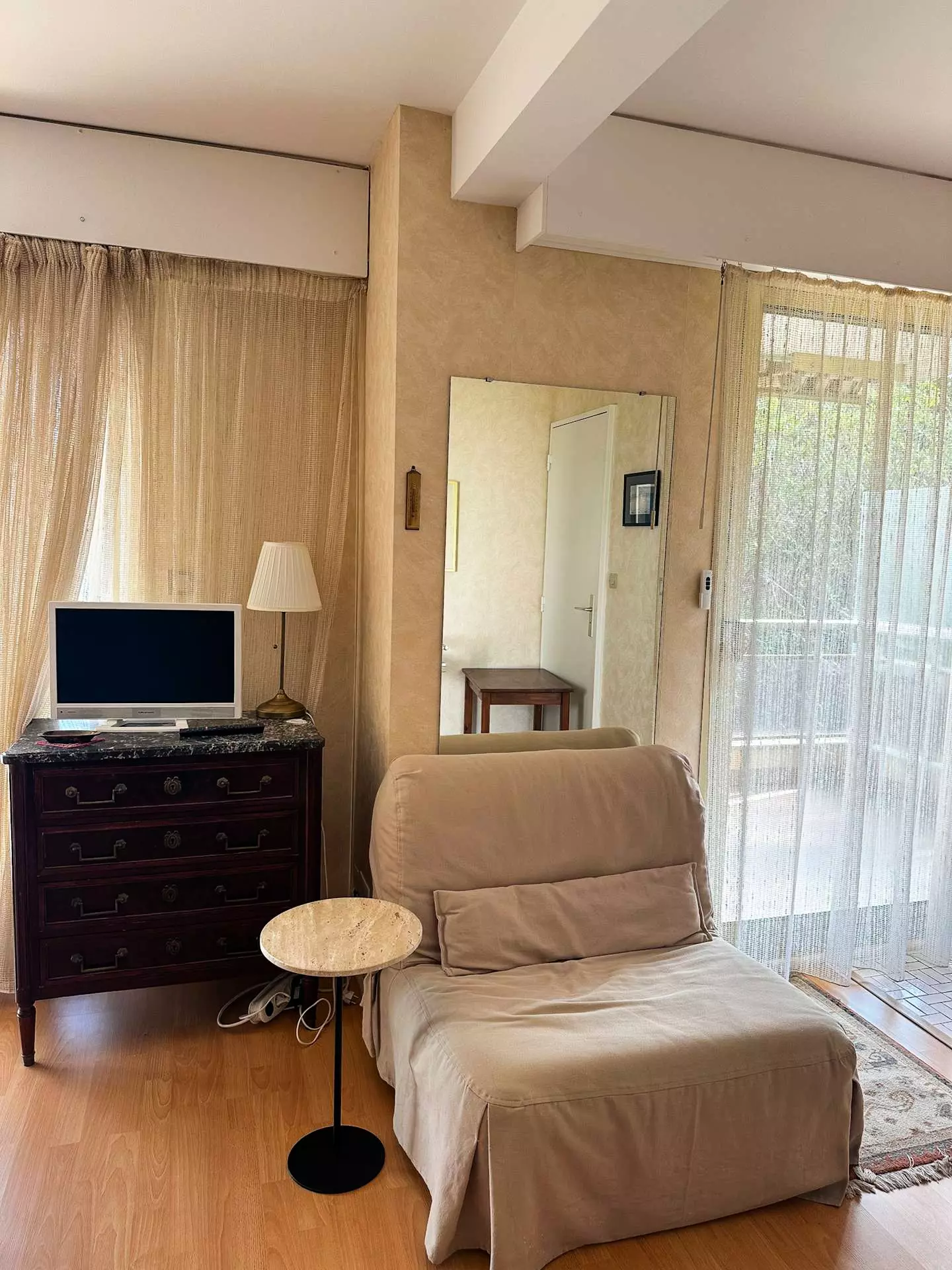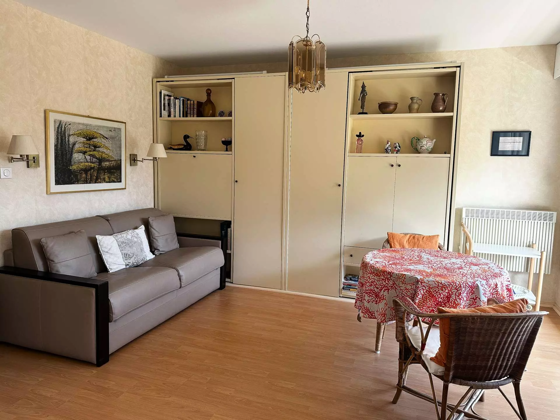 Ce charmant studio, idéalement situé, offre un cadre de vie agréable et pratique. Il se compose d'une entrée avec placard, d'un grand séjour lumineux équipé d'un canapé-lit de 140 cm et d'une télévision 46' avec accès direct à un balcon privé. Le balcon est aménagé d'un salon de jardin et de deux chaises longues, parfait pour profiter de moments de détente en extérieur.