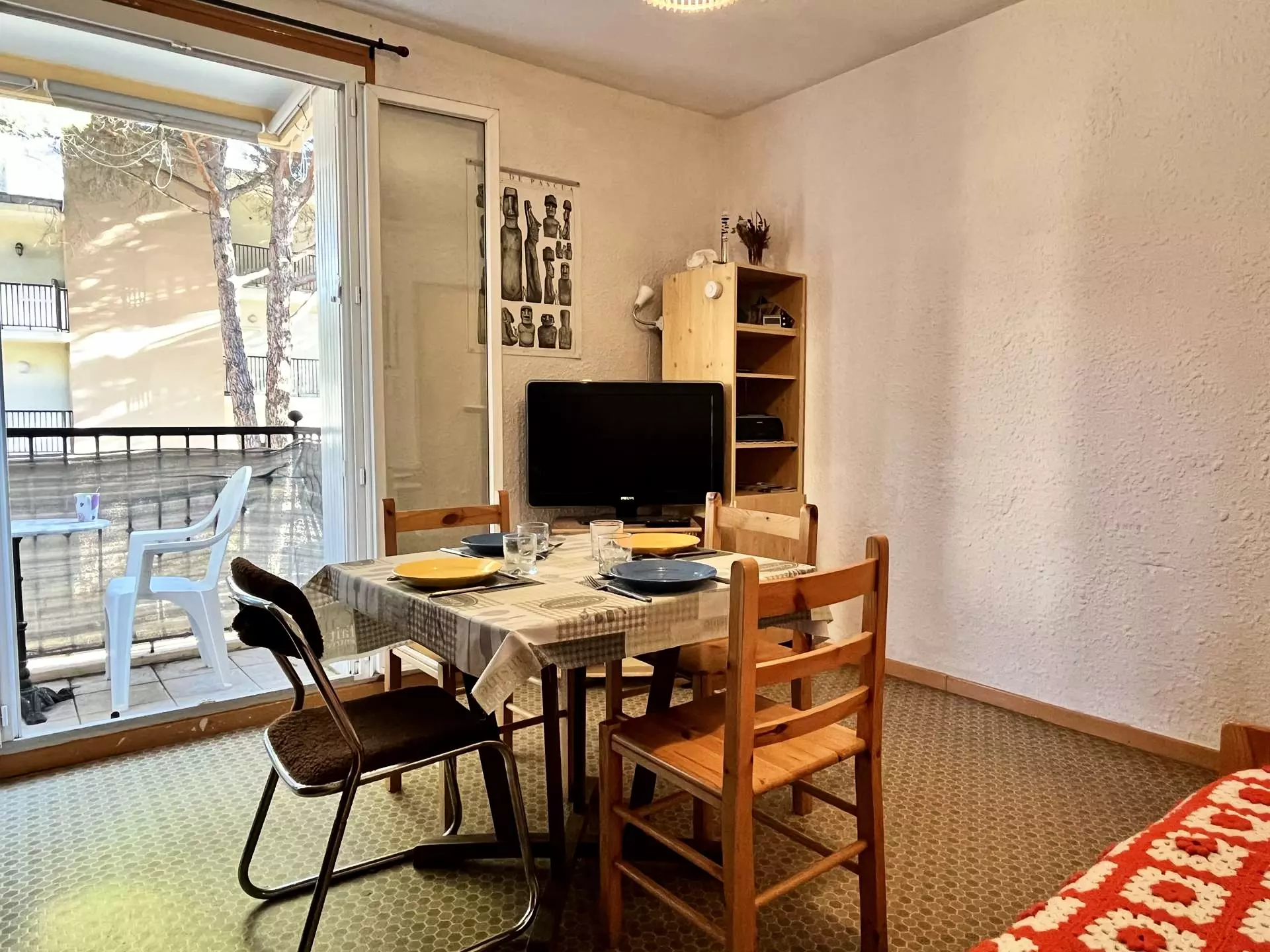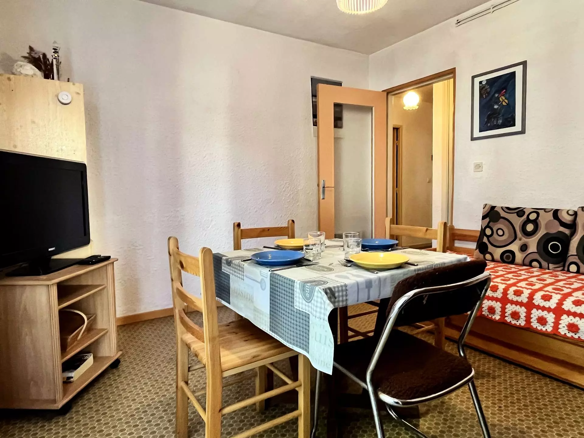 Cet appartement de vacances, situé au 1er étage, dispose d'un séjour avec canapé lit gigogne pour deux personnes et télévision, une cuisine équipée, une chambre avec un lit deux personnes, une salle d'eau avec wc et un balcon.