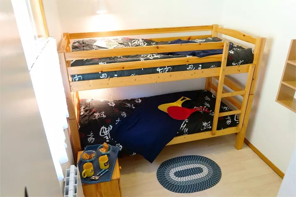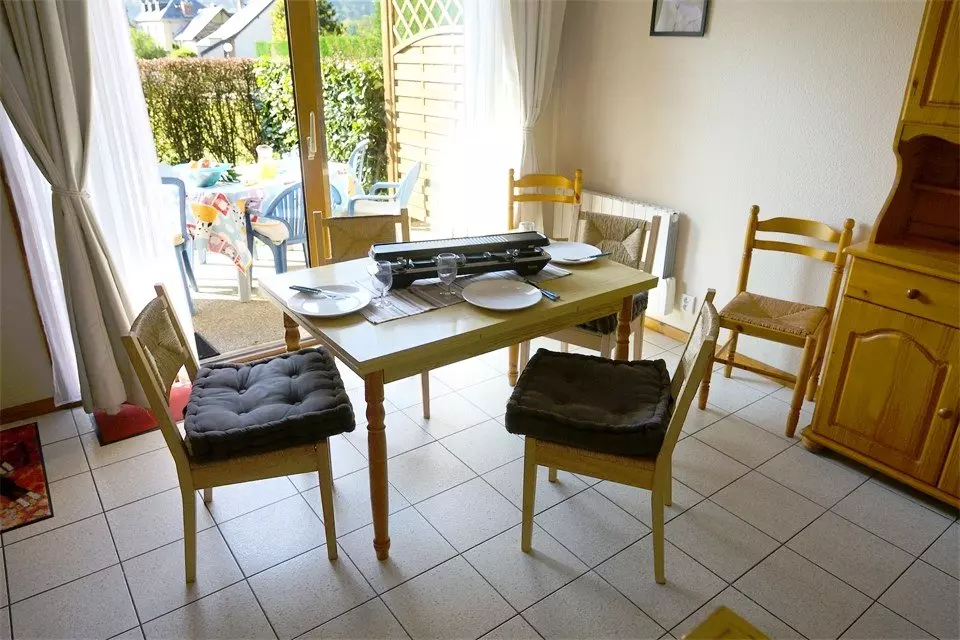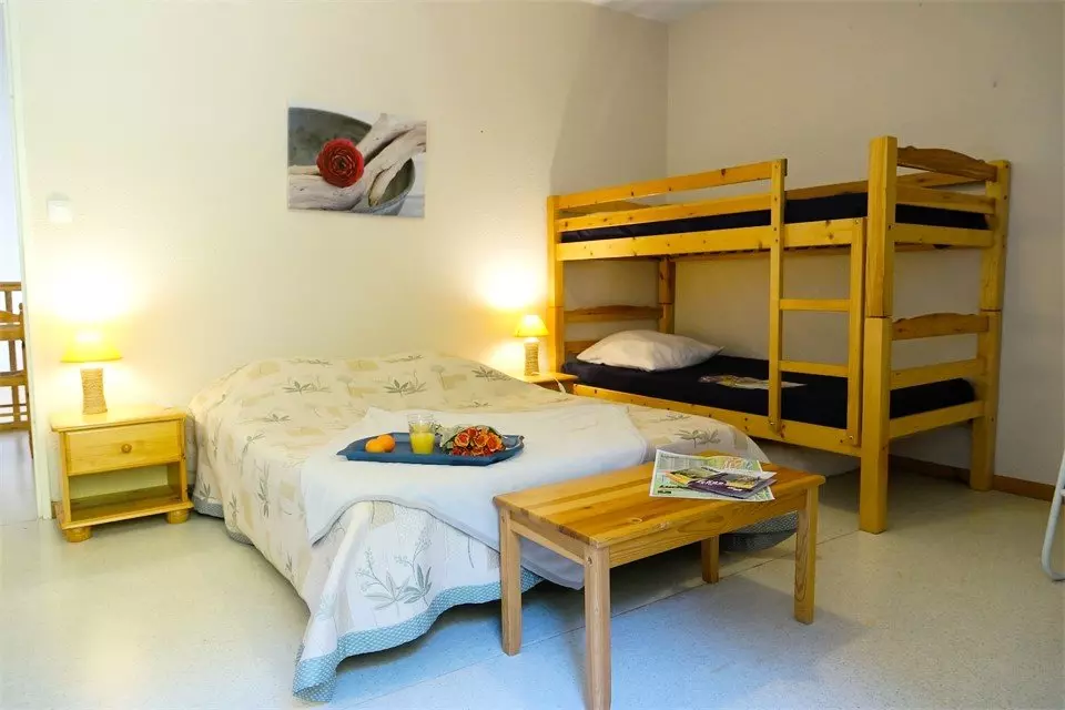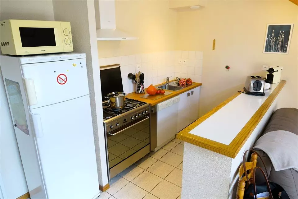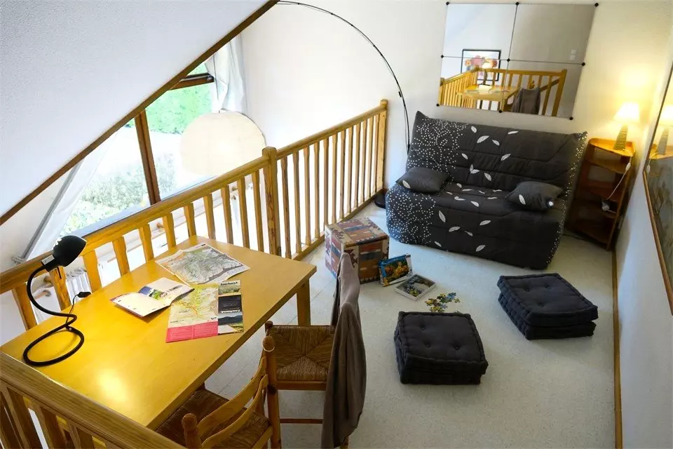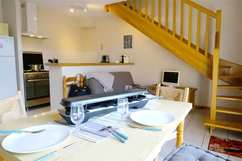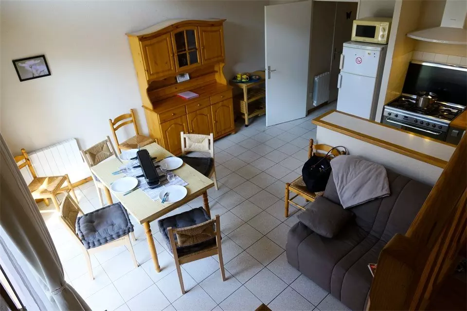 Ce logement comprend une entrée, une salle de bains. wc séparés, une chambre avec lits superposés en 80 et placard, un séjour très clair avec une grande baie vitrée, un canapé, un téléviseur, une kitchenette équipée donnant sur le séjour avec 4 feux gaz, un four chaleur tournante, micro-ondes, un lave-vaisselle, un lave-linge. a l'étage une mezzanine et une chambre avec un lit deux personnes en 140, lits superposés en 80 et un lit bébé.
