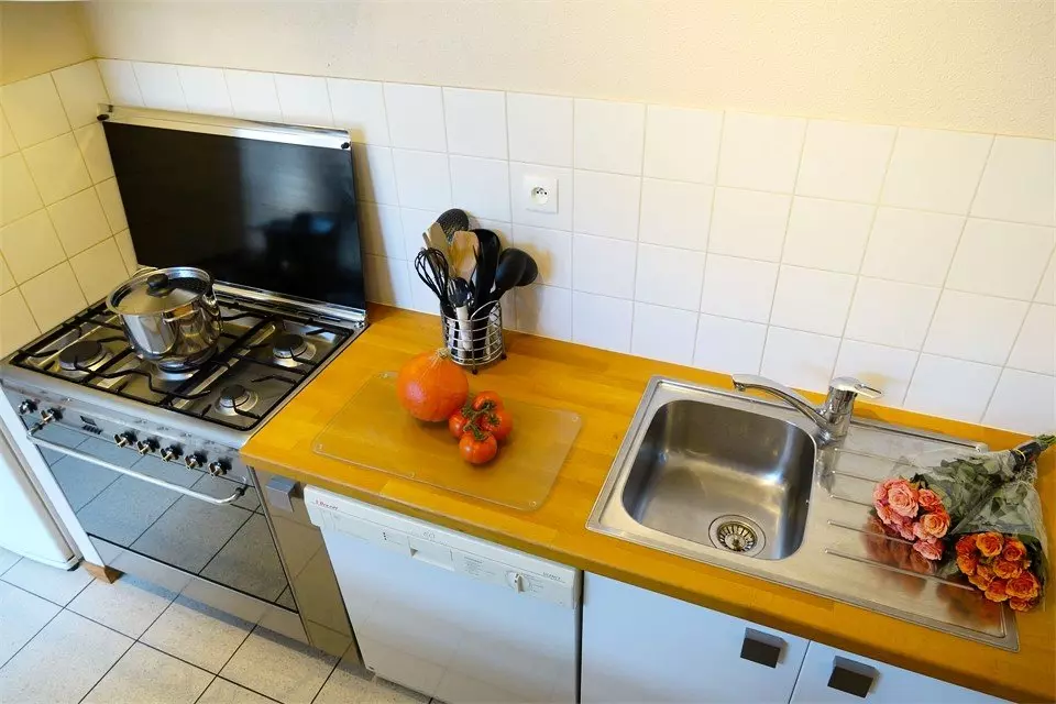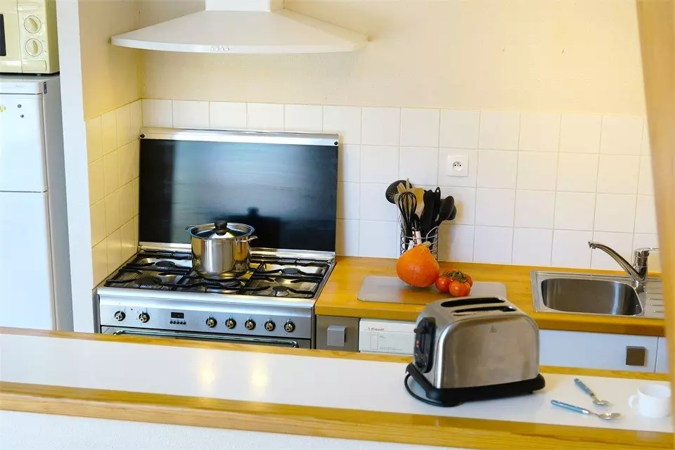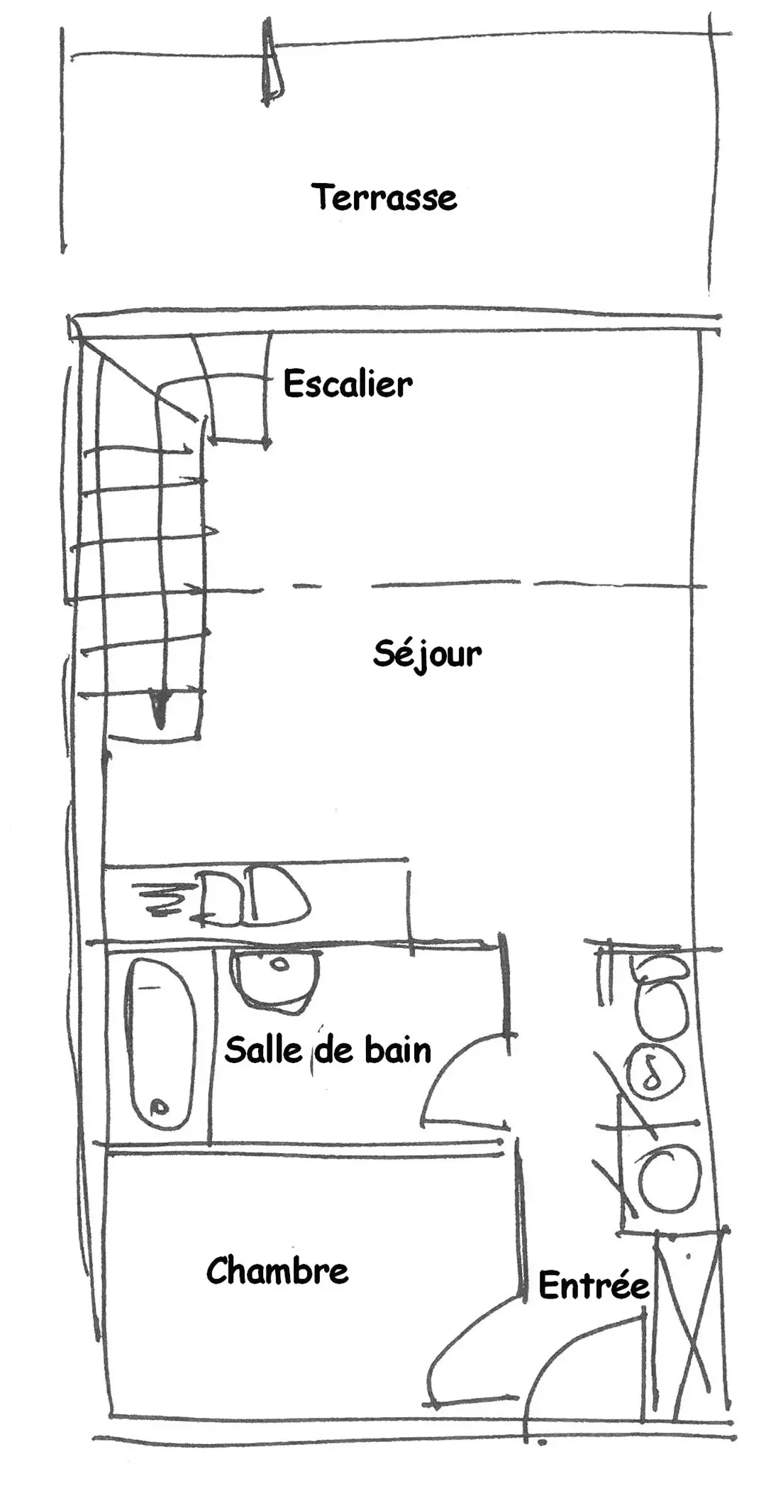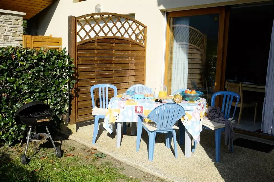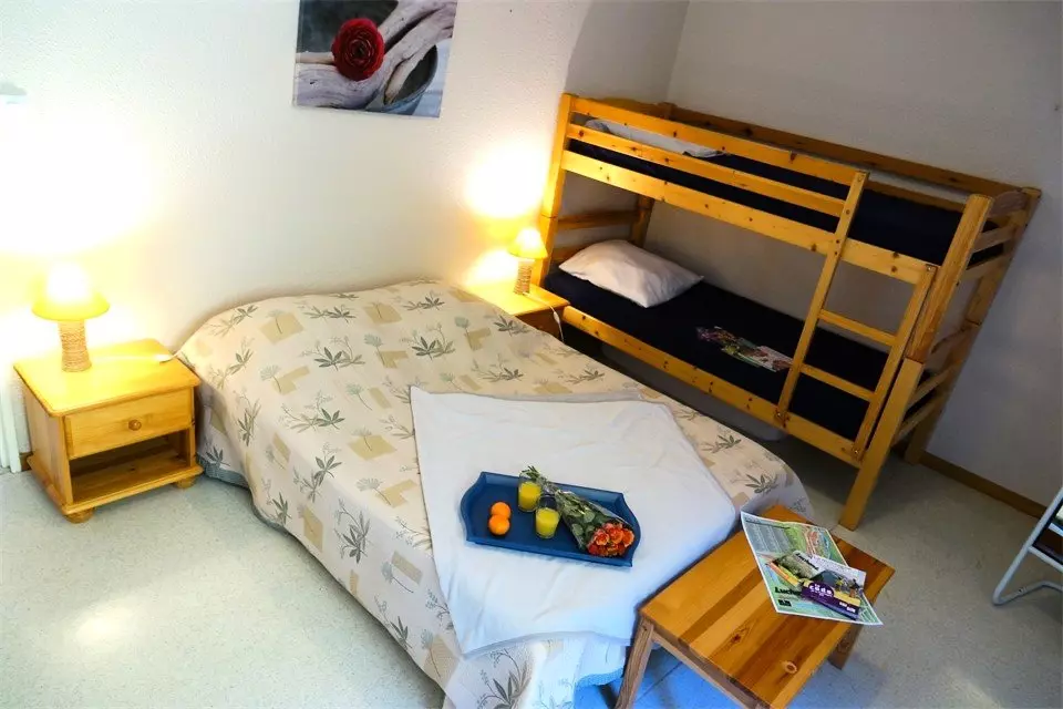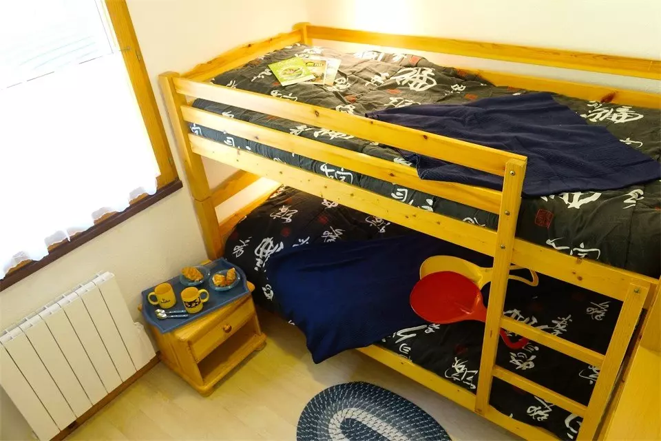 Ce logement comprend une entrée, une salle de bains. wc séparés, une chambre avec lits superposés en 80 et placard, un séjour très clair avec une grande baie vitrée, un canapé, un téléviseur, une kitchenette équipée donnant sur le séjour avec 4 feux gaz, un four chaleur tournante, micro-ondes, un lave-vaisselle, un lave-linge. a l'étage une mezzanine et une chambre avec un lit deux personnes en 140, lits superposés en 80 et un lit bébé.