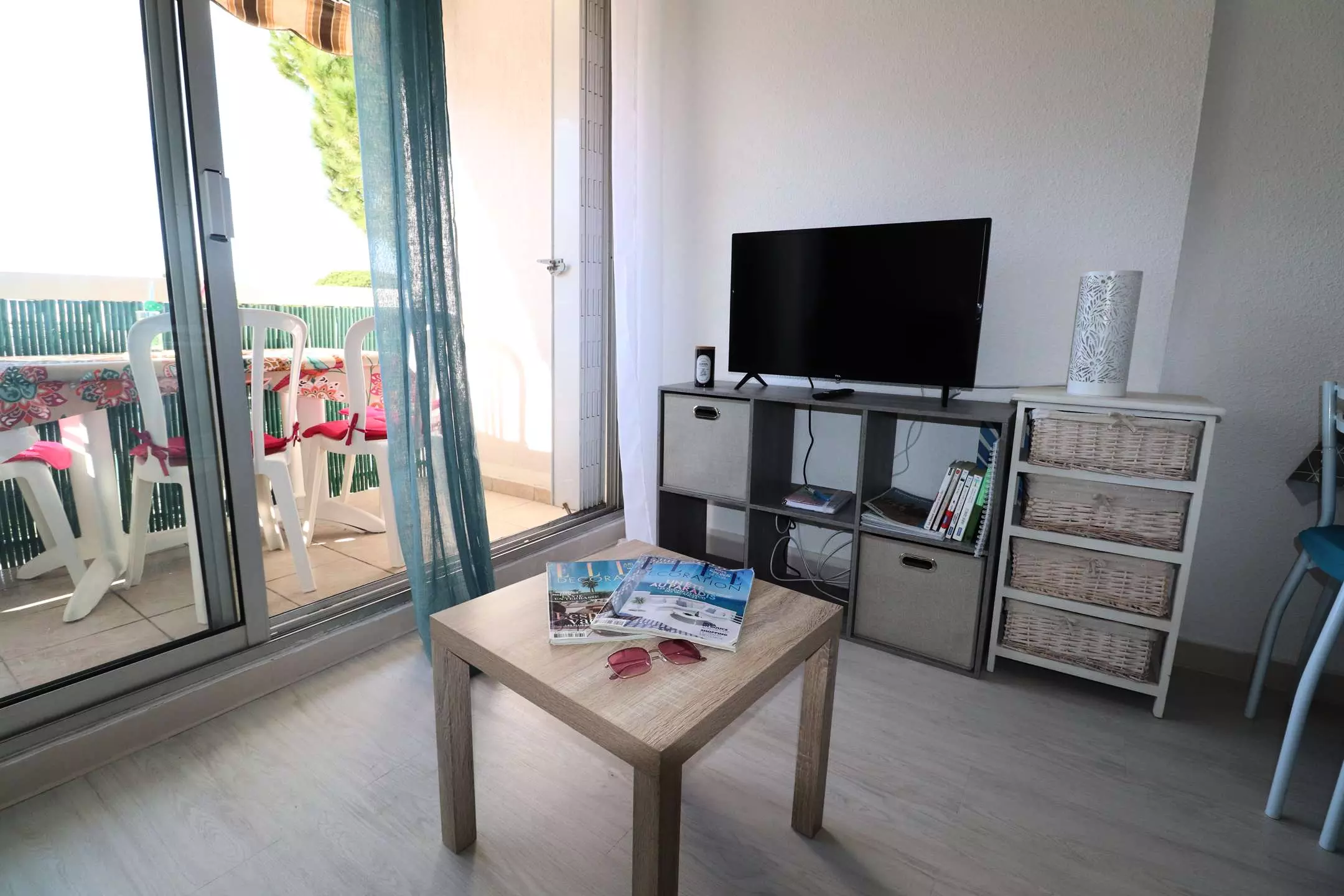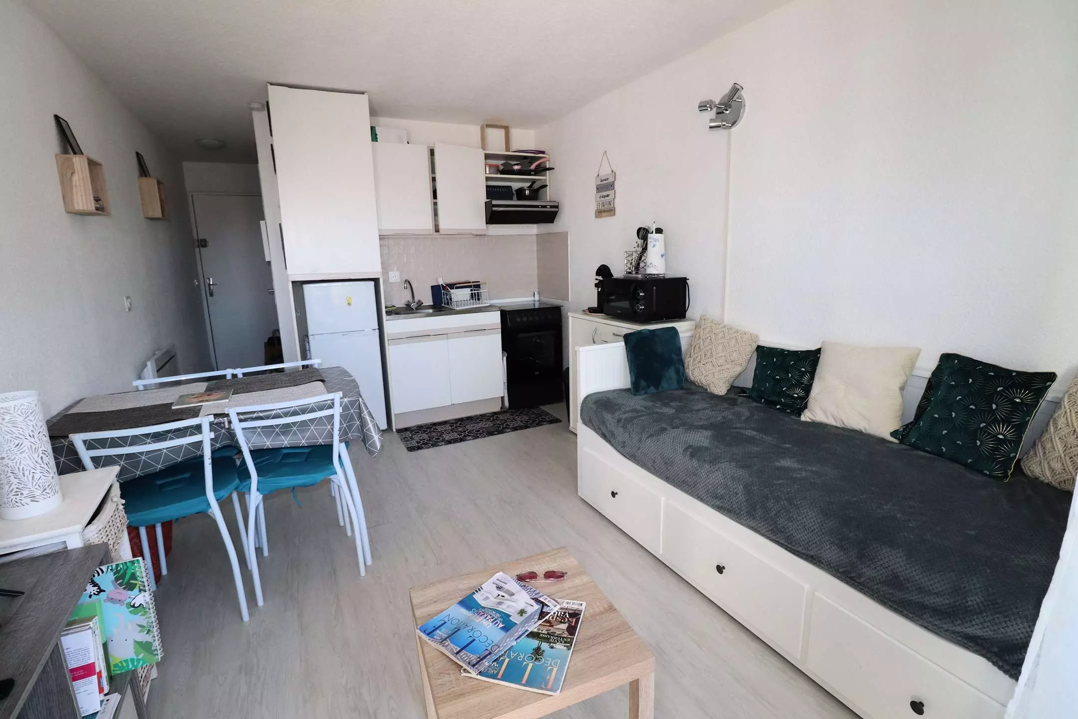 Dans le séjour, une cuisine équipée, canapé lit gigogne de 2 matelas en 80cm formant un grand couchage pour 2 personnes. Une terrasse pour profiter des repas en extérieur au soleil et du store banne pour un coin d'ombre.