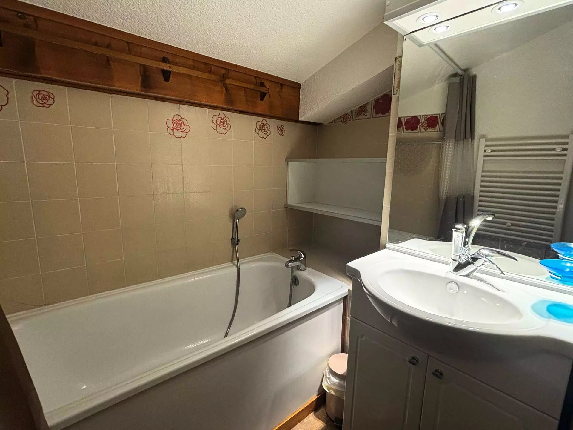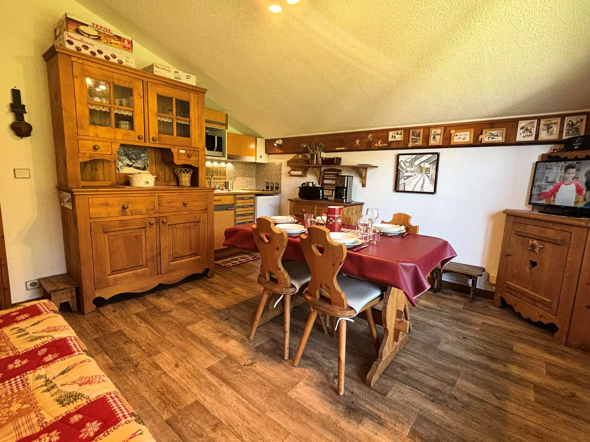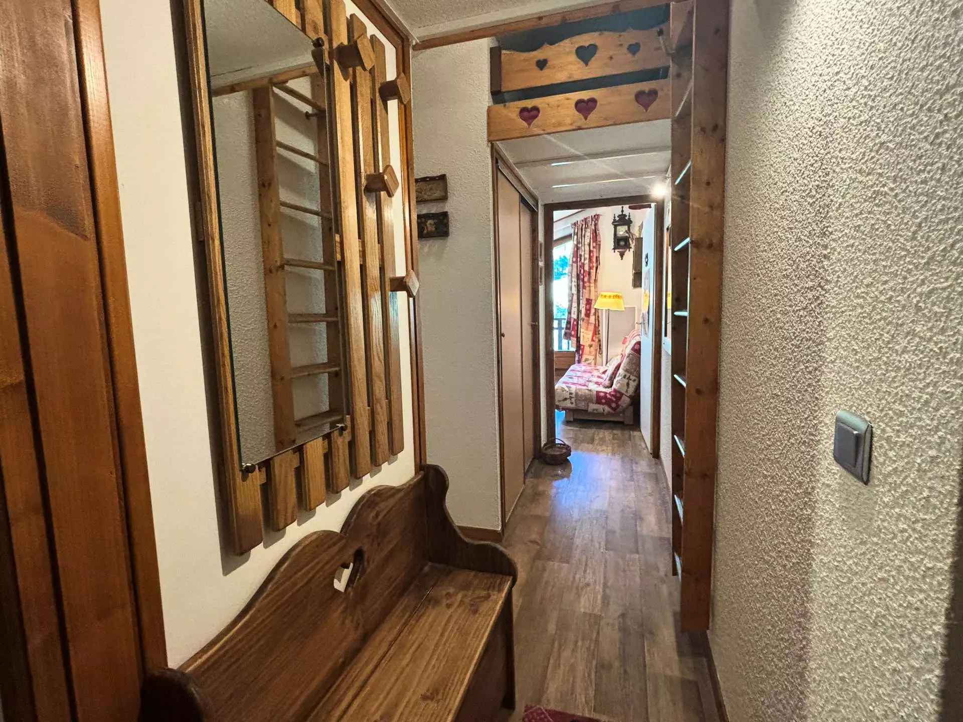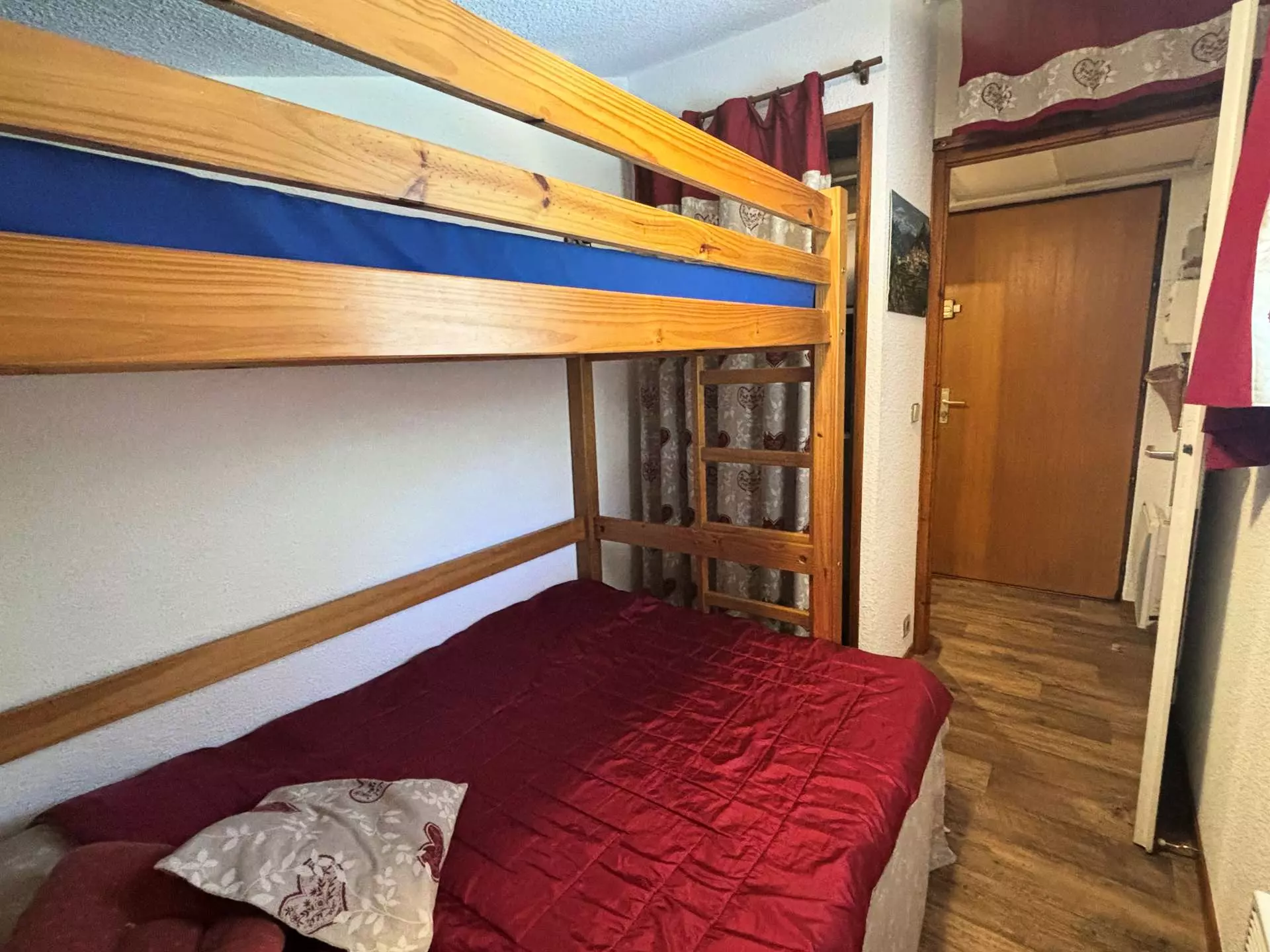 Cet appartement de vacances, situé au 1er étage de la résidence (entrée sur le même palier), comprend une entrée avec placards de rangement, un séjour avec un canapé clic-clac 2 personnes, une cuisine équipée, une cabine avec 1 lit superposé 2 couchages, une salle de bains avec baignoire et un WC indépendant.